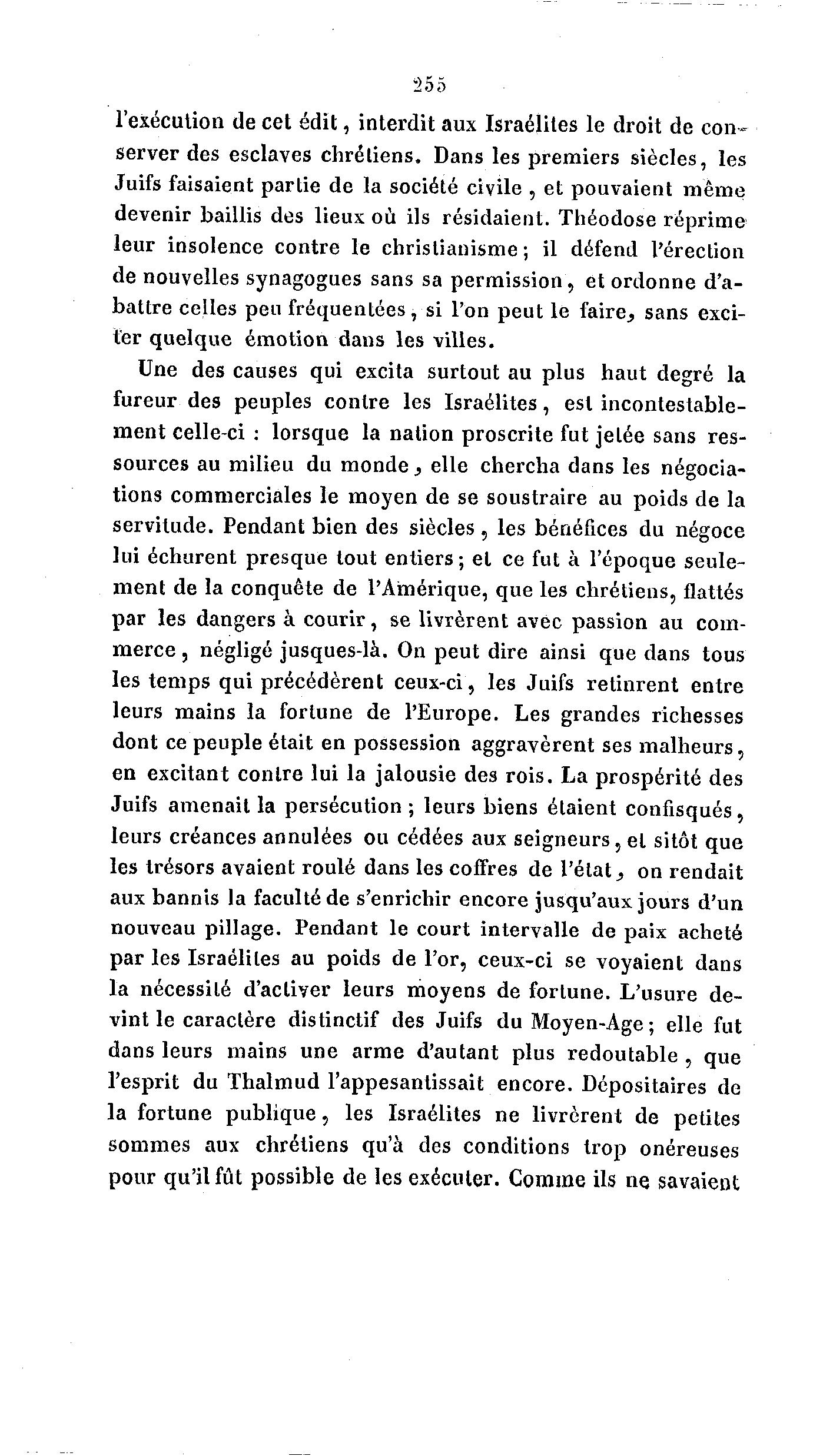 •255 l'exécution de cet é d i t , interdit aux Israélites le droit de con- server des esclaves chrétiens. Dans les premiers siècles, les Juifs faisaient partie de la société civile , et pouvaient même devenir baillis des lieux où ils résidaient. Théodose réprime leur insolence contre le christianisme ; il défend l'érection de nouvelles synagogues sans sa permission, et ordonne d'a- battre celles peu fréquentées, si l'on peut le faire, sans exci- ter quelque émotion dans les villes. Une des causes qui excita surtout au plus haut degré la fureur des peuples contre les Israélites, est incontestable- ment celle-ci : lorsque la nation proscrite fut jetée sans res- sources au milieu du m o n d e , elle chercha dans les négocia- tions commerciales le moyen de se soustraire au poids de la servitude. Pendant bien des siècles, les bénéfices du négoce lui échurent presque tout entiers; et ce fut à l'époque seule- ment de la conquête de l'Amérique, que les chrétiens, flattés par les dangers à courir, se livrèrent avec passion au com- merce , négligé jusques-là . On peut dire ainsi que dans tous les temps qui précédèrent ceux-ci, les Juifs retinrent entre leurs mains la fortune de l'Europe. Les grandes richesses dont ce peuple était en possession aggravèrent ses m a l h e u r s , en excitant contre lui la jalousie des rois. La prospérité des Juifs amenait la persécution ; leurs biens étaient confisqués, leurs créances annulées ou cédées aux seigneurs, et sitôt que les trésors avaient roulé dans les coffres de l'état, on rendait aux bannis la faculté de s'enrichir encore jusqu'aux jours d'un nouveau pillage. Pendant le court intervalle de paix acheté par les Israélites au poids de l'or, ceux-ci se voyaient dans la nécessité d'activer leurs moyens de fortune. L'usure de- vint le caractère distinctif des Juifs du Moyen-Age; elle fut dans leurs mains une arme d'autant plus redoutable , que l'esprit du Thalmud l'appesantissait encore. Dépositaires de la fortune p u b l i q u e , les Israélites ne livrèrent de petites sommes aux chrétiens qu'à des conditions trop onéreuses pour qu'il fût possible de les exécuter. Comme ils ne savaient