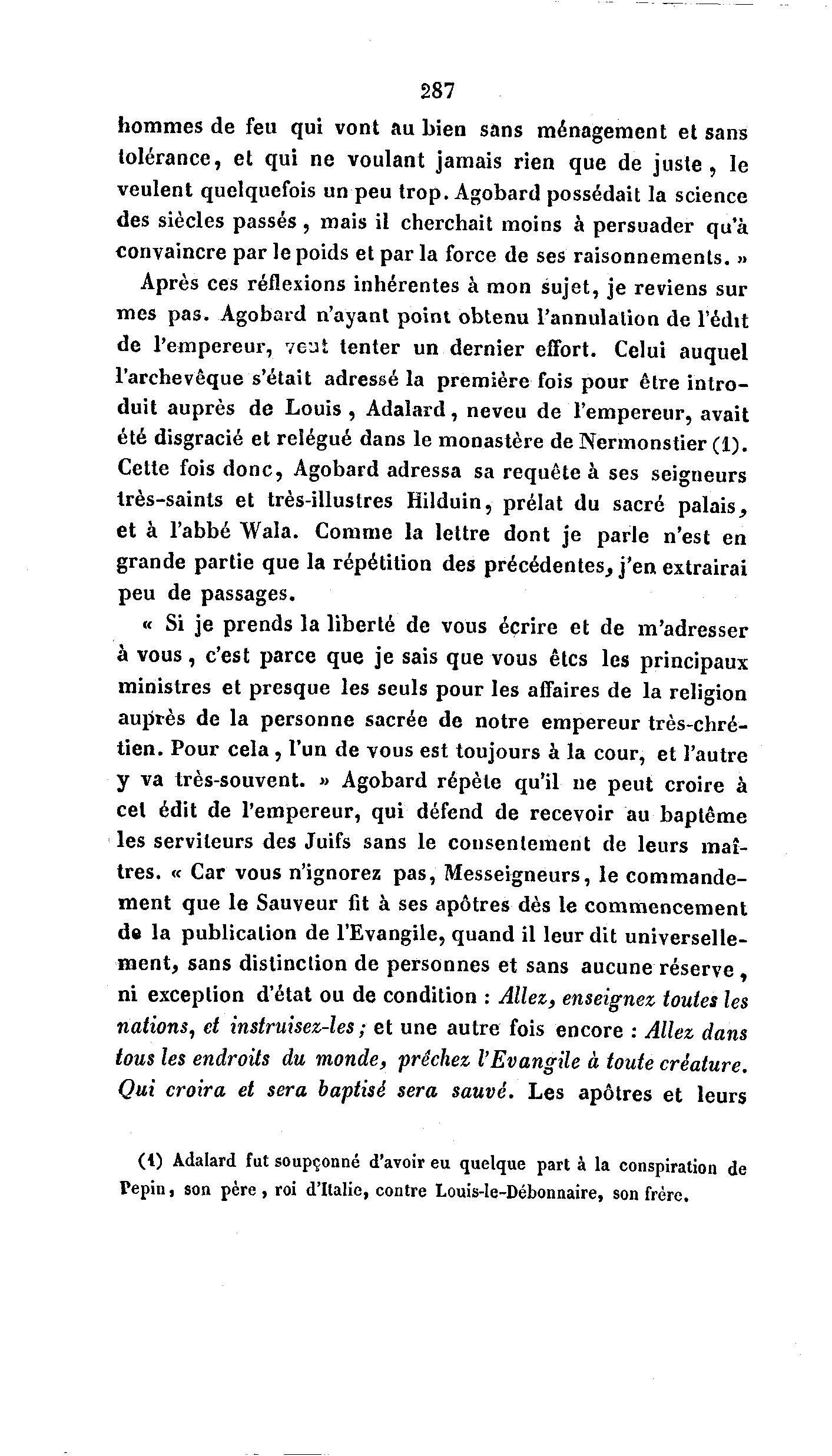 287 hommes de feu qui vont au bien sans ménagement et sans tolérance, et qui ne voulant jamais rien que de j u s t e , le veulent quelquefois un peu trop. Agobard possédait la science des siècles passés , mais il cherchait moins à persuader qu'à convaincre par le poids et par la force de ses raisonnements. » Après ces réflexions inhérentes à mon sujet, je reviens sur mes pas. Agobard n'ayant point obtenu l'annulation de l'édit de l'empereur, veut tenter un dernier effort. Celui auquel l'archevêque s'était adressé la première fois pour être i n t r o - duit auprès de Louis , Adalard, neveu de l'empereur, avait été disgracié et relégué dans le monastère de Nermonstier (1). Cette fois d o n c , Agobard adressa sa requête à ses seigneurs très-saints et très-illustres Hilduin, prélat du sacré palais, et à l'abbé Wala. Comme la lettre dont je parle n'est en grande partie que la répétition des précédentes, j ' e n extrairai peu de passages. « Si je prends la liberté de vous écrire et de m'adresser à v o u s , c'est parce que je sais que vous êtes les principaux ministres et presque les seuls pour les affaires de la religion auprès de la personne sacrée de notre empereur très-chré- tien. Pour c e l a , l'un de vous est toujours à la cour, et l'autre y va très-souvent. » Agobard répète qu'il ne peut croire à cet édit de l'empereur, qui défend de recevoir au baptême les serviteurs des Juifs sans le consentement de leurs maî- tres. « Car vous n'ignorez pas, Messeigneurs, le commande- ment que le Sauveur fit à ses apôtres dès le commencement de la publication de l'Evangile, quand il leur dit universelle- m e n t , sans distinction de personnes et sans aucune r é s e r v e , ni exception d'état ou de condition : Allez, enseignez toutes les nations, et instruisez-les; et une autre fois encore : Allez dans tous les endroits du monde, prêchez l'Evangile à toute créature. Qui croira et sera baptisé sera sauvé. Les apôtres et leurs (t) Adalard fut soupçonné d'avoir eu quelque part à la conspiration de Pépin ) son père , roi d'Italie, contre Louis-Ie-Débonnaire, son frère.