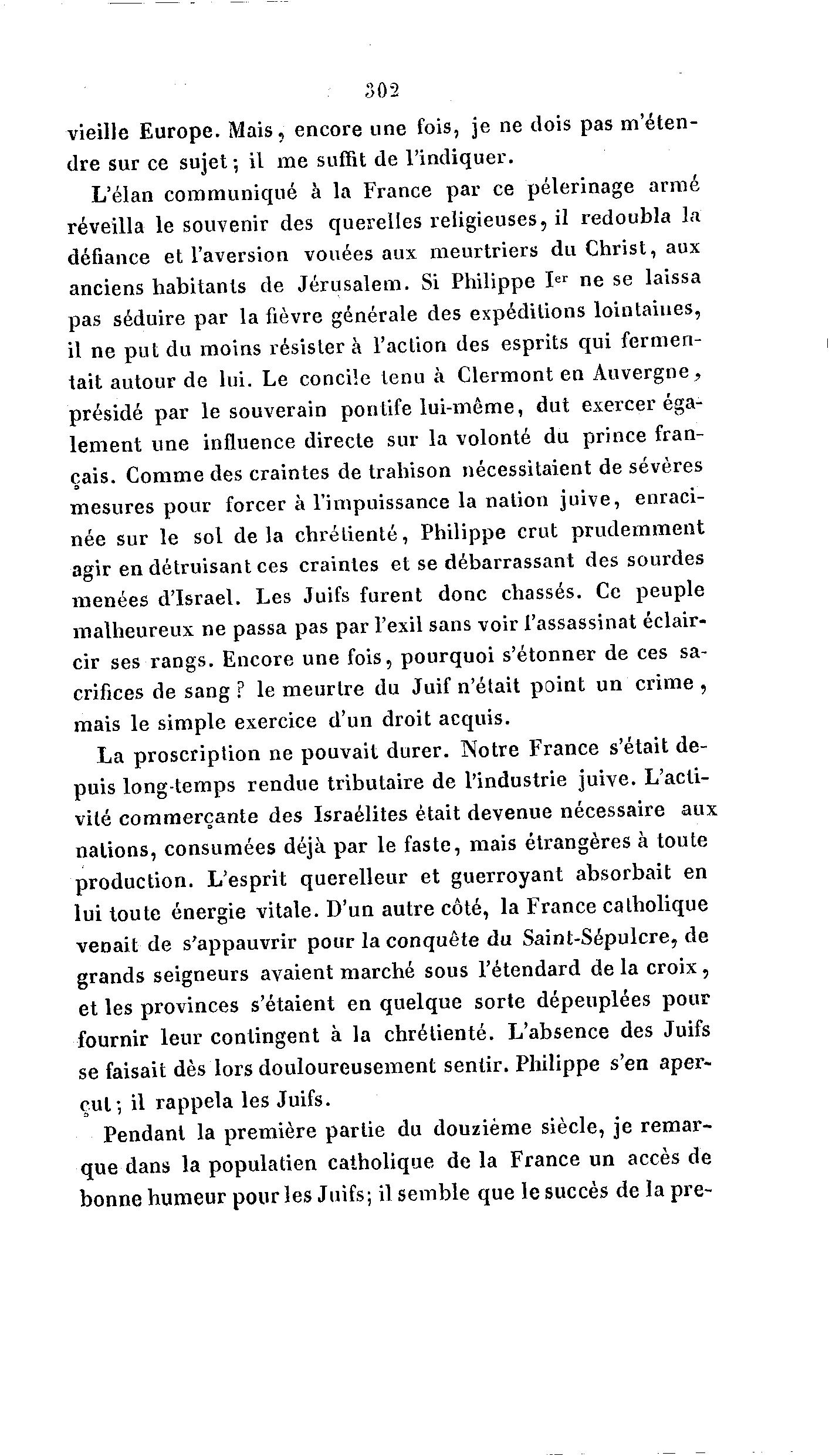 302 vieille Europe. Mais, encore une fois, je ne dois pas m'éten- dre sur ce sujet; il me suffit de l'indiquer. L'élan communiqué à la France par ce pèlerinage armé réveilla le souvenir des querelles religieuses, il redoubla la défiance et l'aversion vouées aux meurtriers du Christ, aux anciens habitants de Jérusalem. Si Philippe I er ne se laissa pas séduire par la fièvre générale des expéditions lointaines, il ne put du moins résister à l'action des esprits qui fermen- tait autour de lui. Le concile tenu à Clermont en Auvergne, présidé par le souverain pontife lui-même, dut exercer éga- lement une influence directe sur la volonté du prince fran- çais. Comme des craintes de trahison nécessitaient de sévères mesures pour forcer à l'impuissance la nation juive, enraci- née sur le sol d e l à chrétienté, Philippe crut p r u d e m m e n t agir en détruisant ces craintes et se débarrassant des sourdes menées d'Israël. Les Juifs furent donc chassés. Ce peuple malheureux ne passa pas par l'exil sans voir l'assassinat éclair- cir ses rangs. Encore une fois, pourquoi s'étonner de ces sa- crifices de sang ? le meurtre du Juif n'était point un crime , mais le simple exercice d'un droit acquis. La proscription ne pouvait durer. Notre France s'était de- puis long-temps rendue tributaire de l'industrie juive. L'acti- vité commerçante des Israélites était devenue nécessaire aux nations, consumées déjà par le faste, mais étrangères à toute production. L'esprit querelleur et guerroyant absorbait en lui toute énergie vitale. D'un autre côté, la France catholique veoait de s'appauvrir pour la conquête du Saint-Sépulcre, de grands seigneurs avaient marché sous l'étendard de la croix, et les provinces s'étaient en quelque sorte dépeuplées pour fournir leur contingent à la chrétienté. L'absence des Juifs se faisait dès lors douloureusement sentir. Philippe s'en aper- çut; il rappela les Juifs. Pendant la première partie du douzième siècle, je remar- que dans la populatien catholique de la France un accès de bonne humeur pour les Juifs; il semble que le succès d e l a p r e -