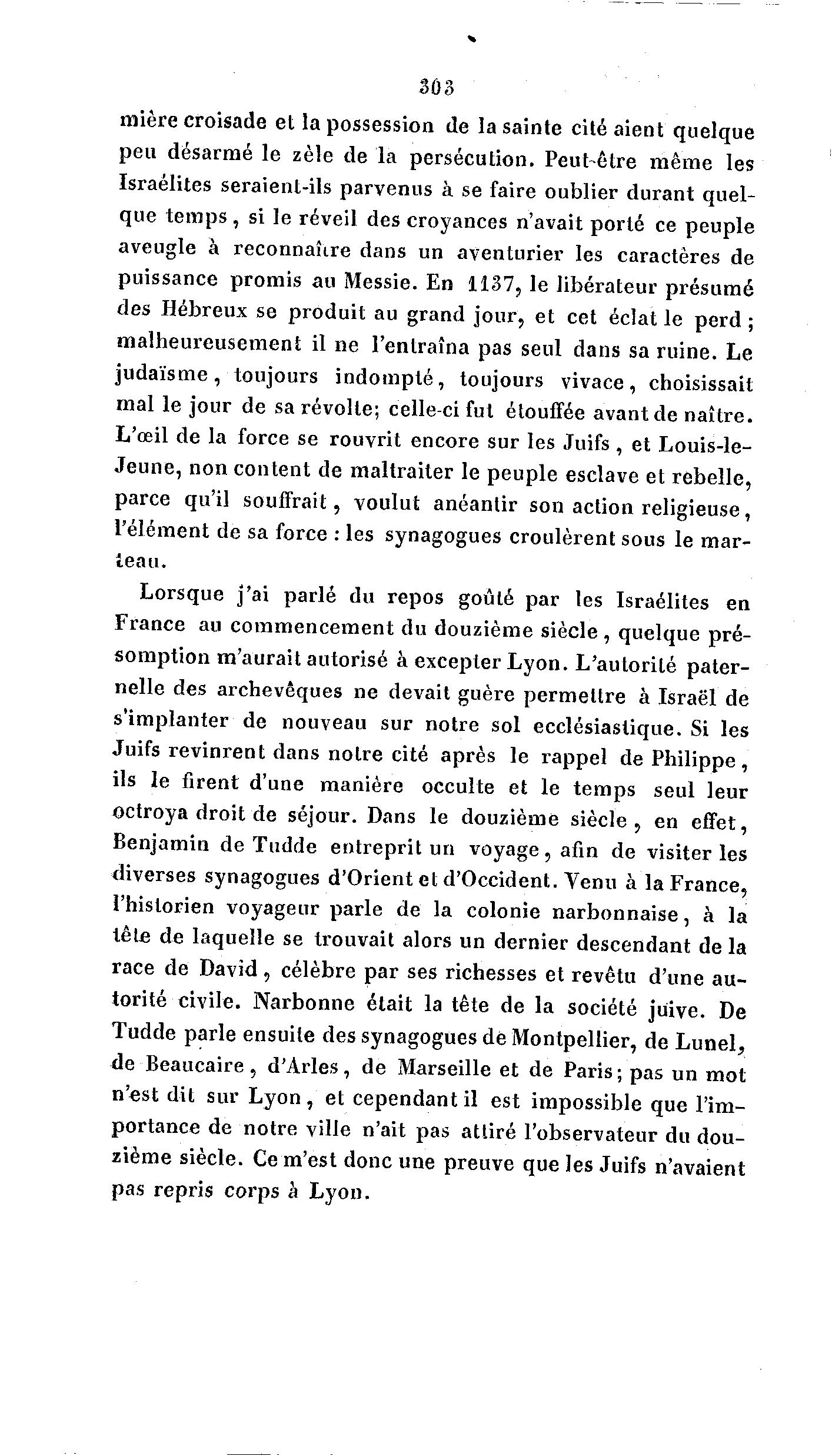 303 mière croisade et la possession de la sainte cité aient quelque peu désarmé le zèle de la persécution. Peut-être m ê m e les Israélites seraient-ils parvenus à se faire oublier durant quel- que temps , si le réveil des croyances n'avait porté ce peuple aveugle à reconnaître dans un aventurier les caractères de puissance promis au Messie. En 1137, le libérateur présumé des Hébreux se produit au grand jour, et cet éclat le perd ; malheureusement il ne l'entraîna pas seul dans sa ruine. Le j u d a ï s m e , toujours i n d o m p t é , toujours vivace, choisissait mal le jour de sa révolte; celle-ci fut étouffée avant de naître. L'œil de la force se rouvrit encore sur les Juifs , et Louis-le- Jeune, non content de maltraiter le peuple esclave et rebelle, parce qu'il souffrait, voulut anéantir son action religieuse, l'élément de sa force : les synagogues croulèrent sous le mar- teau. Lorsque j'ai parlé du repos goûté par les Israélites en France au commencement du douzième siècle , quelque pré- somption m'aurait autorisé à excepter Lyon. L'autorité pater- nelle des archevêques ne devait guère permettre à Israël de s'implanter de nouveau sur notre sol ecclésiastique. Si les Juifs revinrent dans notre cité après le rappel de Philippe, ils le firent d'une manière occulte et le temps seul leur octroya droit de séjour. Dans le douzième s i è c l e , en effet, Benjamin de Tudde entreprit un voyage, afin de visiter les diverses synagogues d'Orient et d'Occident. Venu à la France, l'historien voyageur parle de la colonie narbonnaise, à la tête de laquelle se trouvait alors un dernier descendant de la race de David, célèbre par ses richesses et revêtu d'une a u - torité civile. Narbonne était la tête de la société juive. De Tudde parle ensuite des synagogues dé Montpellier, de L u n e l , de Beaucaire, d'Arles, de Marseille et de Paris ; pas un mot n'est dit sur L y o n , et cependant il est impossible que l'im- portance de notre ville n'ait pas attiré l'observateur du dou- zième siècle. Ce m'est donc une preuve que les Juifs n'avaient pas repris corps à Lyon.