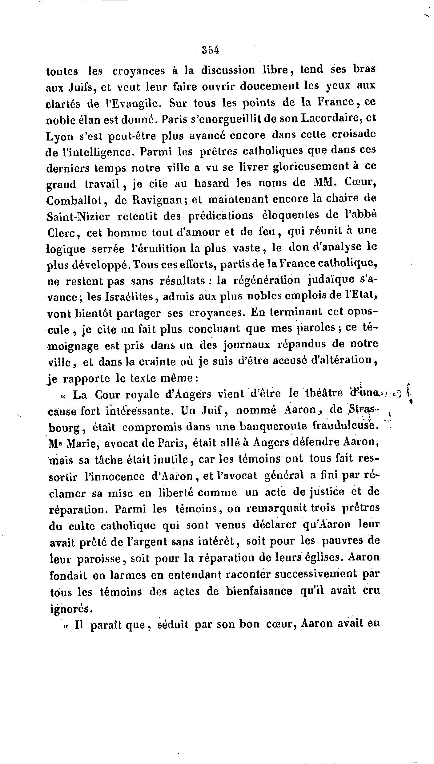 S54 toutes les croyances à la discussion libre, tend ses bras aux Juifs, et veut leur faire ouvrir doucement les yeux aux clartés de l'Evangile. Sur tous les points de la France, ce noble élan est donné. Paris s'enorgueillit de son Lacordaire, et Lyon s'est peut-être plus avancé encore dans celte croisade de l'intelligence. Parmi les prêtres catholiques que dans ces derniers temps notre ville a vu se livrer glorieusement à ce grand travail, je cite au hasard les noms de MM. Cœur, Comballot, de Ravignan; et maintenant encore la chaire de Saint-Nizier retentit des prédications éloquentes de l'abbé Clerc, cet homme tout d'amour et de feu, qui réunit à une logique serrée l'érudition la plus vaste, le don d'analyse le plus développé. Tous ces efforts, partis de la France catholique, ne restent pas sans résultats : la régénération judaïque s'a- vance ; les Israélites, admis aux plus nobles emplois de l'Etat, vont bientôt partager ses croyances. En terminant cet opus- cule , je cite un fait plus concluant que mes paroles ; ce té- moignage est pris dans un des journaux répandus de notre ville, et dans la crainte où je suis d'être accusé d'altération, je rapporte le texte même : « La Cour royale d'Angers vient d'être le théâtre ffiinaL" ,.";(; cause fort intéressante. Un Juif, nommé Aaron , de .Str^s- ( bourg, était compromis dans une banqueroute frauduleuse. '"! Me Marie, avocat de Paris, était allé à Angers défendre Aaron, mais sa tâche était inutile, car les témoins ont tous fait res- sortir l'innocence d'Aaron, et l'avocat général a fini par ré- clamer sa mise en liberté comme un acte de justice et de réparation. Parmi les témoins, on remarquait trois prêtres du culte catholique qui sont venus déclarer qu'Aaron leur avait prêté de l'argent sans intérêt, soit pour les pauvres de leur paroisse, soit pour la réparation de leurs églises. Aaron fondait en larmes en entendant raconter successivement par tous les témoins des actes de bienfaisance qu'il avait cru ignorés. « Il paraît que, séduit par son bon cœur, Aaron avait eu
