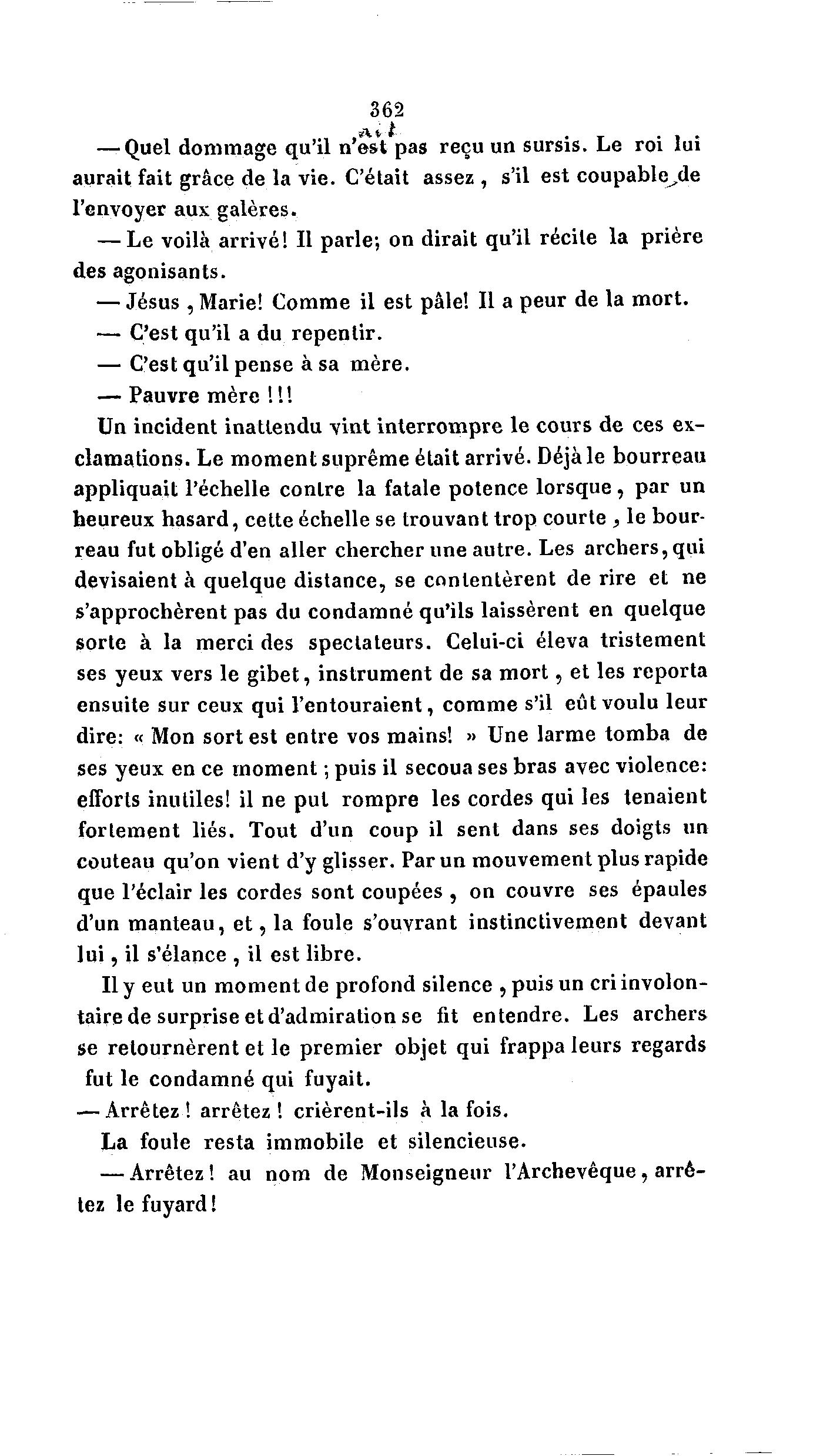 362 — Quel dommage qu'il n'est pas reçu un sursis. Le roi lui aurait fait grâce de la vie. C'était assez , s'il est coupable^de l'envoyer aux galères. — Le voilà arrivé! Il parle; on dirait qu'il récite la prière des agonisants. — Jésus, Marie! Comme il est pâle! Il a peur de la mort. — C'est qu'il a du repentir. — C'est qu'il pense à sa mère. — Pauvre mère ! ! ! Un incident inattendu vint interrompre le cours de ces ex- clamations. Le moment suprême était arrivé. Déjà le bourreau appliquait l'échelle contre la fatale potence lorsque, par un heureux hasard, cette échelle se trouvant trop courte , le bour- reau fut obligé d'en aller chercher une autre. Les archers, qui devisaient à quelque distance, se contentèrent de rire et ne s'approchèrent pas du condamné qu'ils laissèrent en quelque sorte à la merci des spectateurs. Celui-ci éleva tristement ses yeux vers le gibet, instrument de sa mort, et les reporta ensuite sur ceux qui l'entouraient, comme s'il eût voulu leur dire: « Mon sort est entre vos mains! » Une larme tomba de ses yeux en ce moment ; puis il secoua ses bras avec violence: efforts inutiles! il ne put rompre les cordes qui les tenaient fortement liés. Tout d'un coup il sent dans ses doigts un couteau qu'on vient d'y glisser. Par un mouvement plus rapide que l'éclair les cordes sont coupées , on couvre ses épaules d'un manteau, e t , la foule s'ouvrant instinctivement devant lui, il s'élance , il est libre. Il y eut un moment de profond silence , puis un cri involon- taire de surprise et d'admiration se fit entendre. Les archers se retournèrent et le premier objet qui frappa leurs regards fut le condamné qui fuyait. — Arrêtez ! arrêtez ! crièrent-ils à la fois. La foule resta immobile et silencieuse. — Arrêtez! au nom de Monseigneur l'Archevêque, arrê- tez le fuyard !