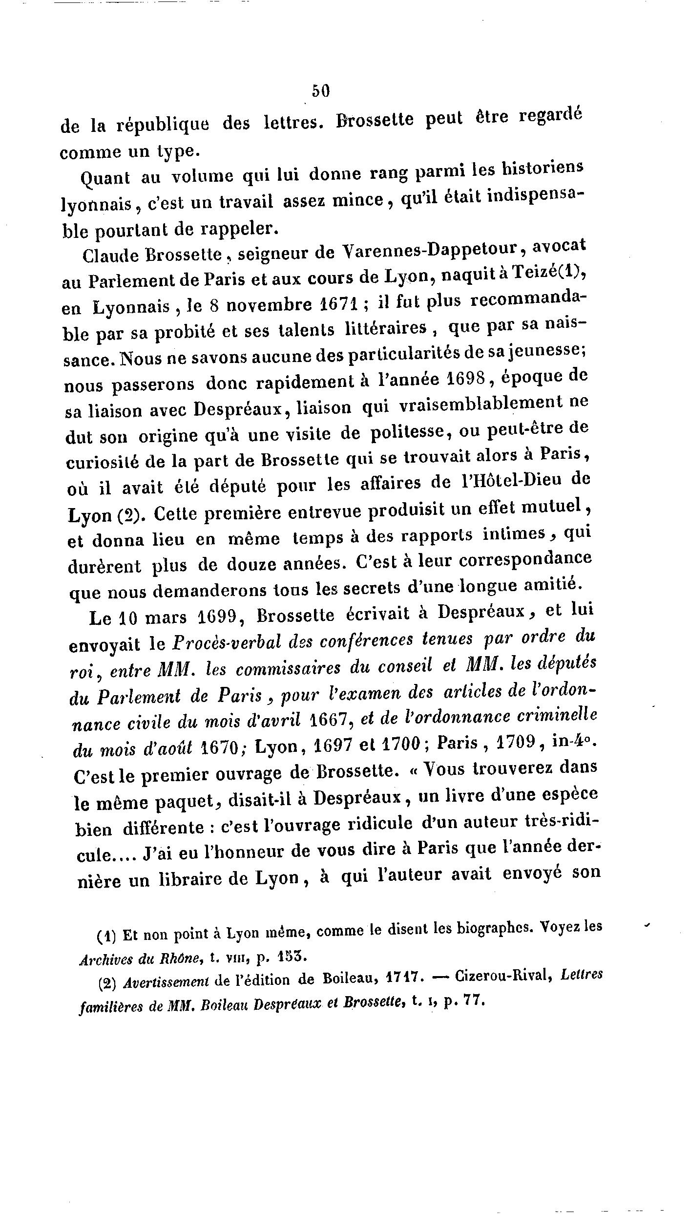 50 de la république des lettres. Brossette peut être regardé comme un type. Quant au volume qui lui donne rang parmi les historiens lyonnais, c'est un travail assez mince, qu'il était indispensa- ble pourtant de rappeler. Claude Brossette , seigneur de Varennes-Dappetour, avocat au Parlement de Paris et aux cours de Lyon, naquit à Teizé(l), en Lyonnais , le 8 novembre 1671 ; il fut plus recommanda- ble par sa probité et ses talents littéraires , que par sa nais- sance. Nous ne savons aucune des particularités de sa jeunesse; nous passerons donc rapidement à l'année 1698, époque de sa liaison avec Despréaux, liaison qui vraisemblablement ne dut son origine qu'à une visite de politesse, ou peut-être de curiosité de la part de Brossette qui se trouvait alors à Paris, où il avait été député pour les affaires de l'Hôtel-Dieu de Lyon (2). Cette première entrevue produisit un effet mutuel, et donna lieu en même temps à des rapports intimes , qui durèrent plus de douze années. C'est à leur correspondance que nous demanderons tons les secrets d'une longue amitié. Le 10 mars 1699, Brossette écrivait à Despréaux, et lui envoyait le Procès-verbal des conférences tenues par ordre du roi, entre MM. les commissaires du conseil et MM. les députés du Parlement de Paris , pour l'examen des articles de l'ordon- nance civile du mois d'avril 1667, et de l'ordonnance criminelle du mois d'août 1670; Lyon, 1697 et 1700; Paris , 1709, in-4°. C'est le premier ouvrage de Brossette. « Vous trouverez dans le même paquet, disait-il à Despréaux, un livre d'une espèce bien différente : c'est l'ouvrage ridicule d'un auteur très-ridi- cule J'ai eu l'honneur de vous dire à Paris que l'année der- nière un libraire de Lyon, à qui l'auteur avait envoyé son (1) Et non point à Lyon même, comme le disent les biographes. Voyez les Archives du Rhône, t. vin, p. 153. (2) Avertissement de l'édition de Boileau> 1717. — Cizerou-Rival, Lettres familières de MM. Boileau Despriaux et Brossette, t. i, p. 77.