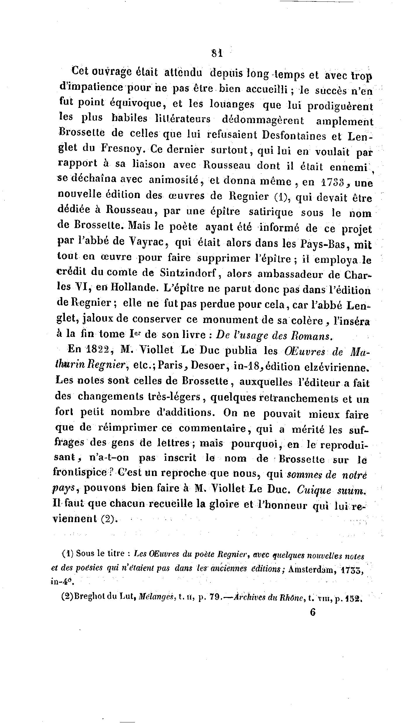 81 Cet ouvrage était attendu depuis long temps et avec trop d'impatience pour ne pas être bien accueilli; le succès n'en fut point équivoque, et les louanges que lui prodiguèrent les plus habiles littérateurs dédommagèrent amplement Brossette de celles que lui refusaient Desfontaines et L e n - glet du Fresnoy. Ce dernier surtout, qui lui en voulait par rapport à sa liaison avec Rousseau dont il était ennemi' s e déchaîna avec animosilé, et donna m ê m e , en 1 7 3 8 , une nouvelle édition des œuvres de Régnier (1), qui devait être dédiée à Rousseau, par une épître satirique sous le nom de Brossette. Mais le poète ayant été informé de ce projet par l'abbé de Vayrac, qui était alors dans les Pays-Bas, mit tout en œuvre pour faire supprimer l'épi Ire ; il employa le Crédit du comte de Sintzindorf, alors ambassadeur de Charr- ies YI, en Hollande. L'épître ne parut donc pas dans l'édition de Régnier ; elle ne fut pas perdue pour cela, car l'abbé Len- glet, jaloux de conserver ce monument de sa c o l è r e , l'inséra à la fin tome I er de son livre : De l'usage des Romans. En 1822, M. Viollet Le Duc publia les Œuvres de Ma- tharin Régnier, etc.; P a r i s , Desoer, in-18,édilion elzévirienne. Les notes sont celles de Brossette, auxquelles l'éditeur a fait des changements très-légers, quelques retranchements et un fort petit nombre d'additions. On ne pouvait mieux faire que de réimprimer ce commentaire, qui a mérité les suf- frages des gens de l e t t r e s ; mais pourquoi, en le reprodui- s a n t , n'a-t-on pas inscrit le nom de Brossette sur le frontispice ? C'est Un reproche que nous, qui sommes de notre pays, pouvons bien faire à M. Viollet Le Duc. Cuique suum. Il faut que chacun recueille la gloire et l'honneur qui lui re- viennent (2). (1) Sous le titre : Les Œuvres du poète Régnier, avec quelques nouvelles noies et des poésies qui n'étaient pas dans les anciennes éditions; Amsterdam) 1735, in-4<\ (2)Breghol du Lut, Mélanges, t. il, p. 79.—Archives du Rhône, t. TIII, p. 152. 6
