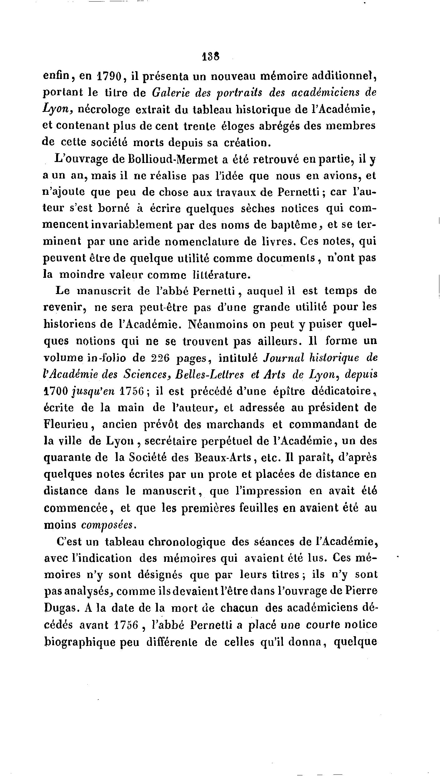 138 enfin, en 1790, il présenta un nouveau mémoire additionnel, portant le titre de Galerie des portraits des académiciens de Lyon, nécrologe extrait du tableau historique de l'Académie, et contenant plus de cent trente éloges abrégés des membres de cette société morts depuis sa création. L'ouvrage de Bollioud-Mermet a été retrouvé en partie, il y a un an, mais il ne réalise pas l'idée que nous en avions, et n'ajoute que peu de chose aux travaux de Pernetti ; car l'au- teur s'est borné à écrire quelques sèches notices qui com- mencent invariablement par des noms de baptême, et se ter- minent par une aride nomenclature de livres. Ces notes, qui peuvent être de quelque utilité comme documents, n'ont pas la moindre valeur comme littérature. Le manuscrit de l'abbé Pernetti, auquel il est temps de revenir, ne sera peut-être pas d'une grande utilité pour les historiens de l'Académie. Néanmoins on peut y puiser quel- ques notions qui ne se trouvent pas ailleurs. Il forme un volume in-iblio de 226 pages, intitulé Journal historique de l'Académie des Sciences, Belles-Lettres et Arts de Lyon, depuis il00 jusqu'en 1756; il est précédé d'une épître dédicatoire, écrite de la main de l'auteur, et adressée au président de Fleurieu, ancien prévôt des marchands et commandant de la ville de Lyon , secrétaire perpétuel de l'Académie, un des quarante de la Société des Beaux-Arts, etc. Il paraît, d'après quelques notes écrites par un prote et placées de distance en distance dans le manuscrit, que l'impression en avait été commencée, et que les premières feuilles en avaient été au moins composées. C'est un tableau chronologique des séances de l'Académie, avec l'indication des mémoires qui avaient été lus. Ces m é - moires n'y sont désignés que par leurs titres ; ils n'y sont pas analysés, comme ilsdevaient l'être dans l'ouvrage de Pierre Dugas. A la date de la mort de chacun des académiciens dé- cédés avant 1756 , l'abbé Pernetti a placé une courte notice biographique peu différente de celles qu'il donna, quelque