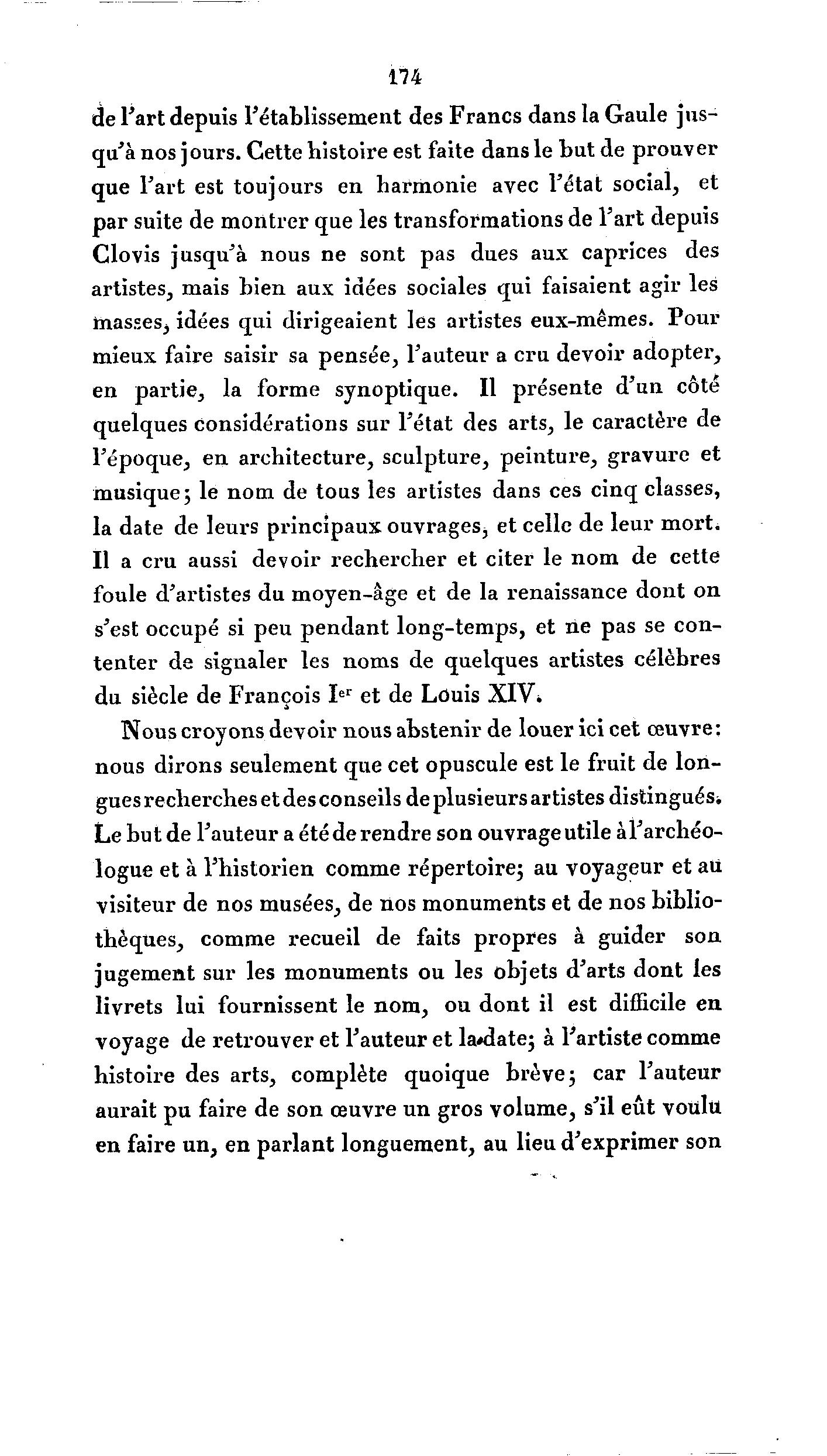 174 de l'art depuis l'établissement des Francs dans la Gaule jus- qu'à nos jours. Cette histoire est faite dans le but de prouver que l'art est toujours en harmonie avec l'état social, et par suite de montrer que les transformations de l'art depuis Clovis jusqu'à nous ne sont pas dues aux caprices des artistes, mais bien aux idées sociales qui faisaient agir les masses, idées qui dirigeaient les artistes eux-mêmes. Pour mieux faire saisir sa pensée, l'auteur a cru devoir adopter, en partie, la forme synoptique. Il présente d'un côté quelques Considérations sur l'état des arts, le caractère de l'époque, en architecture, sculpture, peinture, gravure et musique; le nom de tous les artistes dans ces cinq classes, la date de leurs principaux ouvrages, et celle de leur mort. Il a cru aussi devoir rechercher et citer le nom de cette foule d'artistes du moyen-âge et de la renaissance dont on s'est occupé si peu pendant long-temps, et ne pas se con- tenter de signaler les noms de quelques artistes célèbres du siècle de François I er et de Louis XIV* Nous croyons devoir nous abstenir de louer ici cet œuvre: nous dirons seulement que cet opuscule est le fruit de lon- gues recherches et des conseils de plusieurs artistes distingués* Le but de l'auteur a été de rendre son ouvrage utile à l'archéo- logue et à l'historien comme répertoire; au voyageur et au visiteur de nos musées, de nos monuments et de nos biblio- thèques, comme recueil de faits propres à guider son jugement sur les monuments ou les objets d'arts dont les livrets lui fournissent le nom, ou dont il est difficile en voyage de retrouver et l'auteur et la*date; à l'artiste comme histoire des arts, complète quoique brève; car l'auteur aurait pu faire de son œuvre un gros volume, s'il eût voulu en faire un, en parlant longuement, au lieu d'exprimer son