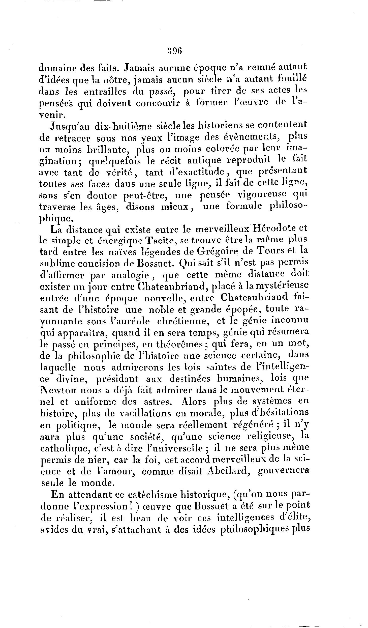896 domaine des faits. Jamais aucune époque n'a remué autant d'idées que la n ô t r e , jamais aucun siècle n'a autant fouillé dans les entrailles du passé, p o u r tirer de ses actes les pensées qui doivent concourir à former l'œuvre de l'a- venir. Jusqu'au dix-huitième siècle les historiens se contentent de retracer sous nos yeux l'image des événements, plus ou moins brillante, plus ou moins colorée par leur ima- gination ; quelquefois le récit antique reproduit le fait avec tant de v é r i t é , tant d'exactitude, que présentant toutes ses faces dans une seule ligne, il fait de cette ligne, sans s'en douter peut-être, une pensée vigoureuse qui traverse les âges, disons m i e u x , une formule philoso- phique. La distance qui existe entre le merveilleux H é r o d o t e et le simple et énergique Tacite, se trouve être la même plus tard entre les naïves légendes de Grégoire de T o u r s et la sublime concision de Bossuet. Qui sait s'il n'est pas permis d'affirmer par a n a l o g i e , que cette même distance doit exister un jour entre Chateaubriand, placé à la mystérieuse entrée d'une époque nouvelle, e n t r e Chateaubriand fai- sant de l'histoire une noble et grande épopée, toute r a - yonnante sous l'auréole c h r é t i e n n e , et le génie inconnu qui apparaîtra, quand il en sera temps, génie qui résumera le passé en principes, en théorèmes ; qui fera, en un mot, de la philosophie de l'histoire une science certaine, dans laquelle nous admirerons les lois saintes de l'intelligen- ce divine, présidant aux destinées humaines, lois que N e w t o n nous a déjà fait admirer dans le mouvement éter- nel et uniforme des astres. Alors plus de systèmes en histoire, plus de vacillations en morale, plus d'hésitations en politiqne, le monde sera réellement régénéré ; il n'y aura plus qu'une société, qu'une science religieuse, la catholique, c'est à dire l'universelle ; il ne sera plus même permis de nier, car la foi, cet accord merveilleux de la sci- ence et de l'amour, comme disait Abeilard, gouvernera seule le monde. E n attendant ce catéchisme historique, (qu'on nous par- d o n n e l'expression! ) œuvre que Bossuet a été sur le point de réaliser, il est beau de voir ces intelligences d'élite, avides du vrai, s'attachant à des idées philosophiques plus