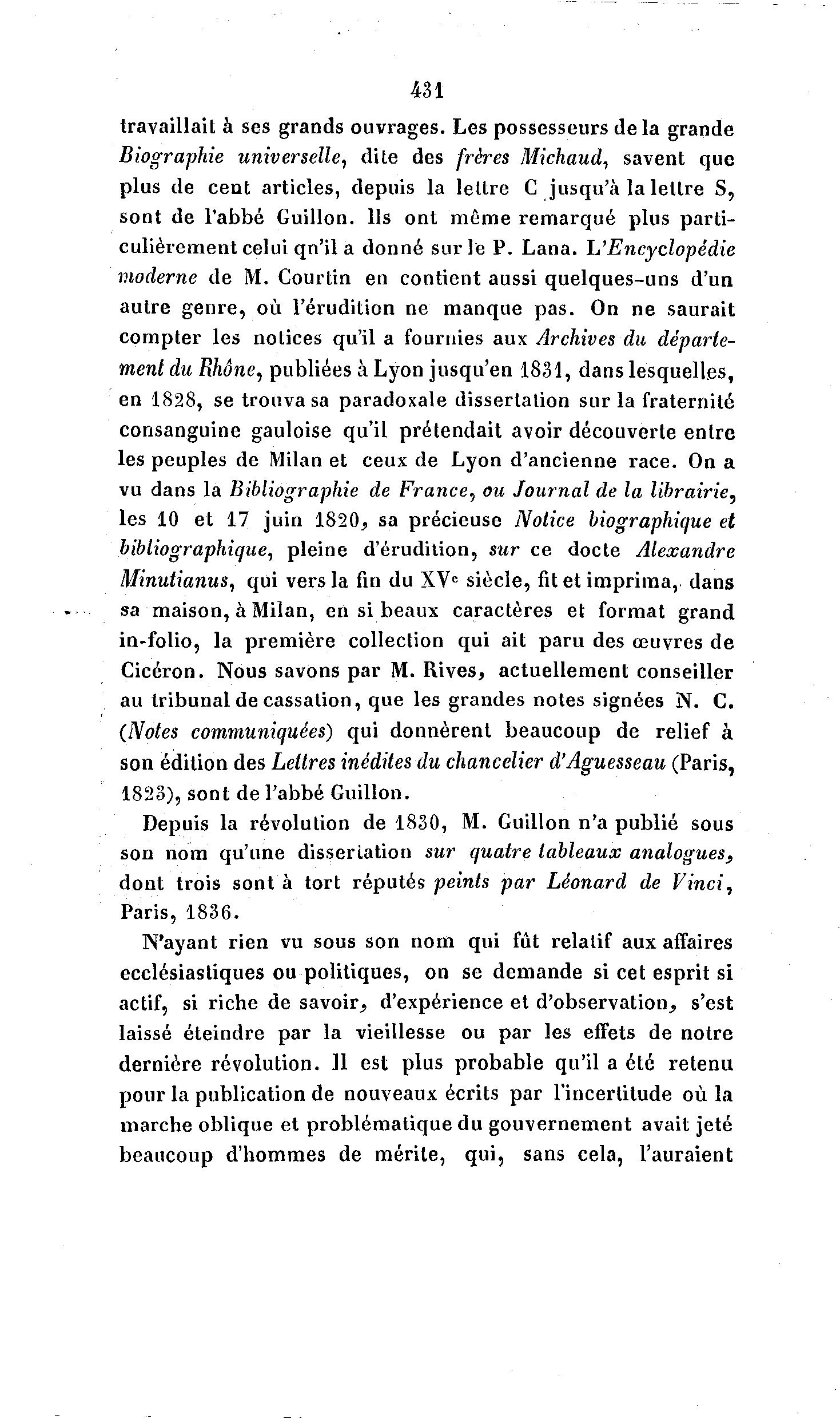 431 travaillait à ses grands ouvrages. Les possesseurs d e l à grande Biographie universelle, dite des frères Michaud, savent que plus de cent articles, depuis la lettre C jusqu'à la lettre S, sont de l'abbé Guillon. Ils ont même remarqué plus parti- culièrement celui qn'il a donné sur le P. Lana. L'Encyclopédie moderne de M. Courtin en contient aussi quelques-uns d'un autre genre, où l'érudition ne manque pas. On ne saurait compter les notices qu'il a fournies aux Archives du départe- ment du Rhône, publiées à Lyon jusqu'en 1831, dans lesquelles, en 1828, se trouva sa paradoxale dissertation sur la fraternité consanguine gauloise qu'il prétendait avoir découverte entre les peuples de Milan et ceux de Lyon d'ancienne race. On a vu dans la Bibliographie de France, ou Journal de la librairie, les 10 et 17 juin 1820, sa précieuse Notice biographique et bibliographique, pleine d'érudition, sur ce docte Alexandre Minutianus, qui vers la fin du XVe siècle, fit et imprima, dans sa maison, à Milan, en si beaux caractères et format grand in-folio, la première collection qui ait paru des œuvres de Cicéron. Nous savons par M. Rives, actuellement conseiller au tribunal de cassation, que les grandes notes signées N. C. (Notes communiquées) qui donnèrent beaucoup de relief à son édition des Lettres inédites du chancelier d'Aguesseau (Paris, 1823), sont de l'abbé Guillon. Depuis la révolution de 1830, M. Guillon n'a publié sous son nom qu'une dissertation sur quatre tableaux analogues, dont trois sont à tort réputés peints par Léonard de Vinci, Paris, 1836. N'ayant rien vu sous son nom qui fût relatif aux affaires ecclésiastiques ou politiques, on se demande si cet esprit si actif, si riche de savoir, d'expérience et d'observation, s'est laissé éteindre par la vieillesse ou par les effets de notre dernière révolution. 11 est plus probable qu'il a été retenu pour la publication de nouveaux écrits par l'incertitude où la marche oblique et problématique du gouvernement avait jeté beaucoup d'hommes de mérite, qui, sans cela, l'auraient