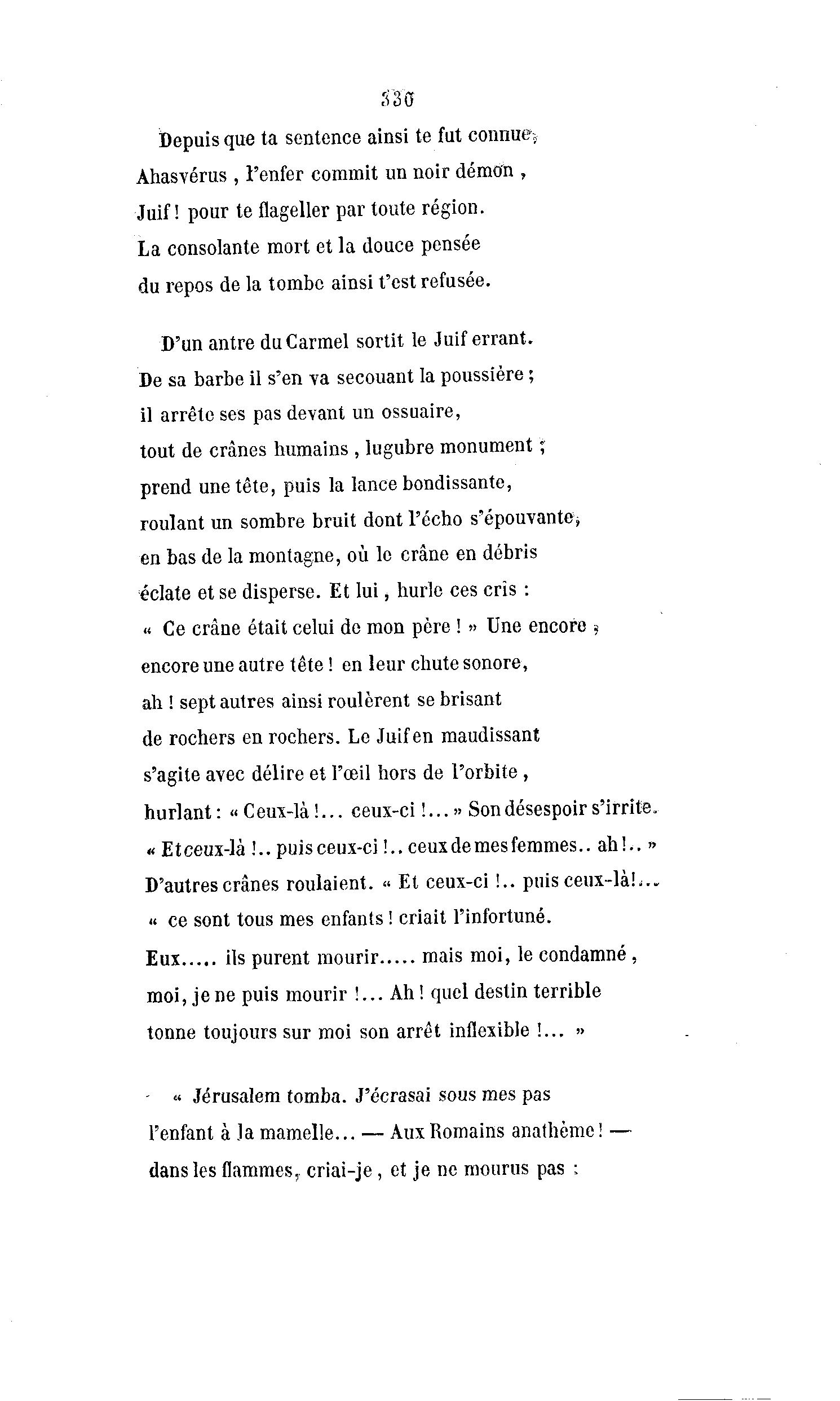 S3ff Depuis que ta sentence ainsi te fut connue, Ahasvérus , l'enfer commit un noir démon , Juif! pour teflagellerpar toute région. La consolante mort et la douce pensée du repos de la tombe ainsi t'est refusée. D'un antre duCarmel sortit le Juif errant. De sa barbe il s'en va secouant la poussière ; il arrête ses pas devant un ossuaire, tout de crânes humains , lugubre monument ; prend une tête, puis la lance bondissante, roulant un sombre bruit dont l'écho s'épouvante* en bas de la montagne, où le crâne en débris éclate et se disperse. Et lui, hurle ces cris : « Ce crâne était celui do mon père ! » Une encore ? encore une autre tête ! en leur chute sonore, ah ! sept autres ainsi roulèrent se brisant de rochers en rochers. Le Juif en maudissant s'agite avec délire et l'œil hors de l'orbite , hurlant: «Ceux-là !... ceux-ci !...» Son désespoir s'irrite. «Etceux-là .'..puis ceux-ci!., ceux de mes femmes., ah!.. » D'autres crânes roulaient. « El ceux-ci !.. puis ceux-là !,.. « ce sont tous mes enfants ! criait l'infortuné. Eux ils purent mourir mais moi, le condamné, moi, je ne puis mourir !... Ah ! quel destin terrible tonne toujours sur moi son arrêt inflexible !... » • « Jérusalem tomba. J'écrasai sous mes pas l'enfant à la mamelle... — Aux Romains anathème! — dans les flammes, criai-je, et je ne mourus pas :