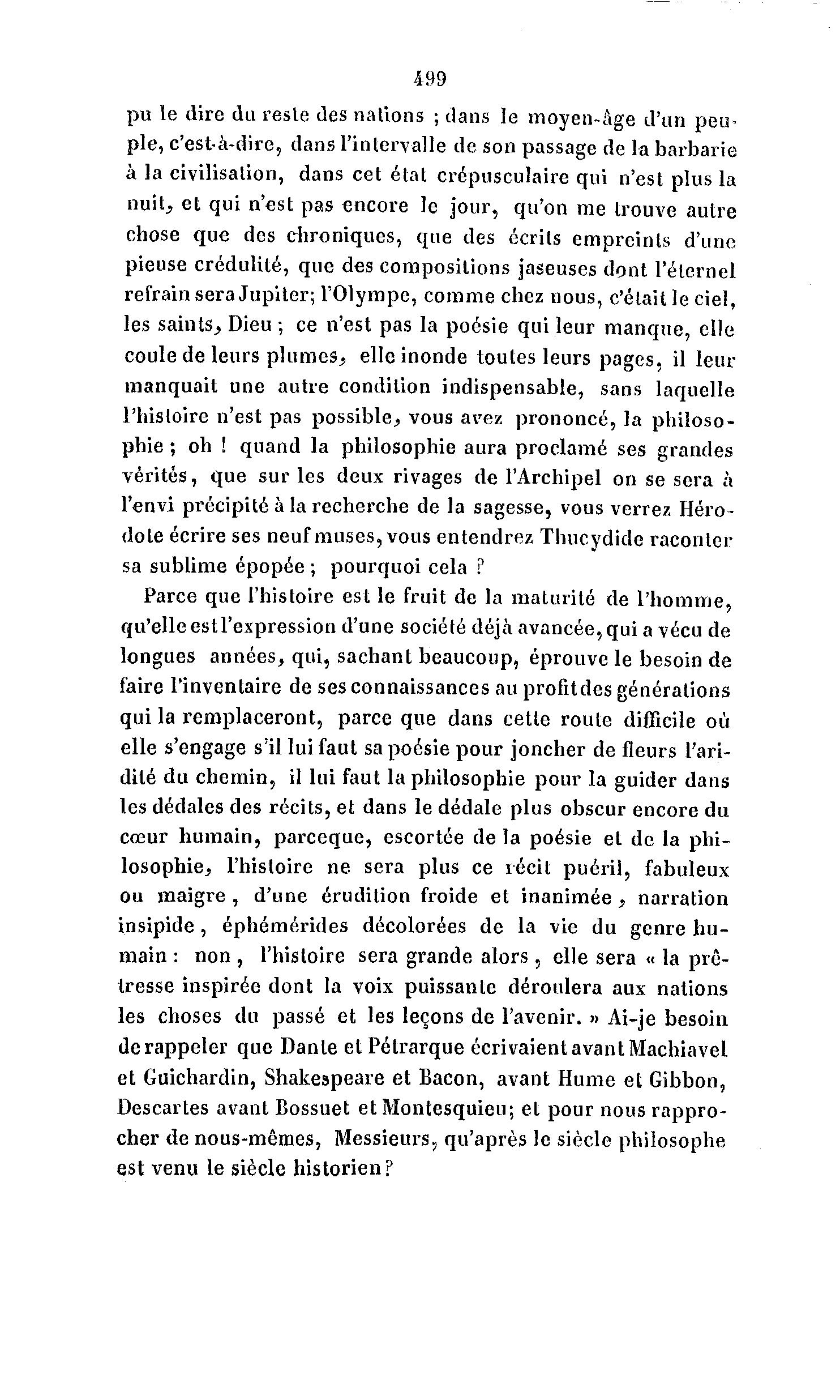 499 pu le dire du reste des nations ; dans le moyen-âge d'un peu- pie, c'est-à -dire, dans l'intervalle de son passage de la barbarie à la civilisation, dans cet état crépusculaire qui n'est plus la nuit, et qui n'est pas encore le jour, qu'on me trouve autre chose que des chroniques, que des écrits empreints d'une pieuse crédulité, que des compositions jaseuses dont l'éternel refrain sera Jupiter; l'Olympe, comme chez nous, c'était le ciel, les saints, Dieu ; ce n'est pas la poésie qui leur manque, elle coule de leurs plumes, elle inonde toutes leurs pages, il leur manquait une autre condition indispensable, sans laquelle l'histoire n'est pas possible, vous avez prononcé, la philoso- phie ; oh ! quand la philosophie aura proclamé ses grandes vérités, que sur les deux rivages de l'Archipel on se sera à l'envi précipité à la recherche de la sagesse, vous verrez Héro- dote écrire ses neuf muses, vous entendrez Thucydide raconter sa sublime épopée ; pourquoi cela ? Parce que l'histoire est le fruit de la maturité de l'homme, qu'elle estl'expression d'une société déjà avancée, qui a vécu de longues années, qui, sachant beaucoup, éprouve le besoin de faire l'inventaire de ses connaissances au profitdes générations qui la remplaceront, parce que dans cette route difficile où elle s'engage s'il lui faut sa poésie pour joncher de fleurs l'ari- dité du chemin, il lui faut la philosophie pour la guider dans les dédales des récils, et dans le dédale plus obscur encore du cœur humain, parceque, escortée de la poésie et de la phi- losophie, l'histoire ne sera plus ce récit puéril, fabuleux ou maigre, d'une érudition froide et inanimée, narration insipide, éphémérides décolorées de la vie du genre hu- main : non , l'histoire sera grande alors, elle sera « la prê- tresse inspirée dont la voix puissante déroulera aux nations les choses du passé et les leçons de l'avenir. » Ai-je besoin de rappeler que Dante et Pétrarque écrivaient avant Machiavel et Guichardin, Shakespeare et Bacon, avant Hume et Gibbon, Descaries avant Bossuet et Montesquieu; et pour nous rappro- cher de nous-mêmes, Messieurs, qu'après le siècle philosophe est venu le siècle historien?