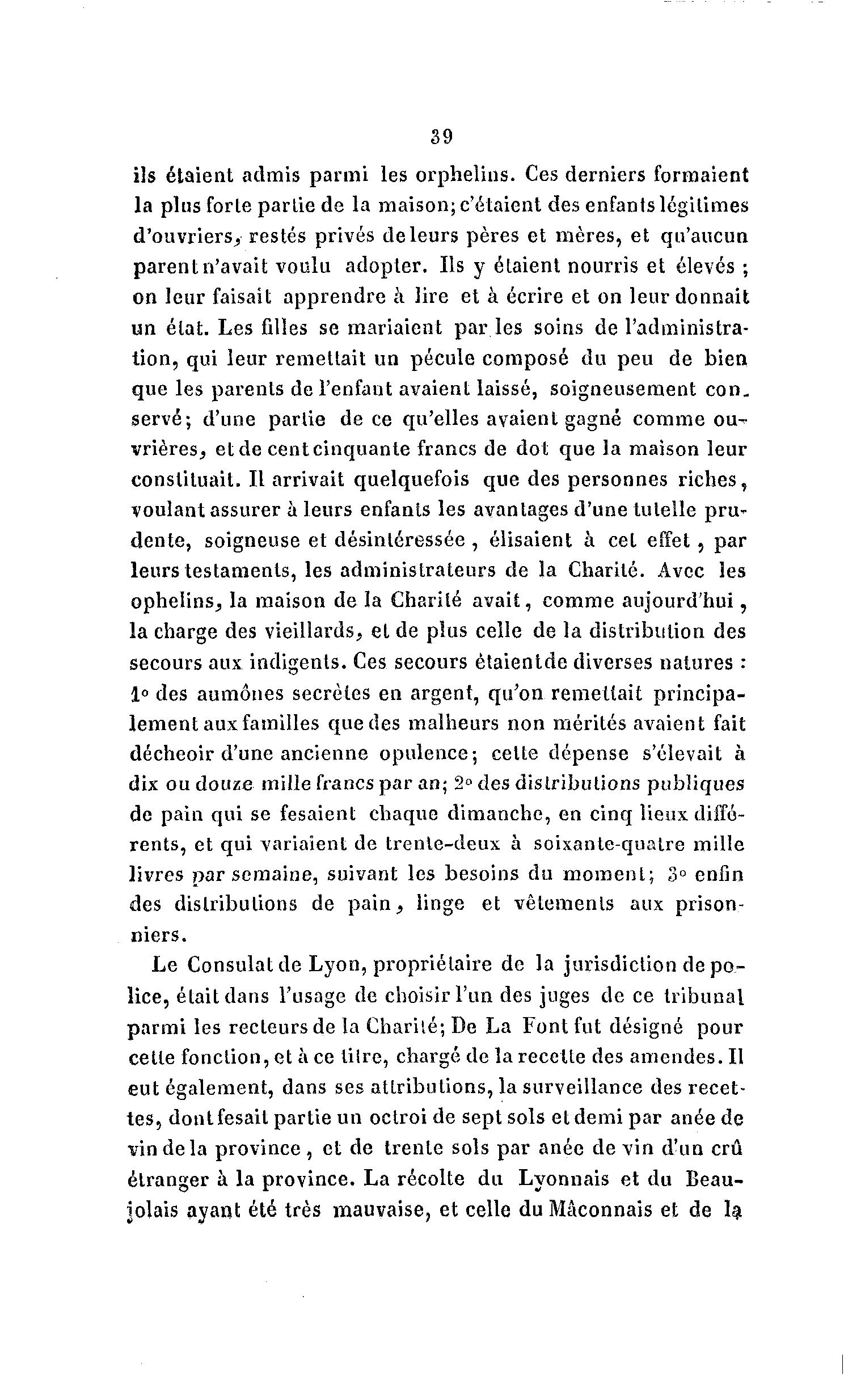 39 ils étaient admis parmi les orphelins. Ces derniers formaient la plus forte partie de la maison; c'étaient des enfants légitimes d'ouvriers, restés privés de leurs pères et mères, et qu'aucun parent n'avait voulu adopter. Ils y étaient nourris et élevés ; on leur faisait apprendre à lire et à écrire et on leur donnait un état. Les filles se mariaient par les soins de l'administra- tion, qui leur remettait un pécule composé du peu de bien que les parents de l'enfant avaient laissé, soigneusement con- servé; d'une partie de ce qu'elles avaient gagné comme ou- vrières, et de cent cinquante francs de dot que la maison leur constituait. Il arrivait quelquefois que des personnes riches, voulant assurer à leurs enfants les avantages d'une tutelle pru- dente, soigneuse et désintéressée , élisaient à cet effet, par leurs testaments, les administrateurs de la Charité. Avec les ophelins, la maison de la Charité avait, comme aujourd'hui, la charge des vieillards, et de plus celle de la distribution des secours aux indigents. Ces secours ètaientde diverses natures : 1° des aumônes secrètes en argent, qu'on remettait principa- lement aux familles que des malheurs non mérités avaient fait décheoir d'une ancienne opulence; celte dépense s'élevait à dix ou douze mille francs par an; 2° des distributions publiques de pain qui se fesaient chaque dimanche, en cinq lieux diffé- rents, et qui variaient de trente-deux à soixante-quatre mille livres par semaine, suivant les besoins du m o m e n t ; 3° enfin des distributions de p a i n , linge et vêlements aux prison- niers. Le Consulat de Lyon, propriétaire de la jurisdiction de p o - lice, était dans l'usage de choisir l'un des juges de ce tribunal parmi les recteurs de la Charité; De La Font fut désigné pour cette fonction, et à ce titre, chargé de la recette des amendes. Il eut également, dans ses attributions, la surveillance des recet- tes, dont fesail partie un octroi de sept sols et demi par anée de vin de la province, et de trente sols par anée d e v i n d'un crû étranger à la province. La récolte du Lyonnais et du Beau- jolais ayant été très mauvaise, et celle du Maçonnais et de la