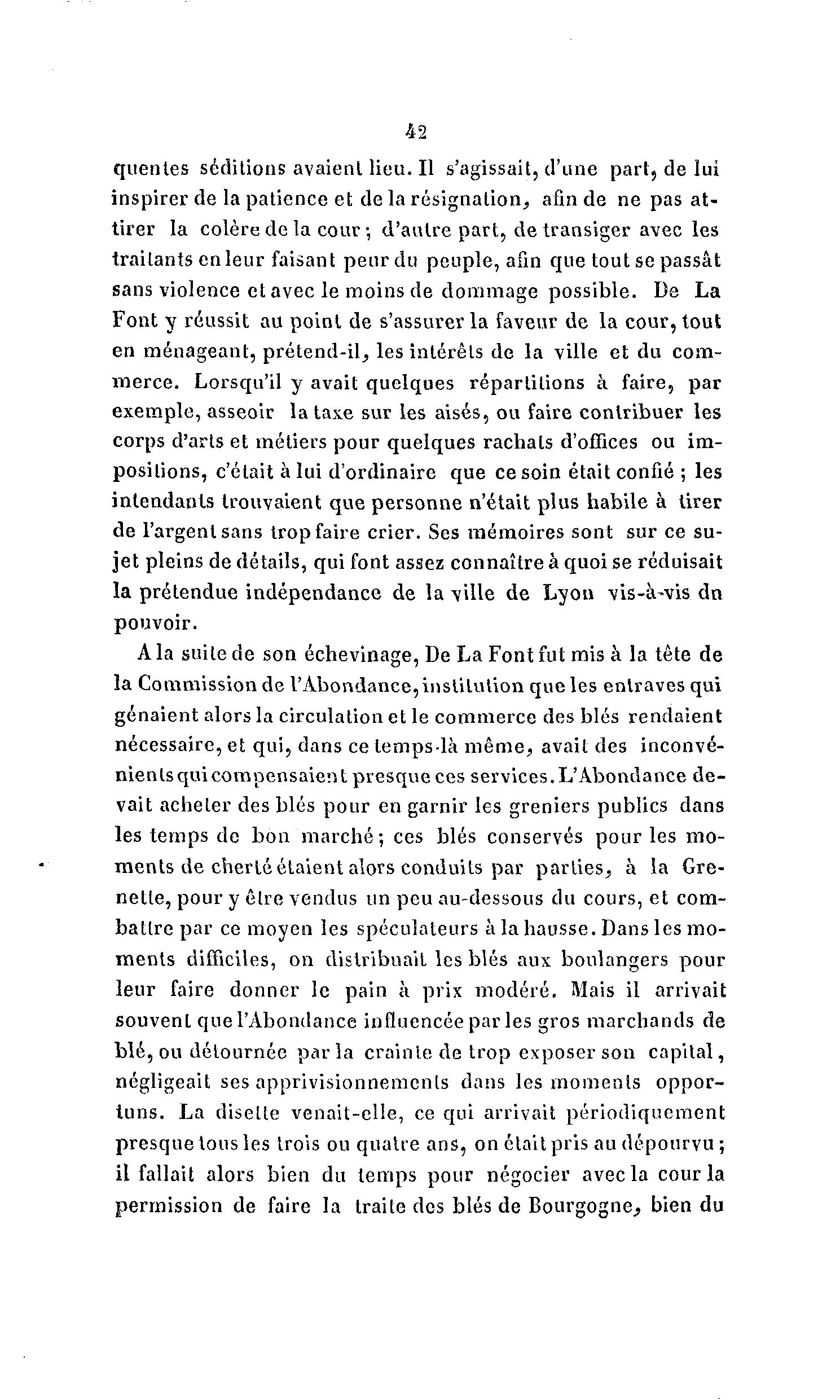 42 quentes seditionsavaienllieu.il s'agissait, d'une part, de lui inspirer de la patience et de la résignation, afin de ne pas at- tirer la colère de la cour ; d'autre part, de transiger avec les traitants en leur faisant peur du peuple, afin que tout se passât sans violence et avec le moins de dommage possible. De La Font y réussit au point de s'assurer la faveur de la cour, tout en ménageant, prétend-il, les intérêts de la ville et du com- merce. Lorsqu'il y avait quelques répartitions à faire, par exemple, asseoir la taxe sur les aisés, ou faire contribuer les corps d'arts et métiers pour quelques rachats d'offices ou im- positions, c'était à lui d'ordinaire que ce soin était confié ; les intendants trouvaient que personne n'était plus habile à tirer de l'argent sans trop faire crier. Ses mémoires sont sur ce su- jet pleins de détails, qui font assez connaître à quoi se réduisait la prétendue indépendance de la ville de Lyon vis-à -vis dn pouvoir. A la suite de son échevinage, De La Font fut mis à la tête de la Commission de l'Abondance, institution que les entraves qui gênaient alors la circulation et le commerce des blés rendaient nécessaire, et qui, dans ce temps-là m ê m e , avait des inconvé- nients qui compensaient presque ces services.L'Abondance d e - vait acheter des blés pour en garnir les greniers publics dans les temps de bon m a r c h é ; ces blés conservés pour les mo- ments de cherté étaient alors conduits par parties, à la Gre- nelte, pour y être vendus un peu au-dessous du cours, et com- battre par ce moyen les spéculateurs à la hausse. Dans les mo- ments difficiles, on distribuait les blés aux boulangers pour leur faire donner le pain à prix modéré. Mais il arrivait souvent que l'Abondance influencée par les gros marchands de blé, ou détournée par la crainte de trop exposer son capital, négligeait ses approvisionnements dans les moments oppor- tuns. La disette venait-elle, ce qui arrivait périodiquement presque tous les trois ou quatre ans, on était pris au dépourvu ; il fallait alors bien du temps pour négocier avec la cour la permission de faire la traite des blés de Bourgogne, bien du