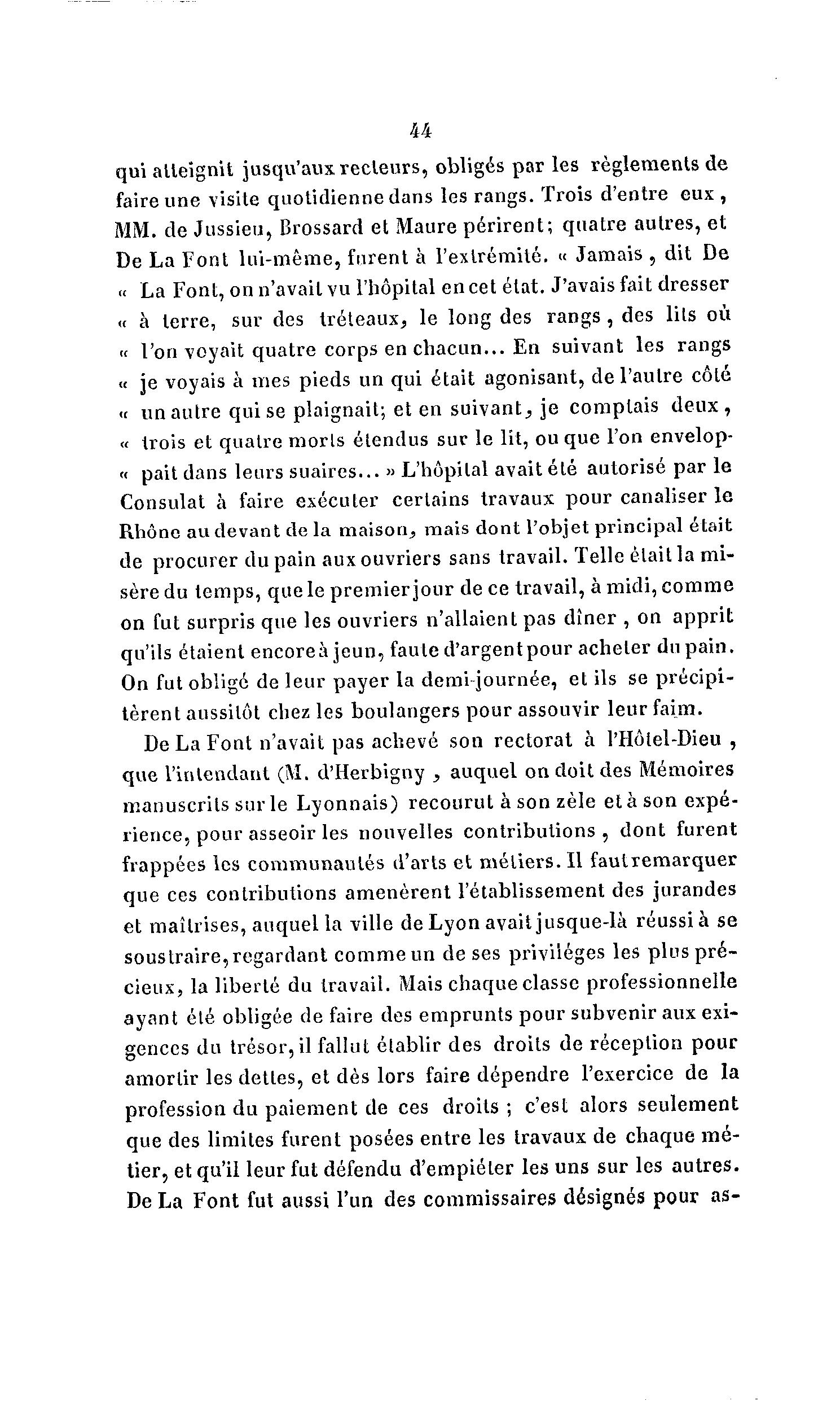 44 qui atteignit jusqu'aux recteurs, obligés par les règlements de faire une visite quotidienne dans les rangs. Trois d'entre eux , MM. de Jussieu, Brossard et Maure périrent; quatre autres, et De La Font lui-même, furent à l'extrémité. « Jamais , dit De « La Font, on n'avait vu l'hôpital en cet état. J'avais fait dresser « à terre, sur des tréteaux, le long des r a n g s , des lits où « l'on voyait quatre corps en chacun... En suivant les rangs « je voyais à mes pieds un qui était agonisant, de l'autre côté « un autre qui se plaignait; et en suivant, je complais d e u x , « trois et quatre morls étendus sur le lit, ou que l'on envelop- « pait dans leurs suaires... » L'hôpital avait été autorisé par le Consulat à faire exécuter certains travaux pour canaliser le Rhône au devant de la maison, mais dont l'objet principal était de procurer du pain aux ouvriers sans travail. Telle était la mi- sère du temps, que le premier jour de ce travail, à midi, comme on fut surpris que les ouvriers n'allaient pas dîner , on apprit qu'ils étaient encoreà jeun, faute d'argentpour acheter du pain. On fut oblige de leur payer la demi journée, et ils se précipi- tèrent aussitôt chez les boulangers pour assouvir leur faim. De La Font n'avait pas achevé son rectorat à l'Hôlel-Dieu , que l'intendant (M. d'Herbigny , auquel on doit des Mémoires manuscrits sur le Lyonnais) recourut à son zèle et à son expé- rience, pour asseoir les nouvelles contributions , dont furent frappées les communautés d'arts et métiers. Il fautremarquer que ces contributions amenèrent l'établissement des jurandes et maîtrises, auquel la ville de Lyon avait jusque-là réussi à se soustraire, regardant comme un de ses privilèges les plus p r é - cieux, la liberté du travail. Mais chaque classe professionnelle ayant été obligée de faire des emprunts pour subvenir aux exi- gences du trésor, il fallut établir des droits de réception pour amortir les dettes, et dès lors faire dépendre l'exercice de la profession du paiement de ces droits ; c'est alors seulement que des limites furent posées entre les travaux de chaque mé- tier, et qu'il leur fut défendu d'empiéter les uns sur les autres. De La Font fut aussi l'un des commissaires désignés pour as-