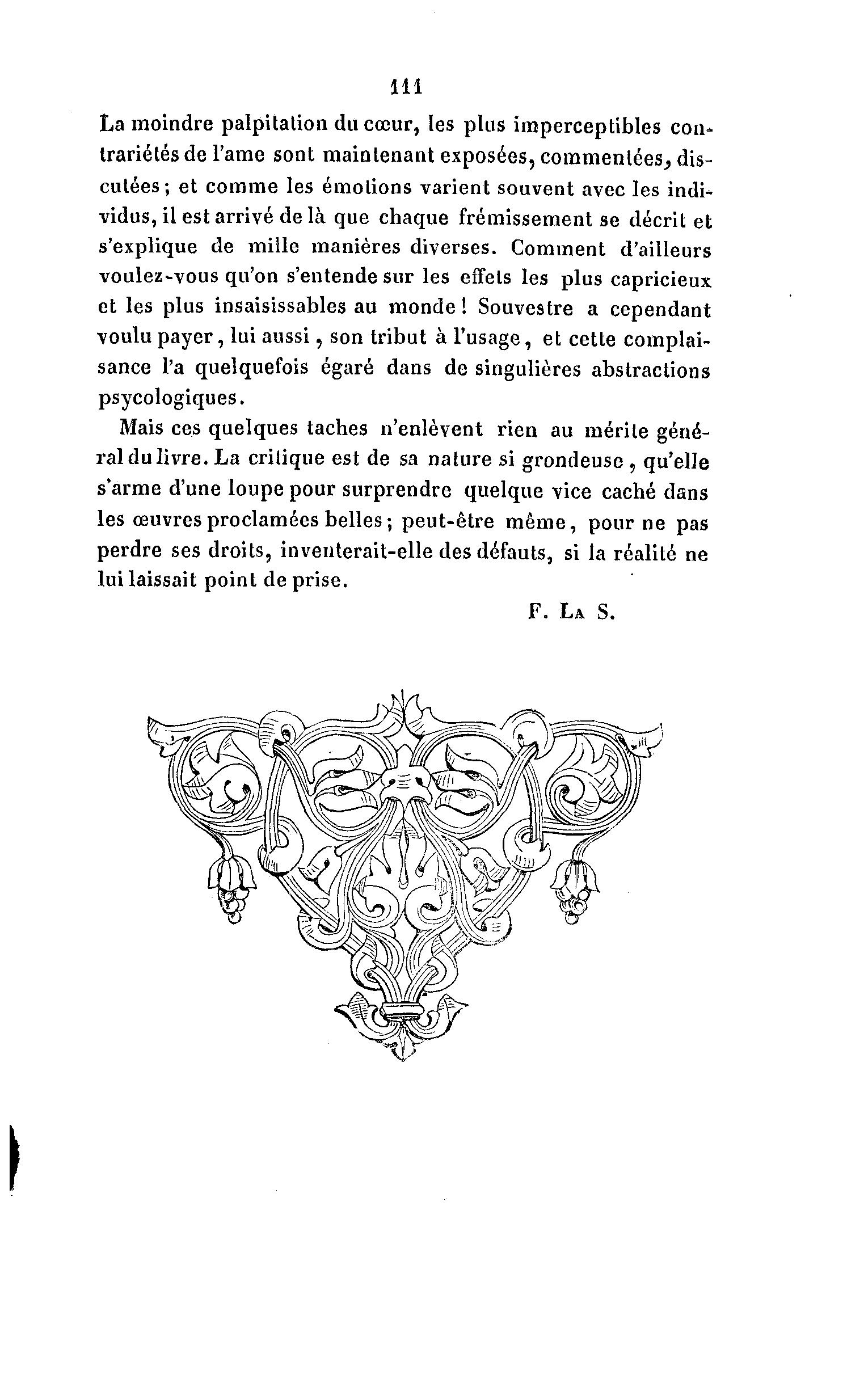 111 La moindre palpitation du cœur, les plus imperceptibles con- trariétés de l'ame sont maintenant exposées, commentées^ dis- cutées; et comme les émotions varient souvent avec les indi- vidus, il est arrivé de là que chaque frémissement se décrit et s'explique de mille manières diverses. Comment d'ailleurs voulez-vous qu'on s'entende sur les effets les plus capricieux et les plus insaisissables au monde! Souvestre a cependant voulu payer, lui aussi, son tribut à l'usage, et cette complai- sance l'a quelquefois égaré dans de singulières abstractions psycologiques. Mais ces quelques taches n'enlèvent rien au mérite géné- ral du livre. La critique est de sa nature si grondeuse, qu'elle s'arme d'une loupe pour surprendre quelque vice caché dans les œuvres proclamées belles ; peut-être même, pour ne pas perdre ses droits, inventerait-elle des défauts, si la réalité ne lui laissait point de prise.