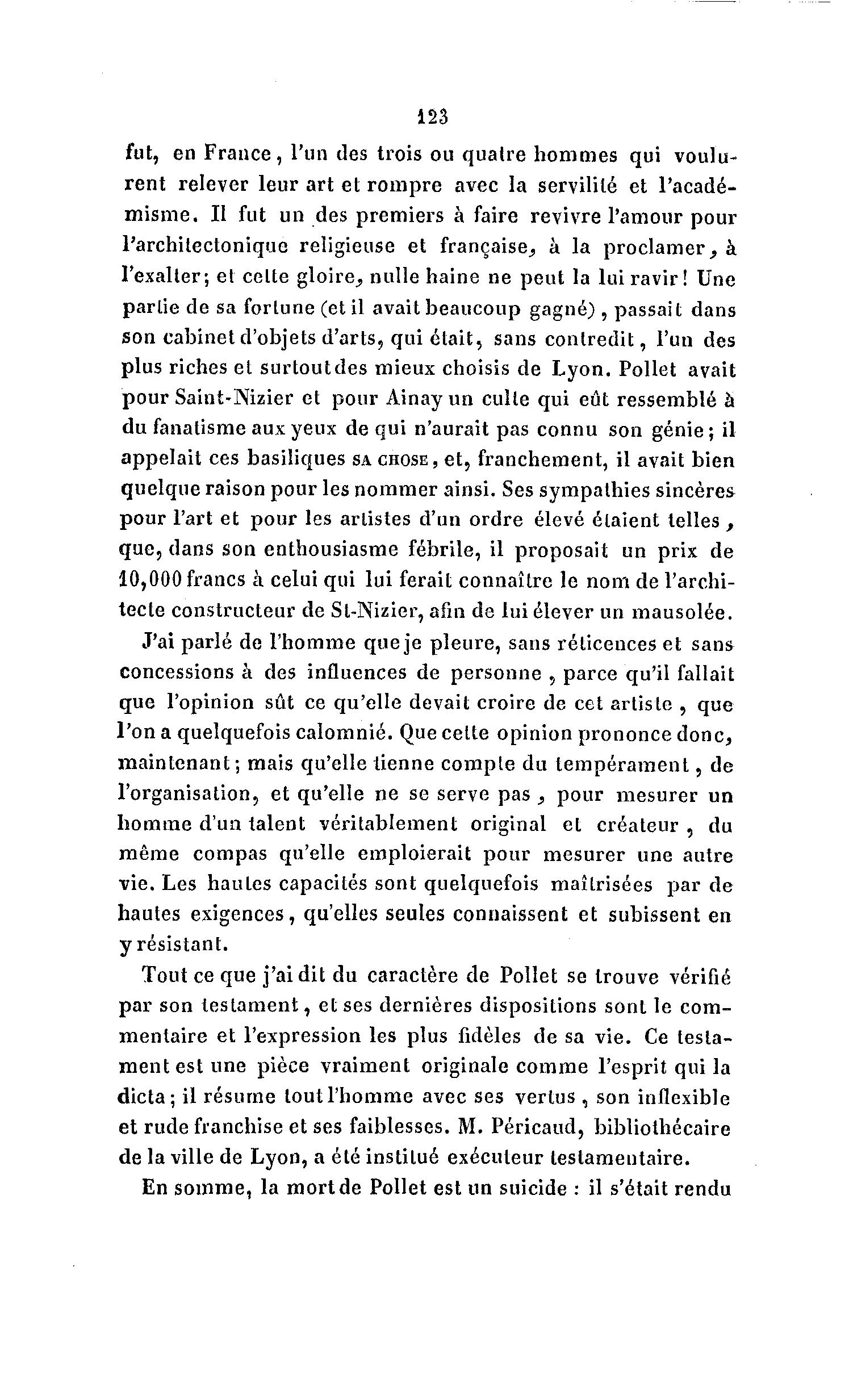 123 fut, en F r a n c e , l'un des trois ou quatre hommes qui voulu- rent relever leur art et r o m p r e avec la servilité et l'acadé- misme. II fut un des premiers à faire revivre l'amour pour l'architectonique religieuse et française, à la p r o c l a m e r , à l'exalter; et celte gloire, nulle haine ne peut la lui ravir! Une partie de sa fortune (et il avait beaucoup gagné) , passait dans son cabinet d'objets d'arts, qui était, sans contredit, l'un des plus riches et surtoutdes mieux choisis de Lyon. Pollet avait pour Saint-Nizier et pour Ainayun culte qui eût ressemblé à du fanatisme aux yeux de qui n'aurait pas connu son génie; il appelait ces basiliques SA CHOSE, et, franchement, il avait bien quelque raison pour les nommer ainsi. Ses sympathies sincères pour l'art et pour les artistes d'un ordre élevé étaient telles , que, dans son enthousiasme fébrile, il proposait un prix de 10,000 francs à celui qui lui ferait connaître le nom de l'archi- tecte constructeur de St-Nizier, afin de lui élever un mausolée. J'ai parlé de l'homme que je pleure, sans rélicences et sans concessions à des influences de personne , parce qu'il fallait que l'opinion sût ce qu'elle devait croire de cet artiste , que l'on a quelquefois calomnié. Que celte opinion prononce donc, maintenant; mais qu'elle tienne compte du t e m p é r a m e n t , de l'organisation, et qu'elle ne se serve pas , pour mesurer un homme d'un talent véritablement original et créateur , du même compas qu'elle emploierait pour mesurer une autre vie. Les hautes capacités sont quelquefois maîtrisées par de hautes exigences, qu'elles seules connaissent et subissent en y résistant. Tout ce que j'ai dit du caractère de Pollet se trouve vérifié par son t e s t a m e n t , et ses dernières dispositions sont le com- mentaire et l'expression les plus fidèles de sa vie. Ce testa- ment est une pièce vraiment originale comme l'esprit qui la dicta; il résume tout l'homme avec ses vertus , son inflexible et rude franchise et ses faiblesses. M. Péricaud, bibliothécaire de la ville de Lyon, a été institué exécuteur testamentaire. En somme, la mort de Pollet est un suicide : il s'était rendu