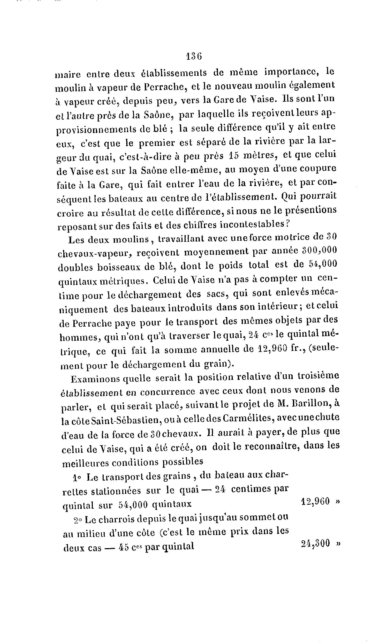 136 maire entre deux établissements de m ê m e importance, le moulin à vapeur de Pcrrache, et le nouveau moulin également à vapeur créé, depuis peu^ vers la Gare de Yaise. Ils sont l'un et l'autre près de la Saône, par laquelle ils reçoivent leurs ap- provisionnements de blé ; la seule différence qu'il y ait entre eux, c'est que le premier est séparé de la rivière par la lar- geur du quai, c'est-à -dire à peu près 15 mètres, et que celui de Yaise est sur la Saône elle-même, au moyen d'une coupure faite à la Gare, qui fait entrer l'eau de la rivière, et par con- séquent les bateaux au centre de l'établissement. Qui pourrait croire au résultat de cette différence, si nous ne le présentions reposant sur des faits et des chiffres incontestables? Les deux moulins, travaillant avec uneforce motrice de 30 chevaux-vapeur^ reçoivent moyennement par année 300,000 doubles boisseaux de blé, dont le poids total est de 54,000 quintaux métriques. Celui de Yaise n'a pas à compter un cen- time pour le déchargement des sacs, qui sont enlevés méca- niquement des bateaux introduits dans son intérieur ; et celui de Perrache paye pour le transport des mêmes objets par des hommes, qui n'ont qu'à traverser le quai, 24 c Eb le quintal mé- trique, ce qui fait la somme annuelle de 12,960 fr., (seule- ment pour le déchargement du grain). Examinons quelle serait la position relative d'un troisième établissement en concurrence avec ceux dont nous venons de parler, et qui serait placé, suivant le projet de M. Barillon, à lacôteSaint-Sébaslien,ouà celledesCarmélites,avecunechute d'eau de la force de 30chevaux. Il aurait à payer, de plus que celui de Yaise, qui a été créé, on doit le reconnaître, dans les meilleures conditions possibles 1° Le transport des grains , du bateau aux char- rettes stationnées sur le q u a i — 2 4 centimes par quintal sur 54,000 quintaux 12,960 » 2° Le charrois depuis le quai jusqu'au sommet ou au milieu d'une côte (c'est le même prix dans les deux cas — 45 c es par quintal 24,300 »