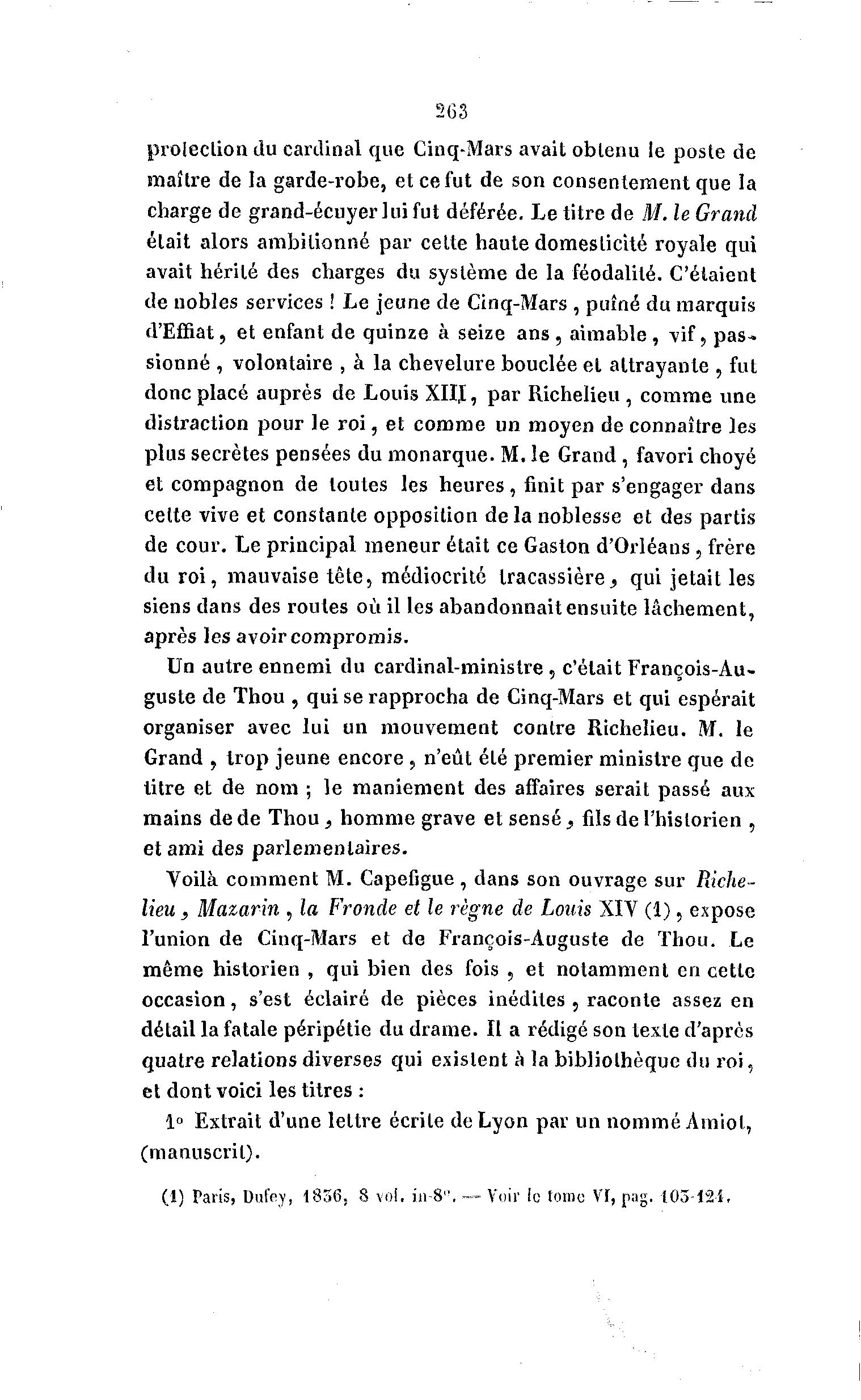 263 protection du cardinal que Cinq-Mars avait obtenu le poste de maître de la garde-robe, et ce fut de son consentement que la charge de grand-écuyer lui fut déférée. Le titre de M. le Grand était alors ambitionné par cette haute domesticité royale qui avait hérité des charges du système de la féodalité. C'étaient de nobles services ! Le jeune de Cinq-Mars , puîné du marquis d'Effiat, et enfant de quinze à seize ans , aimable , vif, pas- sionné , volontaire , à la chevelure bouclée et attrayante , fut donc placé auprès de Louis XIII, par Richelieu , comme une distraction pour le roi, et comme un moyen de connaître les plus secrètes pensées du monarque. M. le Grand, favori choyé et compagnon de toutes les heures , finit par s'engager dans cette vive et constante opposition de la noblesse et des partis de cour. Le principal meneur était ce Gaston d'Orléans, frère du roi, mauvaise tête, médiocrité Iracassière., qui jetait les siens dans des routes où il les abandonnait ensuite lâchement, après les avoir compromis. Un autre ennemi du cardinal-ministre , c'était François-Au- guste de Thou , qui se rapprocha de Cinq-Mars et qui espérait organiser avec lui un mouvement contre Richelieu. M. le Grand , trop jeune encore , n'eût été premier ministre que de titre et de nom ; le maniement des affaires serait passé aux mains de de Thou, homme grave et sensé, fils de l'historien , et ami des parlementaires. Voilà comment M. Capefigue , dans son ouvrage sur Riche- lieu , Mazarin , la Fronde et le règne de Louis XIV (1), expose l'union de Cinq-Mars et de François-Auguste de Thou. Le même historien , qui bien des fois , et notamment en cette occasion, s'est éclairé de pièces inédites , raconte assez en détail la fatale péripétie du drame. Il a rédigé son texte d'après quatre relations diverses qui existent à la bibliothèque du roi, et dont voici les titres : 1° Extrait d'une lettre écrite de Lyon par un nommé Amiot, (manuscrit). (1) Paris, Dufcy, 1836, 8 vol. ia-8". — Voir le tome Vf, pag. 105-124,