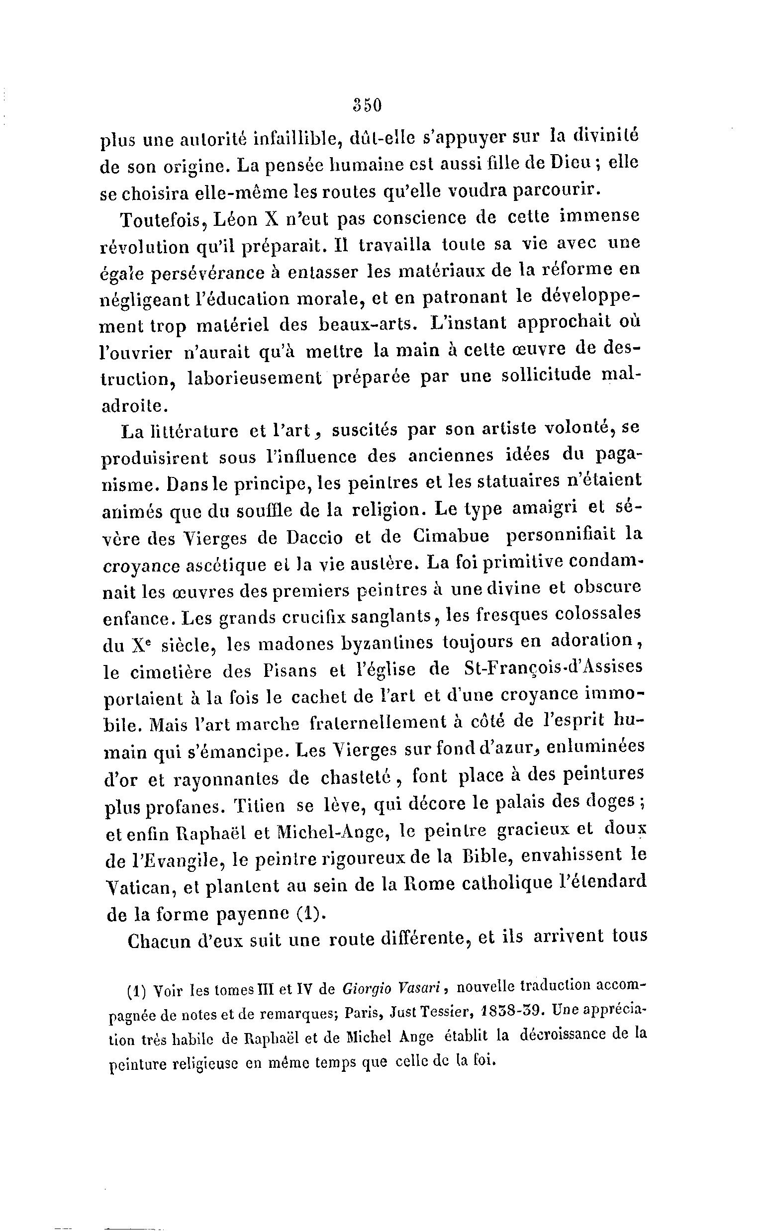 350 plus une autorité infaillible, dût-elle s'appuyer sur la divinité de son origine. La pensée humaine est aussi fille de Dieu ; elle se choisira elle-même les routes qu'elle voudra parcourir. Toutefois, Léon X n'eut pas conscience de cette immense révolution qu'il préparait. Il travailla toute sa vie avec une égale persévérance à entasser les matériaux de la réforme en négligeant l'éducation morale, et en patronant le développe- ment trop matériel des beaux-arts. L'instant approchait où l'ouvrier n'aurait qu'à mettre la main à celte œuvre de des- truction, laborieusement préparée par une sollicitude mal- adroite. La littérature et l'art, suscités par son artiste volonté, se produisirent sous l'influence des anciennes idées du paga- nisme. Dans le principe, les peintres et les statuaires n'étaient animés que du souffle de la religion. Le type amaigri et sé- vère des Vierges de Daccio et de Cimabue personnifiait la croyance ascétique et la vie austère. La foi primitive condam- nait les œuvres des premiers peintres à une divine et obscure enfance. Les grands crucifix sanglants, les fresques colossales du Xe siècle, les madones byzantines toujours en adoration, le cimetière des Pisans et l'église de St-François-d'Assises portaient à la fois le cachet de l'art et d'une croyance immo- bile. Mais l'art marche fraternellement à côté de l'esprit hu- main qui s'émancipe. Les Vierges sur fond d'azur, enluminées d'or et rayonnantes de chasteté, font place à des peintures plus profanes. Titien se lève, qui décore le palais des doges ; et enfin Raphaël et Michel-Ange, le peintre gracieux et doux de l'Evangile, le peintre rigoureux de la Bible, envahissent le Vatican, et plantent au sein de la Rome catholique l'étendard de la forme payenne (1). Chacun d'eux suit une route différente, et ils arrivent tous (1) Voir les lomesIII et IV de Giorgio Vasari, nouvelle traduction accom- pagnée de notes et de remarques; Paris, JustTessier, 1838-59. Une apprécia- tion très habile de Raphaël et de Michel Ange établit la décroissance de la peinture religieuse en même temps que celle de la foi.