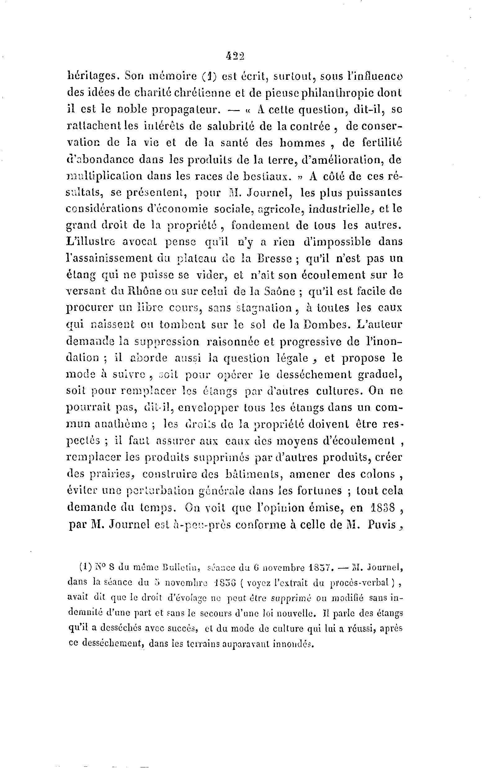 422 héritages. Son mémoire (3) est écrit, surtout, sous l'influence des idées de charité chrétienne et de pieuse philanthropie dont il est le noble propagateur. — « A cette question, dit-il, se rattachent les intérêts de salubrité de la c o n t r é e , de conser- vation de la vie et de la santé des hommes , de fertilité d'abondance dans les produits de la terre, d'amélioration, de multiplication dans les races de bestiaux. » A côté de ces ré- sultats, se. présentent, pour M. Journel, les plus puissantes considérations d'économie sociale, agricole, industrielle, e l l e grand droit de la propriété , fondement de tous les autres. L'illustre avocat pense qu'il n'y a rien d'impossible dans l'assainissement du plateau de la Bresse ; qu'il n'est pas un étang qui ne puisse se vider, et n'ait son écoulement sur le versant du Rhône ou sur celui de la Saône ; qu'il est facile de procurer un libre cours, sans stagnation , à toutes les eaux qui naissent ou tombent sur le sol de la Dombes. L'auteur demande ia suppression raisonnéc et progressive de l'inon- dation ; il aborde aussi la question légale , et propose le mode à suivre , .ïoit pour opérer ie dessèchement graduel, soit pour remplacer les étangs par d'autres cultures. On ne pourrait pas, dil-il, envelopper tous les étangs dans un com- mun anathèmo ; les droits de 3a propriété doivent être res- pectés ; il faut assurer aux eaux tics moyens d'écoulement , remplacer les produits supprimés par d'autres produits, créer des prairies, construire des bâtiments, amener des colons , éviter une perturbation générale dans les fortunes ; tout cela demande du temps. On voit que l'opinion émise, en 1838 , par M. Journel est à -pe;:-près conforme à celle de M. Puvis^ (1) K° S du même Bulletin, séance du G novembre '1837. —• SI. Journel, dans la séance du 5 novemlire -183G [ voyez l'extrait du procès-verbal) , avait dit que le droit d'évoiage ne peut être supprimé ou modifié sans in- demnité d'une part et fans le secours d'une loi nouvelle. Il parie des étangs qu'il a desséches avec succès, et du mode de culture qui lui a réussi, après ce dessèchement, dans les terrains auparavant innondés.