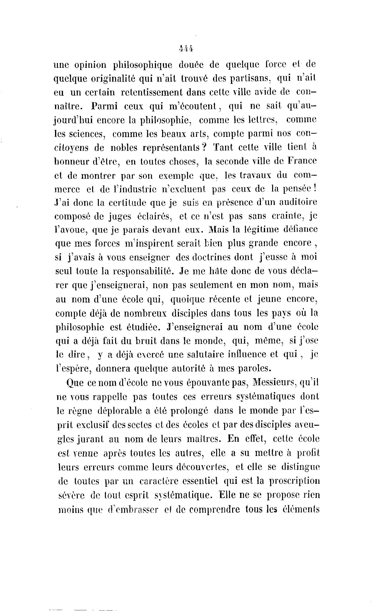 444 une opinion philosophique douée de quelque force et de quelque originalité qui n'ait trouvé des partisans, qui n'ait eu un certain retentissement dans cette ville avide de con- naître. Parmi ceux qui m'écoutent, qui ne sait qu'au- jourd'hui encore la philosophie, comme les lettres, comme les sciences, comme les beaux arts, compte parmi nos con- citoyens de nobles représentants? Tant cette ville tient à honneur d'être, en toutes choses, la seconde ville de France et de montrer par son exemple que, les travaux du com- merce et de l'industrie n'excluent pas ceux de la pensée ! J'ai donc la certitude que je suis en présence d'un auditoire composé de juges éclairés, et ce n'est pas sans crainte, je l'avoue, que je parais devant eux. Mais la légitime défiance que mes forces m'inspirent serait bien plus grande encore , si j'avais à vous enseigner des doctrines dont j'eusse à moi seul toute la responsabilité. Je me hâte donc de vous décla- rer que j'enseignerai, non pas seulement en mon nom, mais au nom d'une école qui, quoique récente et jeune encore, compte déjà de nombreux disciples dans tous les pays où la philosophie est étudiée. J'enseignerai au nom d'une école qui a déjà fait du bruit dans le monde, qui, même, si j'ose le dire, y a déjà exercé une salutaire influence et qui , je l'espère, donnera quelque autorité à mes paroles. Que ce nom d'école ne vous épouvante pas, Messieurs, qu'il ne vous rappelle pas toutes ces erreurs systématiques dont le règne déplorable a été prolongé dans le monde par l'es- prit exclusif des sectes et des écoles et par des disciples aveu- gles jurant au nom de leurs maîtres. En effet, cette école est venue après toutes les autres, elle a su mettre à profit leurs erreurs comme leurs découvertes, et elle se distingue de toutes par un caractère essentiel qui est la proscription sévère de tout esprit systématique. Elle ne se propose rien moins que d'embrasser et de comprendre tous les éléments