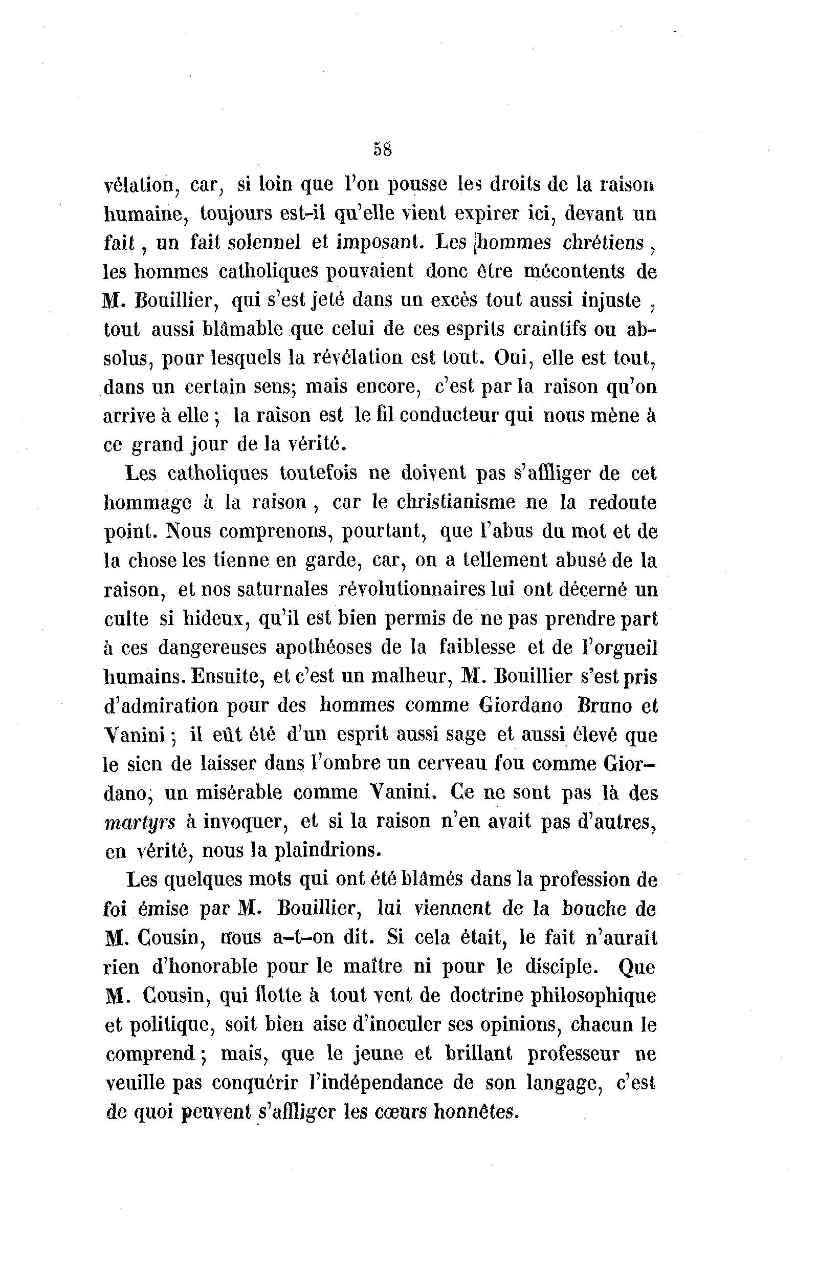 58 vélation, car, si loin que l'on pousse les droits de la raison humaine, toujours est-il qu'elle vient expirer ici, devant un fait, un fait solennel et imposant. Les [hommes chrétiens, les hommes catholiques pouvaient donc être mécontents de M. Bouillier, qui s'est jeté dans un excès tout aussi injuste , tout aussi blâmable que celui de ces esprits craintifs ou ab- solus, pour lesquels la révélation est tout. Oui, elle est tout, dans un certain sens; mais encore, c'est par la raison qu'on arrive à elle ; la raison est le fil conducteur qui nous mène a ce grand jour de la vérité. Les catholiques toutefois ne doivent pas s'affliger de cet hommage à la raison , car le christianisme ne la redoute point. Nous comprenons, pourtant, que l'abus du mot et de la chose les tienne en garde, car, on a tellement abusé de la raison, et nos saturnales révolutionnaires lui ont décerné un culte si hideux, qu'il est bien permis de ne pas prendre part à ces dangereuses apothéoses de la faiblesse et de l'orgueil humains. Ensuite, et c'est un malheur, M. Bouillier s'est pris d'admiration pour des hommes comme Giordano Bruno et Vanini ; il eût été d'un esprit aussi sage et aussi élevé que le sien de laisser dans l'ombre un cerveau fou comme Gior- dano, un misérable comme Vanini. Ce ne sont pas là des martyrs à invoquer, et si la raison n'en avait pas d'autres, en vérité, nous la plaindrions. Les quelques mots qui ont été blâmés dans la profession de foi émise par M. Bouillier, lui viennent de la bouche de M. Cousin, nous a-t-on dit. Si cela était, le fait n'aurait rien d'honorable pour le maître ni pour le disciple. Que M. Cousin, qui flotte à tout vent de doctrine philosophique et politique, soit bien aise d'inoculer ses opinions, chacun le comprend ; mais, que le jeune et brillant professeur ne veuille pas conquérir l'indépendance de son langage, c'est de quoi peuvent s'affliger les cœurs honnêtes.