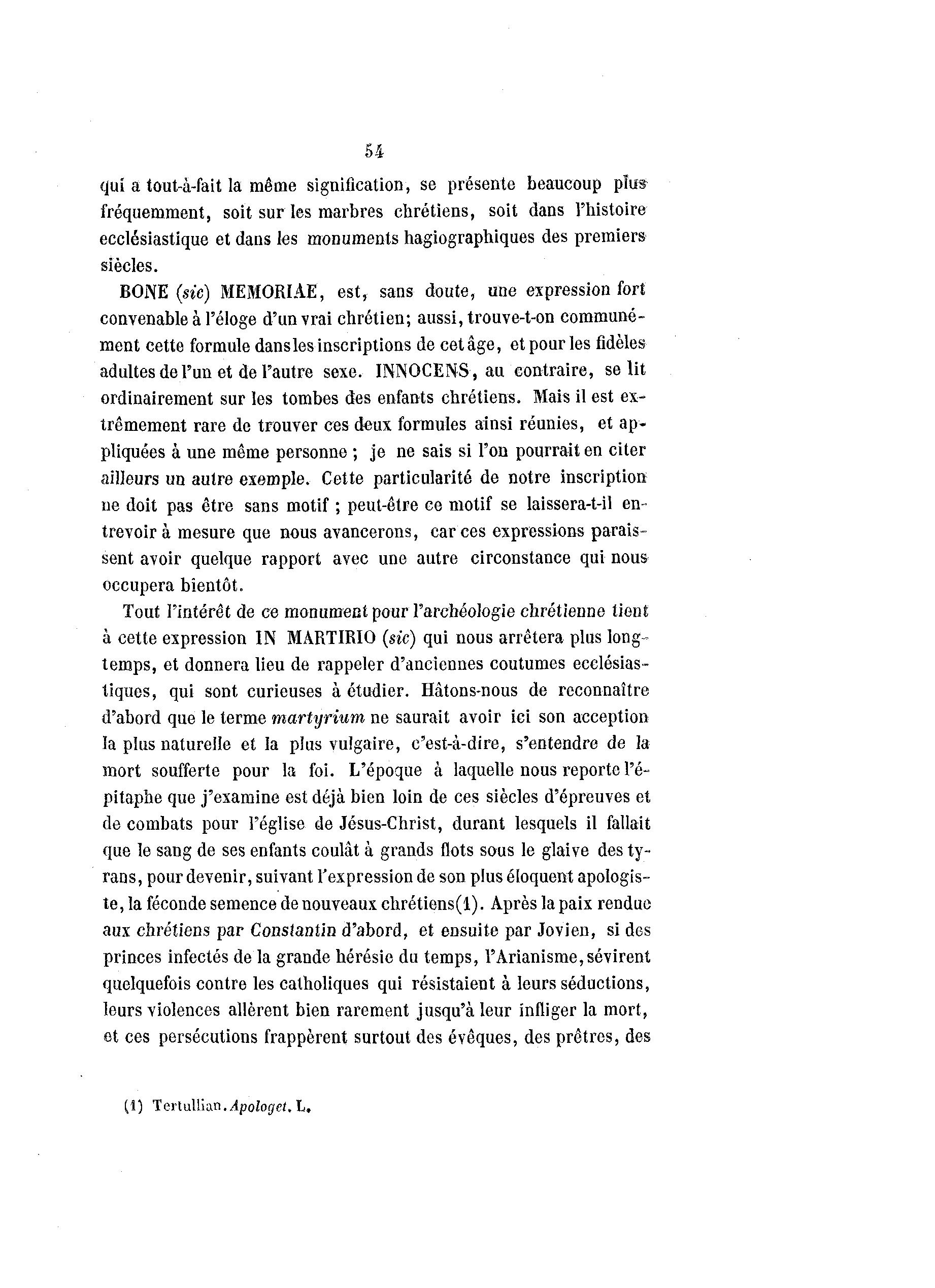 54 qui a tout-à -fait la même signification, se présente beaucoup plus fréquemment, soit sur les marbres chrétiens, soit dans l'histoire ecclésiastique et dans les monuments hagiographiques des premiers siècles. BONE (sic) MEMORIAE, est, sans doute, une expression fort convenable à l'éloge d'un vrai chrétien; aussi, trouve-t-on communé- ment cette formule dansles inscriptions de cetâge, et pour les fidèles adultes de l'un et de l'autre sexe. INNOCENS, au contraire, se lit ordinairement sur les tombes des enfants chrétiens. Mais il est ex- trêmement rare de trouver ces deux formules ainsi réunies, et ap- pliquées à une même personne ; je ne sais si l'on pourrait en citer ailleurs un autre exemple. Cette particularité de notre inscription ne doit pas être sans motif ; peut-être ce motif se laissera-t-il en- trevoir à mesure que nous avancerons, car ces expressions parais- sent avoir quelque rapport avec une autre circonstance qui nous occupera bientôt. Tout l'intérêt de ce monument pour l'archéologie chrétienne tient à cette expression IN MARTIRIO (sic) qui nous arrêtera plus long- temps, et donnera lieu de rappeler d'anciennes coutumes ecclésias- tiques, qui sont curieuses à étudier. Hâtons-nous de reconnaître d'abord que le terme martyrium ne saurait avoir ici son acception la plus naturelle et la plus vulgaire, c'est-à -dire, s'entendre de la mort soufferte pour la foi. L'époque à laquelle nous reporte l'é- pitaphe que j'examine est déjà bien loin de ces siècles d'épreuves et de combats pour l'église de Jésus-Christ, durant lesquels il fallait que le sang de ses enfants coulât à grands flots sous le glaive des ty- rans, pour devenir, suivant l'expression de son plus éloquent apologis- te, la féconde semence de nouveaux chrétiens(l). Après la paix rendue aux chrétiens par Constantin d'abord, et ensuite par Jovien, si des princes infectés de la grande hérésie du temps, FArianisme,sévirent quelquefois contre les catholiques qui résistaient à leurs séductions, leurs violences allèrent bien rarement jusqu'à leur infliger la mort, et ces persécutions frappèrent surtout des évêques, des prêtres, des (1) TetlaXWa.'B.Apologet.l,