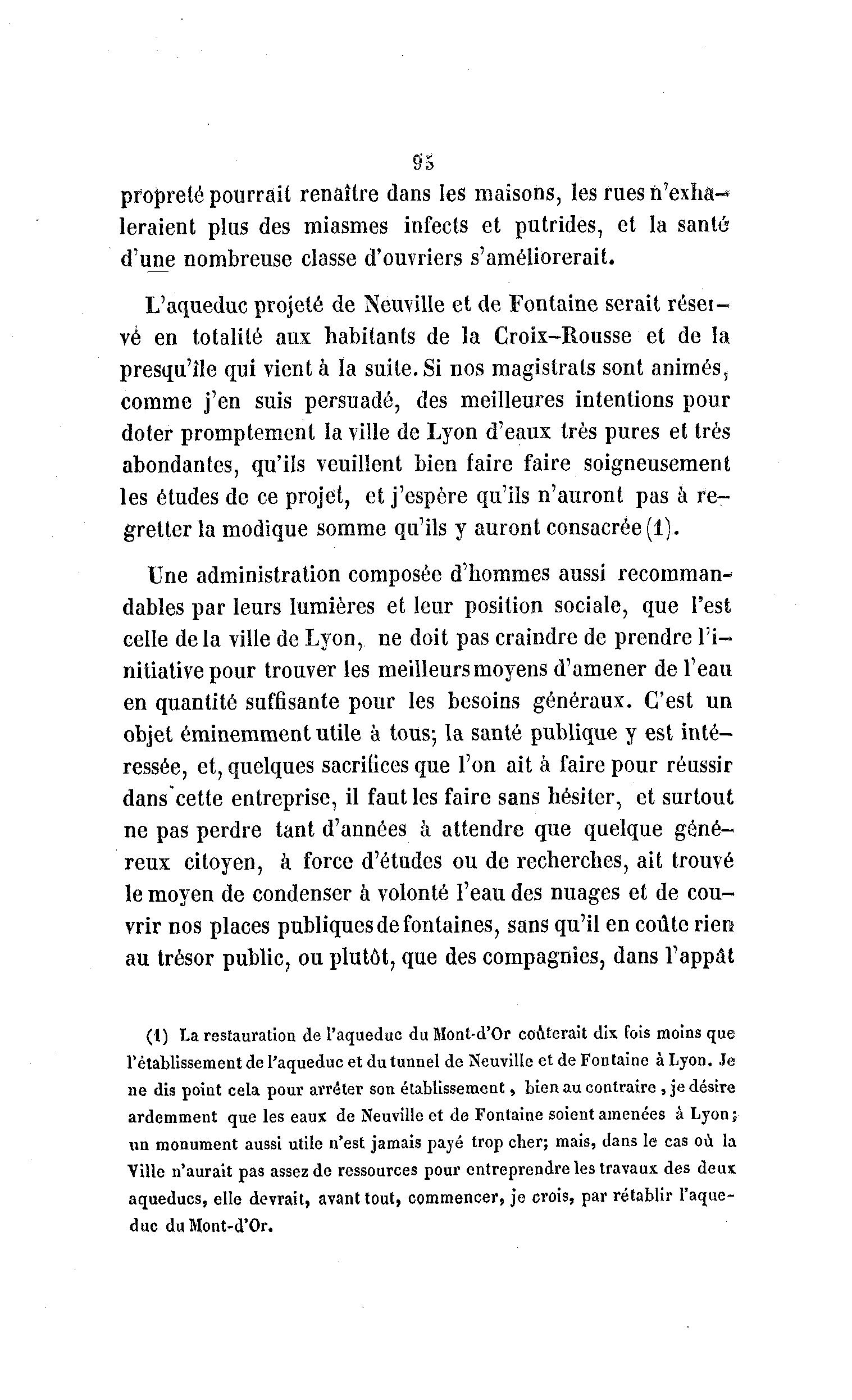 9'5 propreté pourrait renaître dans les maisons, les rues n'exha- leraient plus des miasmes infects et putrides, et la santé d'une nombreuse classe d'ouvriers s'améliorerait. L'aqueduc projeté de Neuville et de Fontaine serait réser- vé en totalité aux habitants de la Croix-Rousse et de la presqu'île qui vient à la suite. Si nos magistrats sont animés, comme j'en suis persuadé, des meilleures intentions pour doter promptement la ville de Lyon d'eaux très pures et très abondantes, qu'ils veuillent bien faire faire soigneusement les études de ce projet, et j'espère qu'ils n'auront pas à re- gretter la modique somme qu'ils y auront consacrée (1). Une administration composée d'hommes aussi recomman- dâmes par leurs lumières et leur position sociale, que l'est celle delà ville de Lyon, ne doit pas craindre de prendre l'i- nitiative pour trouver les meilleurs moyens d'amener de l'eau en quantité suffisante pour les besoins généraux. C'est un objet éminemment utile à tous; la santé publique y est inté- ressée, et, quelques sacriiices que l'on ait à faire pour réussir danscette entreprise, il faut les faire sans hésiter, et surtout ne pas perdre tant d'années à attendre que quelque géné- reux citoyen, à force d'études ou de recherches, ait trouvé le moyen de condenser à volonté l'eau des nuages et de cou- vrir nos places publiques de fontaines, sans qu'il en coûte rien au trésor public, ou plutôt, que des compagnies, dans l'appât (1) La restauration de l'aqueduc du Mont-d'Or coûterait dix fois moins que l'établissement de l'aqueduc et du tunnel de Neuville et de Fontaine à Lyon. Je ne dis point cela pour arrêter son établissement, bien au contraire , je désire ardemment que les eaux de Neuville et de Fontaine soient amenées à Lyon; un monument aussi utile n'est jamais payé trop cher; mais, dans le cas où la Ville n'aurait pas assez de ressources pour entreprendre les travaux des deux aqueducs, elle devrait, avant tout, commencer, je crois, par rétablir l'aque- duc du Mont-d'Or.