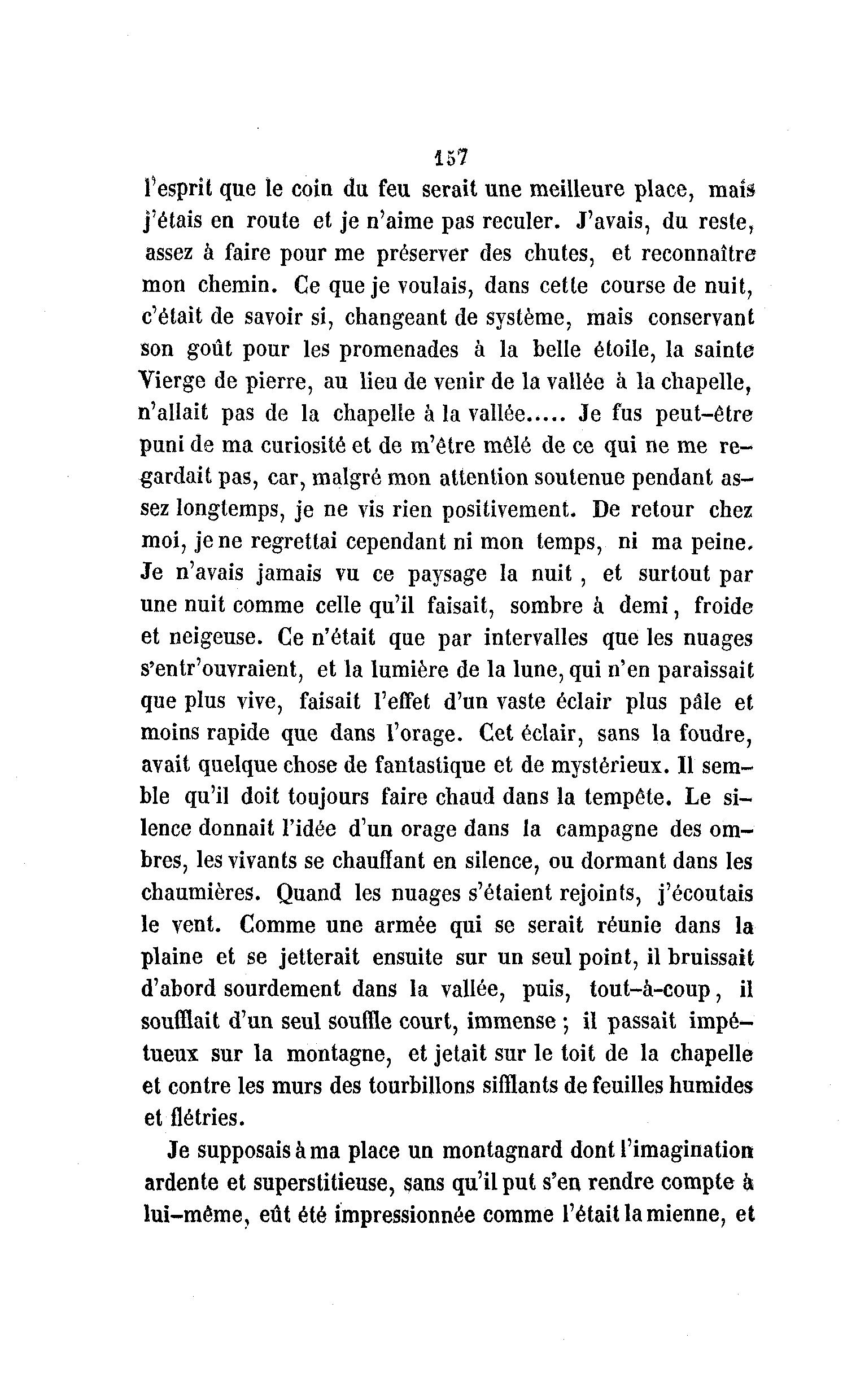 157 l'esprit que le coin du feu serait une meilleure place, mais j'étais en route et je n'aime pas reculer. J'avais, du reste, assez à faire pour me préserver des chutes, et reconnaître mon chemin. Ce que je voulais, dans cette course de nuit, c'était de savoir si, changeant de système, mais conservant son goût pour les promenades à la belle étoile, la sainte Vierge de pierre, au lieu de venir de la vallée à la chapelle, n'allait pas de la chapelle à la vallée Je fus peut-être puni de ma curiosité et de m'être mêlé de ce qui ne me re- gardait pas, car, malgré mon attention soutenue pendant as- sez longtemps, je ne vis rien positivement. De retour chez moi, je ne regrettai cependant ni mon temps, ni ma peine. Je n'avais jamais vu ce paysage la nuit , et surtout par une nuit comme celle qu'il faisait, sombre à demi, froide et neigeuse. Ce n'était que par intervalles que les nuages s'entr'ouvraient, et la lumière de la lune, qui n'en paraissait que plus vive, faisait l'effet d'un vaste éclair plus pâle et moins rapide que dans l'orage. Cet éclair, sans la foudre, avait quelque chose de fantastique et de mystérieux. Il sem- ble qu'il doit toujours faire chaud dans la tempête. Le si- lence donnait l'idée d'un orage dans la campagne des om- bres, les vivants se chauffant en silence, ou dormant dans les chaumières. Quand les nuages s'étaient rejoints, j'écoutais le vent. Comme une armée qui se serait réunie dans la plaine et se jetterait ensuite sur un seul point, il bruissait d'abord sourdement dans la vallée, puis, tout-à -coup, il soufflait d'un seul souffle court, immense ; il passait impé- tueux sur la montagne, et jetait sur le toit de la chapelle et contre les murs des tourbillons sifflants de feuilles humides et flétries. Je supposais à ma place un montagnard dont l'imagination ardente et superstitieuse, sans qu'il put s'en rendre compte à lui-même, eût été impressionnée comme l'était la mienne, et