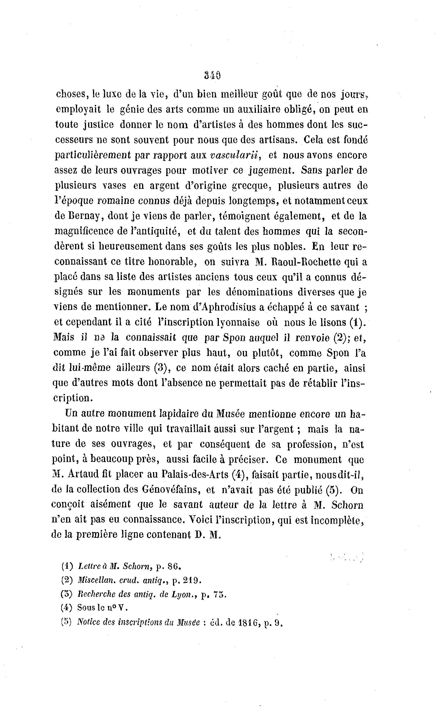 849 choses, le luxe de la vie, d'un bien meilleur goût que de nos jours» employait le génie des arts comme un auxiliaire obligé, on peut en toute justice donner le nom d'artistes à des hommes dont les suc- cesseurs ne sont souvent pour nous que des artisans. Cela est fondé particulièrement par rapport aux vascularii, et nous avons encore assez de leurs ouvrages pour motiver ce jugement. Sans parler de plusieurs vases en argent d'origine grecque, plusieurs autres de l'époque romaine connus déjà depuis longtemps, et notamment ceux de Bernay, dont je viens de parler, témoignent également, et de la magnificence de l'antiquité, et du talent des hommes qui la secon- dèrent si heureusement dans ses goûts les plus nobles. En leur re- connaissant ce titre honorable, on suivra M. Raoul-Rochette qui a placé dans sa liste des artistes anciens tous ceux qu'il a connus dé- signés sur les monuments par les dénominations diverses que je viens de mentionner. Le nom d'Àphrodisius a échappé à ce savant ; et cependant il a cité l'inscription lyonnaise où nous le lisons (1). Mais il nâ la connaissait que par Spon auquel il renvoie (2); et, comme je l'ai fait observer plus haut, ou plutôt, comme Spon l'a dit lui-môme ailleurs (3), ce nom était alors caché en partie, ainsi que d'autres mots dont l'absence ne permettait pas de rétablir l'ins- cription. Un autre monument lapidaire du Musée mentionne encore un ha- bitant de notre ville qui travaillait aussi sur l'argent ; mais la na- ture de ses ouvrages, et par conséquent de sa profession, n'est point, à beaucoup près, aussi facile à préciser. Ce monument que M. Artaud fit placer au Palais-des-Arts (4), faisait partie, nousdit-il, de la collection des Génovéfains, et n'avait pas été publié (5). On conçoit aisément que le savant auteur de la lettre à M. Schorn n'en ait pas eu connaissance. Voici l'inscription, qui est incomplète, de la première ligne contenant D. M. (1) Lettre à M. Schorn, p. 86. (2) Miscellan. erud. antiq., p. 219. (3) Recherche des antiq. de Lyon,, p, 75. (4) Sous le n° V. (5) Notice des inscriptions du Musée : éd. de 1816, p. 9.