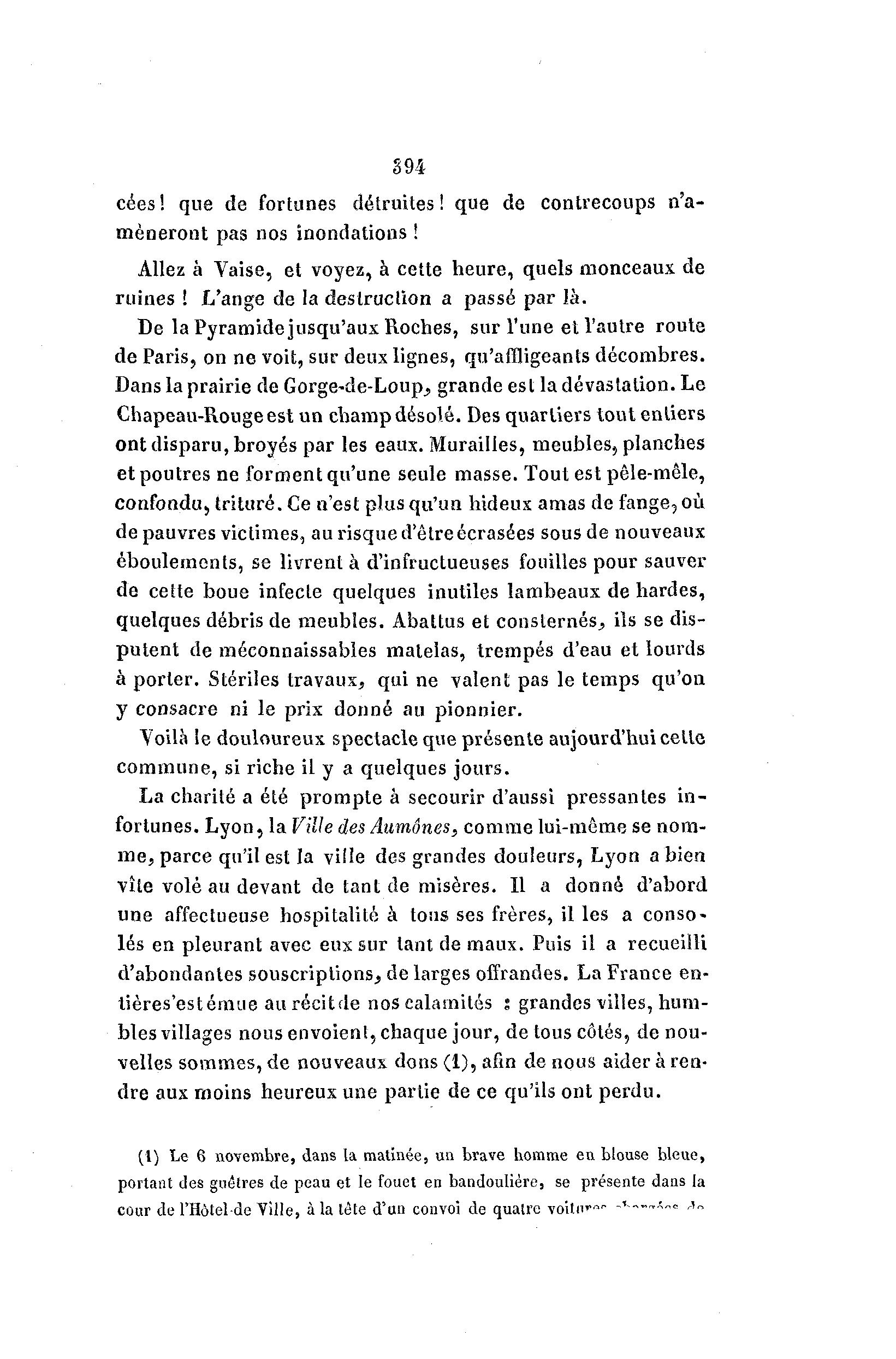 894 cées ! que de fortunes détruites ! que de contrecoups n'a- mèneront pas nos inondations ! Allez à Vaise, et voyez, à cette heure, quels monceaux de ruines ! L'ange de la destruction a passé par là . De la Pyramide jusqu'aux Roches, sur l'une et l'autre route de Paris, on ne voit, sur deux lignes, qu'affligeants décombres. Dans la prairie de Gorge-de-Loup, grande est la dévastation. Le Chapeau-Rouge est un champ désolé. Des quartiers tout entiers ont disparu, broyés par les eaux. Murailles, meubles, planches et poutres ne forment qu'une seule masse. Tout est pêle-mêle, confondu, trituré. Ce n'est plus qu'un hideux amas de fange, où de pauvres victimes, au risque d'ètreécrasées sous de nouveaux èboulements, se livrent à d'infructueuses fouilles pour sauver de cette boue infecte quelques inutiles lambeaux de hardes, quelques débris de meubles. Abattus et consternés, ils se dis- putent de méconnaissables matelas, trempés d'eau et lourds à porter. Stériles travaux, qui ne valent pas le temps qu'on y consacre ni le prix donné au pionnier. Yoilà le douloureux spectacle que présente aujourd'hui celle commune, si riche il y a quelques jours. La charité a été prompte à secourir d'aussi pressantes in- fortunes. Lyon, la Ville des Aumônes, comme lui-même se nom- me, parce qu'il est la ville des grandes douleurs, Lyon a bien vite volé au devant de tant de misères. Il a donné d'abord une affectueuse hospitalité à tons ses frères, il les a conso- lés en pleurant avec eux sur tant de maux. Puis il a recueilli d'abondantes souscriptions, de larges offrandes. La France en- tières'estémue aurécitde nos calamités i grandes villes, hum- bles villages nous envoient, chaque jour, de tous côtés, de nou- velles sommes, de nouveaux dons (1), afin de nous aider à ren- dre aux moins heureux une partie de ce qu'ils ont perdu. (1) Le 6 novembre, dans la matinée, un brave homme en blouse bleue, portant des guêtres de peau et le fouet en bandoulière, se présente dans la cour de PHotel-de Ville, à la tète d'un convoi de quatre voitn»'"'" -*-•>--<-« J «