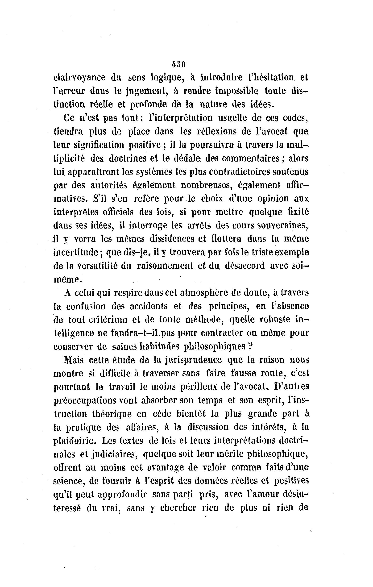 430 clairvoyance du sens logique, h introduire l'hésitation et l'erreur dans le jugement, à rendre impossible toute dis- tinction réelle et profonde de la nature des idées. Ce n'est pas tout: l'interprétation usuelle de ces codes, tiendra plus de place dans les réflexions de l'avocat que leur signification positive ; il la poursuivra à travers la mul- tiplicité des doctrines et le dédale des commentaires ; alors lui apparaîtront les systèmes les plus contradictoires soutenus par des autorités également nombreuses, également affir- matives. S'il s'en réfère pour le choix d'une opinion aux interprêtes officiels des lois, si pour mettre quelque fixité dans ses idées, il interroge les arrêts des cours souveraines, il y verra les mêmes dissidences et flottera dans la même incertitude ; que dis-je, il y trouvera par fois le triste exemple de la versatilité du raisonnement et du désaccord avec soi- même. Â celui qui respire dans cet atmosphère de doute, à travers la confusion des accidents et des principes, en l'absence de tout critérium et de toute méthode, quelle robuste in- telligence ne faudra-t-il pas pour contracter ou même pour conserver de saines habitudes philosophiques ? Mais cette étude de la jurisprudence que la raison nous montre si difficile à traverser sans faire fausse route, c'est pourtant le travail le moins périlleux de l'avocat. D'autres préoccupations vont absorber son temps et son esprit, l'ins- truction théorique en cède bientôt la plus grande part â la pratique des affaires, à la discussion des intérêts, à la plaidoirie. Les textes de lois et leurs interprétations doctri- nales et judiciaires, quelque soit leur mérite philosophique, offrent au moins cet avantage de valoir comme faits d'une science, de fournir à l'esprit des données réelles et positives qu'il peut approfondir sans parti pris, avec l'amour désin- téressé du vrai, sans y chercher rien de plus ni rien de