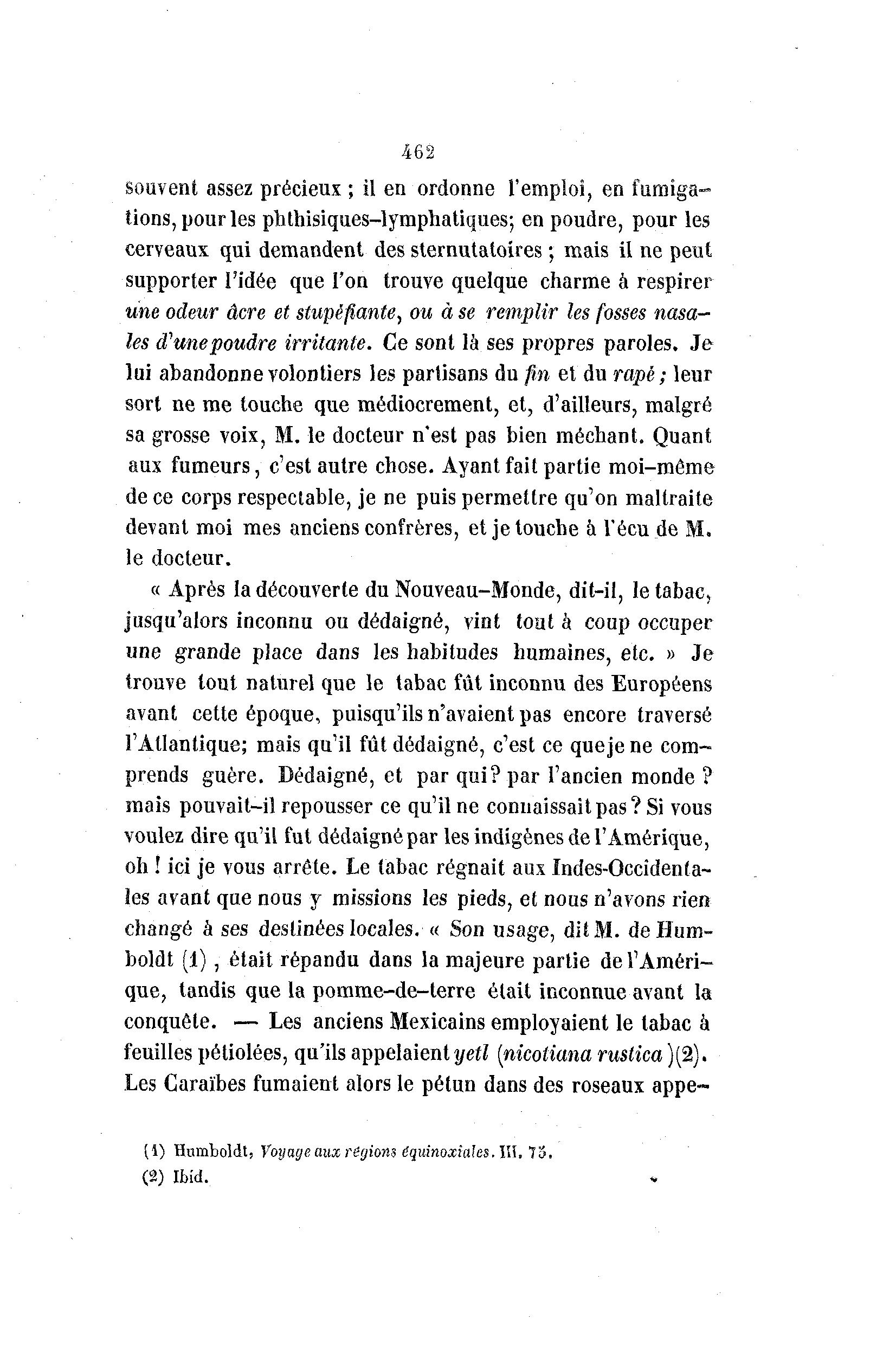 462 souvent assez précieux ; il en ordonne l'emploi, en fumiga- tions, pour les phthisiques-lymphatiques; en poudre, pour les cerveaux qui demandent des sternutatoires ; mais il ne peut supporter l'idée que l'on trouve quelque charme à respirer une odeur acre et stupéfiante, ou à se remplir les fosses nasa- les d'unepoudre irritante. Ce sont là ses propres paroles. Je lui abandonne volontiers les partisans du fin et du râpé ; leur sort ne me touche que médiocrement, et, d'ailleurs, malgré sa grosse voix, M. le docteur n'est pas bien méchant. Quant aux fumeurs, c'est autre chose. Ayant fait partie moi-même de ce corps respectable, je ne puis permettre qu'on maltraite devant moi mes anciens confrères, et je touche à l'écu de M. le docteur. « Après la découverte du Nouveau-Monde, dit-il, le tabac, jusqu'alors inconnu ou dédaigné, vint tout à coup occuper une grande place dans les habitudes humaines, etc. » Je trouve tout naturel que le tabac fût inconnu des Européens avant cette époque, puisqu'ils n'avaient pas encore traversé l'Atlantique; mais qu'il fût dédaigné, c'est ce queje ne com- prends guère. Dédaigné, et par qui? par l'ancien monde ? mais pouvait-il repousser ce qu'il ne connaissait pas? Si vous voulez dire qu'il fut dédaigné par les indigènes de l'Amérique, oh ! ici je vous arrête. Le tabac régnait aux Indes-Occidenta- les avant que nous y missions les pieds, et nous n'avons rien changé à ses destinées locales. « Son usage, dit M. deHum- boldt (1) , était répandu dans la majeure partie de l'Améri- que, tandis que la pomme-de-terre était inconnue avant la conquête. — Les anciens Mexicains employaient le tabac à feuilles pétiolées, qu'ils appelaientyetl [nicotiana rustica)[2). Les Caraïbes fumaient alors le pétun dans des roseaux appe~ (1) Humboldtj Voyage aux régions équinoxiales. Î5i, ^§. (2) Ibid.