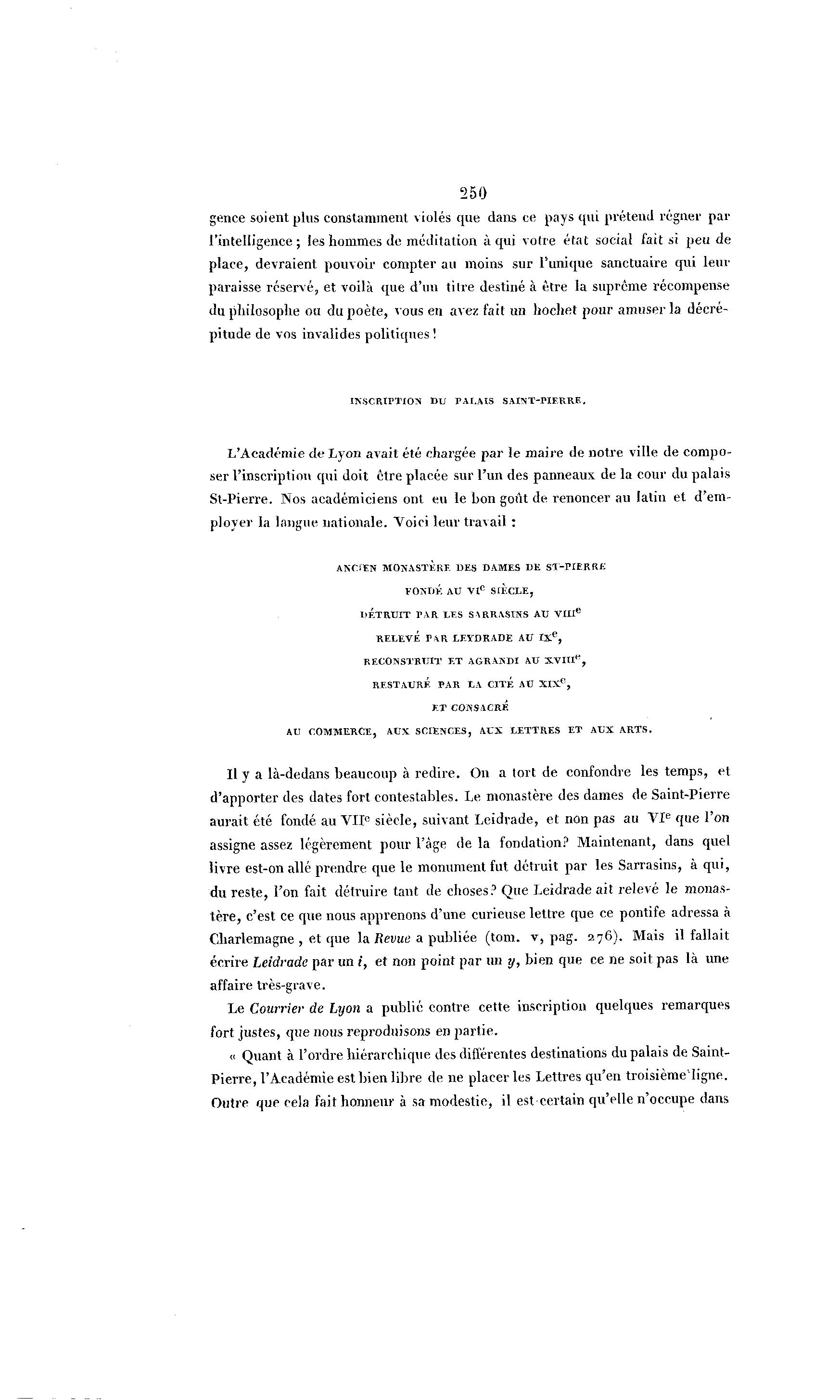 Le Courrier de Lyon a publié contre cette inscription quelques remarques