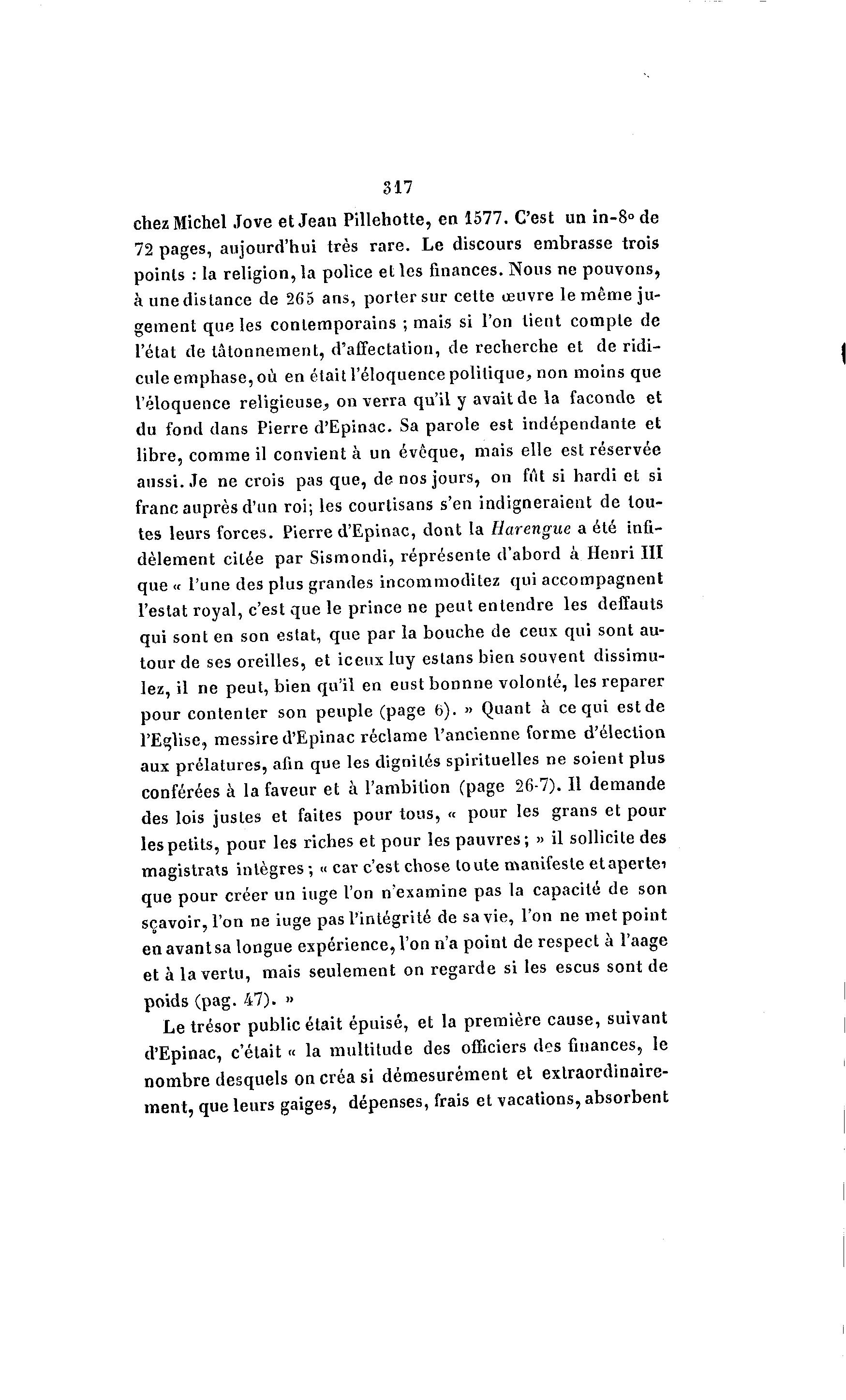 317 chez Michel Jove et Jean Pillehotte, en 1577. C'est un in-8° de 72 pages, aujourd'hui très rare. Le discours embrasse trois points : la religion, la police et les finances. Nous ne pouvons, à une distance de 265 ans, porter sur cette oeuvre le même ju- gement que les contemporains ; mais si l'on tient compte de l'état de tâtonnement, d'affectation, de recherche et de ridi- cule emphase, où en était l'éloquence politique, non moins que l'éloquence religieuse^ on verra qu'il y avait de la faconde et du fond dans Pierre d'Epinac. Sa parole est indépendante et libre, comme il convient à un évêque, mais elle est réservée aussi. Je ne crois pas que, de nos jours, on fût si hardi et si franc auprès d'un roi; les courtisans s'en indigneraient de tou- tes leurs forces. Pierre d'Epinac, dont la Harengue a été infi- dèlement citée par Sismondi, réprésente d'abord à Henri III que « l'une des plus grandes incommoditez qui accompagnent Testât royal, c'est que le prince ne peut entendre les deffauts qui sont en son estât, que par la bouche de ceux qui sont au- tour de ses oreilles, et iceux luy estans bien souvent dissimu- lez, il ne peut, bien qu'il en e u s t b o n n n e volonté, les reparer pour contenter son peuple (page 6). » Quant à ce qui e s t d e l'Eglise, messire d'Epinac réclame l'ancienne forme d'élection aux prélatures, afin que les dignités spirituelles ne soient plus conférées à la faveur et à l'ambition (page 26-7). Il demande des lois justes et faites pour tous, « pour les gratis et pour les petits, pour les riches et pour les pauvres ; » il sollicite des magistrats intègres ; « car c'est chose toute manifeste etapertei que pour créer un iuge l'on n'examine pas la capacité de son sçavoir,l'on ne iuge pas l'intégrité de sa vie, l'on ne met point en avant sa longue expérience, Von n'a point de respect à l'aage et à la vertu, mais seulement on regarde si les escus sont de poids (pag. 47). » Le trésor public était épuisé, et la première cause, suivant d'Epinac, c'était « la multitude des officiers des finances, le nombre desquels on créa si démesurément et extraordinaire- ment, que leurs gaiges, dépenses, frais et vacations, absorbent