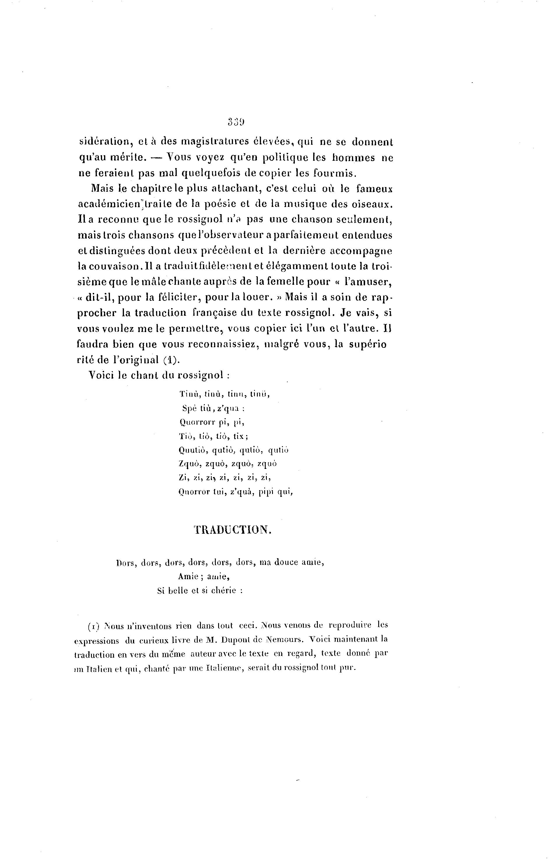 33i) sidéralion, et à des magistratures élevées, qui ne se donnent qu'au mérite. — Vous voyez qu'en politique les hommes ne ne feraient pas mal quelquefois de copier les fourmis. Mais le chapitre le plus attachant, c'est celui où le fameux académicien'traile de la poésie et de la musique des oiseaux, l i a reconnu que le rossignol n'a pas une chanson seulement, mais trois chansons que l'observateur a parfaitement entendues et distinguées dont deux précèdent et la dernière accompagne la couvaison.il a traduit fidèlement et élégamment toute la troi- sième que le mâle chante auprès de la femelle pour « l'amuser, « dit-il, pour la féliciter, pour la louer. » Mais il a soin de rap- procher la traduction française du texte rossignol. Je vais, si vous voulez me le permettre, vous copier ici l'un et l'autre. Il faudra bien que vous reconnaissiez, malgré vous, la supério rite de l'original (1). Voici le chant du rossignol : Tinù, tiuù, tinu, tinù, Spè tiù , z'qua : Quorrorr pi, pi, Tio, tiô, tiô, lix ; Quutiô, qutiô, quliô, qutiô Zquô, zquô, zquô, zquô Zi, zi, zi} zi, zi, zi, zi, QnoiTOr tui, z'quà , pipi qui, TRADUCTION. Dors, dors, dors, dors, dors, dors, ma douce aune, Amie ; amie, Si belle et si chérie : ( i l Nous n'inventons rien dans tout ceci. ASOUS venons de reproduire les expressions du curieux livre de M . Dupoul de Nemours. Voici maintenant la traduction en vers du même auteur avec le texte en regard, texte donné par rai Italien el qui, citante par une Italienne, serait du rossignol tout pur.