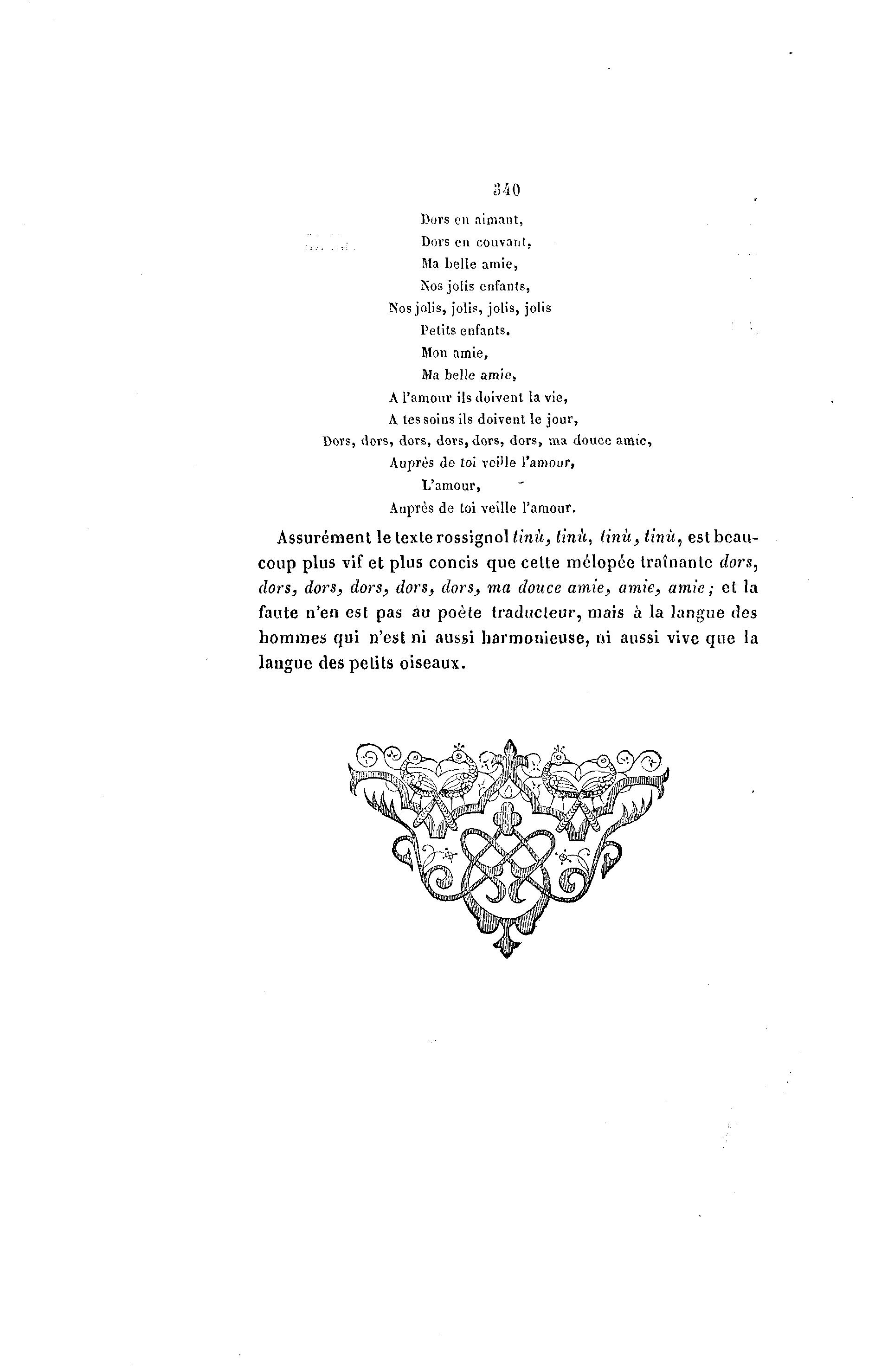 340 Dors en aimant, Dors en couvant, Ma belle amie, Nos jolis enfants, Nos jolis, jolis, jolis, jolis Petits enfants. Mon amie, Ma belle amie, A l'amour ils doivent la vie, A tes soins ils doivent le jour, Dors, dors, dors, dors, dors, dors, ma douée amie, Auprès do toi veille l'amour, L'amour, Auprès de toi veille l'amour. Assurément le texte rossignol tinù, tinù, tinù, tinù, est beau- coup plus vif et plus concis que cette mélopée traînante dors, dors, dors, dors, dors, dors, ma douce amie, amie, amie; et la faute n'en est pas au poète traducteur, mais à la langue des hommes qui n'est ni aussi harmonieuse, ni aussi vive que la langue des petits oiseaux.