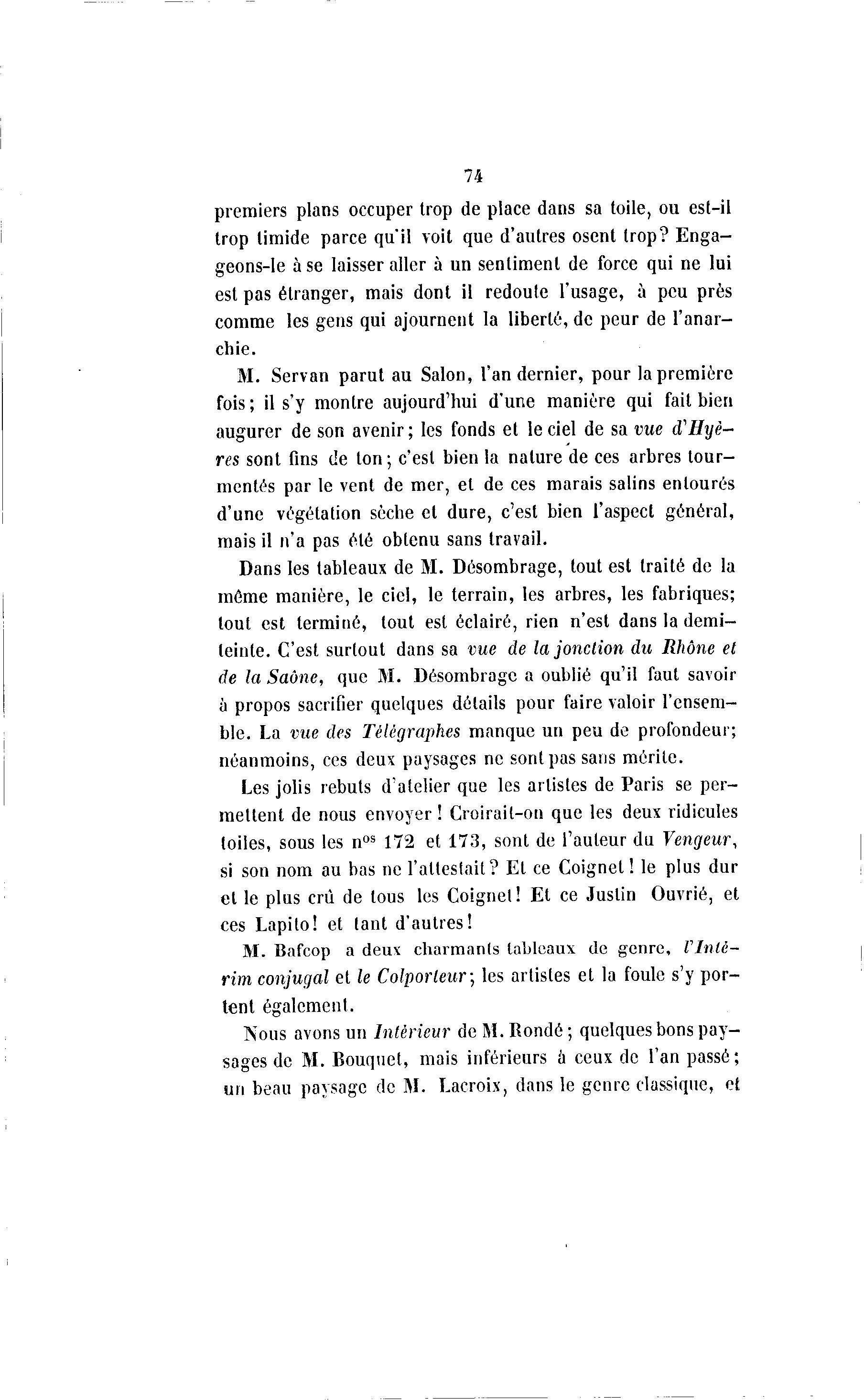 74 premiers plans occuper trop de place dans sa toile, ou est-il trop timide parce qu'il voit que d'autres osent trop? Enga- geons-le à se laisser aller à un sentiment de force qui ne lui est pas étranger, mais dont il redoute l'usage, à peu près comme les gens qui ajournent la liberté, de peur de l'anar- chie. M. Servan parut au Salon, l'an dernier, pour la première fois ; il s'y montre aujourd'hui d'une manière qui fait bien augurer de son avenir ; les fonds et le ciel de sa vue d'Hyè- res sont fins de ton; c'est bien la nature de ces arbres tour- mentés par le vent de mer, el de ces marais salins entourés d'une végétation sèche et dure, c'est bien l'aspect général, mais il n'a pas été obtenu sans travail. Dans les tableaux de M. Dôsombrage, tout est traité de la même manière, le ciel, le terrain, les arbres, les fabriques; tout est terminé, tout est éclairé, rien n'est dans la demi- teinte. C'est surtout dans sa vue de la jonction du Rhône et de la Saône, que M. Désombragc a oublié qu'il faut savoir à propos sacrifier quelques détails pour faire valoir l'ensem- ble. La vue des Télégraphes manque un peu de profondeur; néanmoins, ces deux paysages ne sont pas sans mérite. Les jolis rebuts d'atelier que les artistes de Paris se per- mettent de nous envoyer ! Croirait-on que les deux ridicules toiles, sous les n os 172 et 173, sont de l'auteur du Vengeur, si son nom au bas ne l'attestait? Et ce Coignet ! le plus dur el le plus crû de tous les Coignel! Et ce Justin Ouvrié, et ces Lapito! et tant d'autres! M. Bafcop a deux charmants tableaux de genre, VInté- rim conjugal et le Colporteur; les artistes et la foule s'y por- tent également. Nous avons un Intérieur de M. Rondo ; quelques bons pay- sages de M. Bouquet, mais inférieurs à ceux de l'an passé; un beau paysage de M. Lacroix, dans le genre classique, et