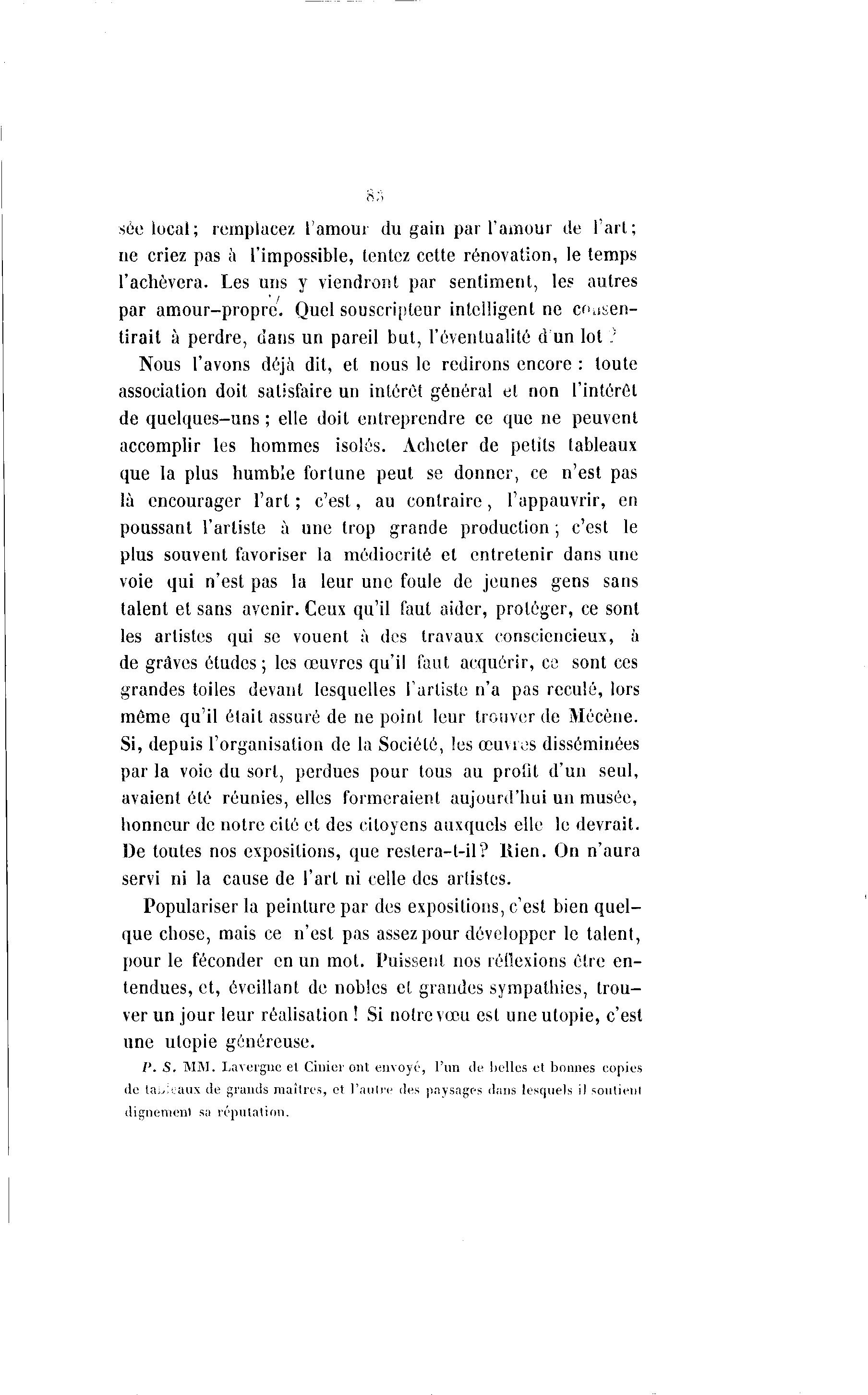 sec local; remplacez l'amour du gain par l'amour de l'art; ne criez pas à l'impossible, tentez cette rénovation, le temps l'achèvera. Les uns y viendront par sentiment, les autres par amour-propre. Quel souscripteur intelligent ne consen- tirait à perdre, dans un pareil but, l'éventualité d'un lot ? Nous l'avons déjà dit, et nous le redirons encore : toute association doit satisfaire un intérêt général et non l'intérêt de quelques-uns ; elle doit entreprendre ce que ne peuvent accomplir les hommes isolés. Acheter de petits tableaux que la plus humble fortune peut se donner, ce n'est pas là encourager l'art ; c'est, au contraire, l'appauvrir, en poussant l'artiste à une trop grande production ; c'est le plus souvent favoriser la médiocrité et entretenir dans une voie qui n'est pas la leur une foule de jeunes gens sans talent et sans avenir. Ceux qu'il faut aider, proléger, ce sont les artistes qui se vouent à des travaux consciencieux, à de graves études; les œuvres qu'il faut acquérir, ce sont ces grandes toiles devant lesquelles l'artiste n'a pas reculé, lors môme qu'il était assuré de ne point leur trouver de Mécène. Si, depuis l'organisation de la Société, les œuvios disséminées par la voie du sort, perdues pour tous au proiit d'un seul, avaient été réunies, elles formeraient aujourd'hui un musée, honneur de notre cité et des citoyens auxquels elle le devrait. De toutes nos expositions, que restera-t-il? Rien. On n'aura servi ni la cause de l'art ni celle des artistes. Populariser la peinture par des expositions, c'est bien quel- que chose, mais ce n'est pas assez pour développer le talent, pour le féconder en un mot. Puissent nos réflexions être en- tendues, et, éveillant de nobles et grandes sympathies, trou- ver un jour leur réalisation ! Si notre vœu est une utopie, c'est une utopie généreuse. P. S. MM. Lavcrgiic el Cinier ont envoyé, l'un de belles et bonnes copies de ta;,:oaux de grands maîtres, et l'aulre des paysages dans lesquels il soutien! dignement sa réputation.