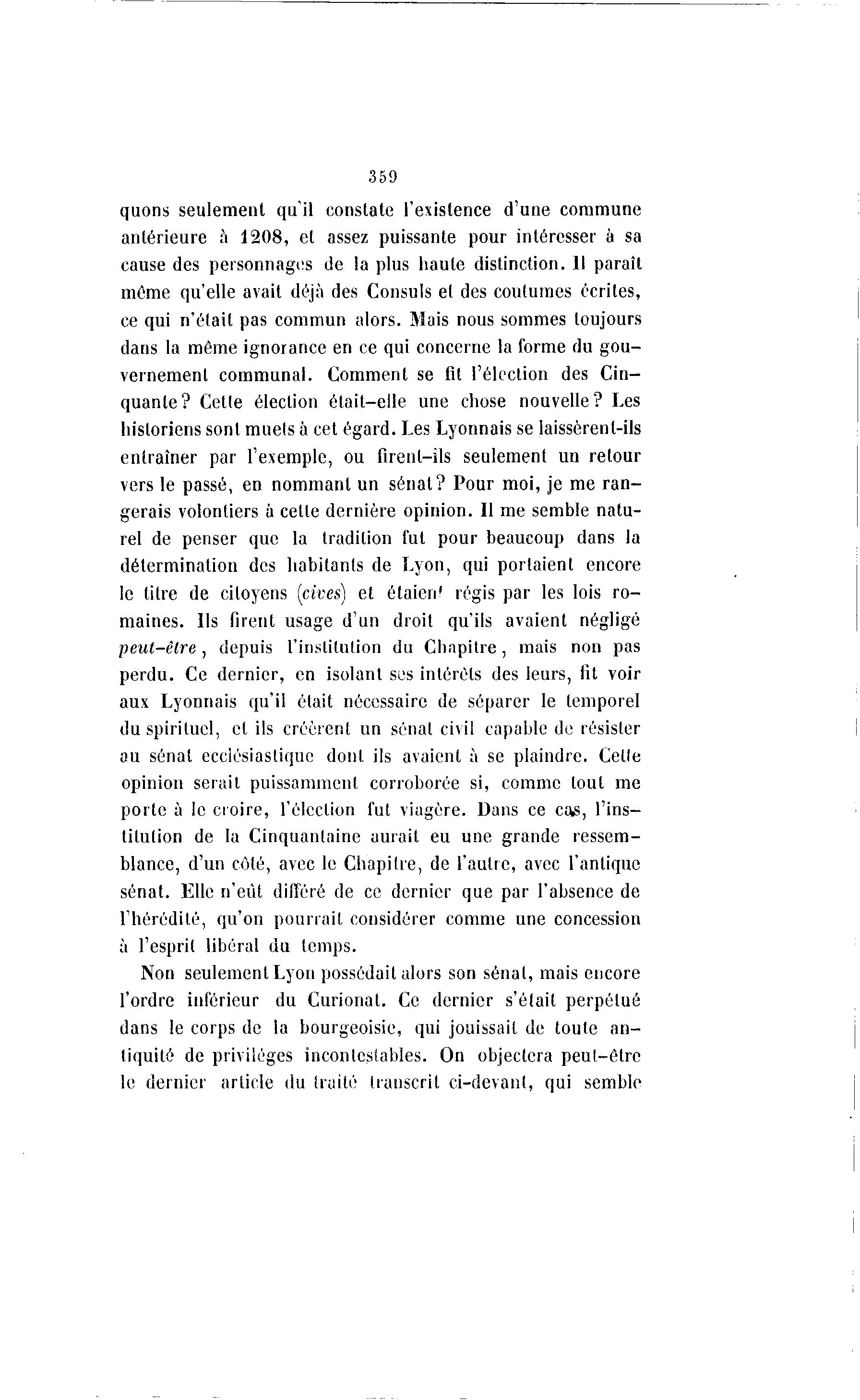 359 quons seulement qu'il constate l'existence d'une commune antérieure à 1208, et assez puissante pour intéresser à sa cause des personnages de la plus haute distinction. Il paraît môme qu'elle avait déjà des Consuls et des coutumes écrites, ce qui n'était pas commun alors. Mais nous sommes toujours dans la même ignorance en ce qui concerne la forme du gou- vernement communal. Comment se fit l'élection des Cin- quante? Cette élection était-elle une chose nouvelle? Les historiens sont muets à cet égard. Les Lyonnais se laissèrent-ils entraîner par l'exemple, ou firent-ils seulement un retour vers le passé, en nommant un sénat? Pour moi, je me ran- gerais volontiers à cette dernière opinion. Il me semble natu- rel de penser que la tradition fut pour beaucoup dans la détermination des habitants de Lyon, qui portaient encore le titre de citoyens [cives) et ôtaien' régis par les lois ro- maines. Ils firent usage d'un droit qu'ils avaient négligé peut-être, depuis l'institution du Chapitre, mais non pas perdu. Ce dernier, en isolant ses intérêts des leurs, fit voir aux Lyonnais qu'il était nécessaire de séparer le temporel du spirituel, et ils créèrent un sénat civil capable de résister au sénat ecclésiastique dont ils avaient à se plaindre. Celle opinion serait puissamment corroborée si, comme tout me porte à le croire, l'élection fut viagère. Dans ce ca£, l'ins- titution de la Cinquantaine aurait eu une grande ressem- blance, d'un côté, avec le Chapitre, de l'autre, avec l'antique sénat. Elle n'eût différé de ce dernier que par l'absence de l'hérédité, qu'on pourrait considérer comme une concession à l'esprit libéral du temps. Non seulement Lyon possédait alors son sénat, mais encore l'ordre inférieur du Curionat. Ce dernier s'était perpétué dans le corps de la bourgeoisie, qui jouissait de toute an- tiquité de privilèges incontestables. On objectera peut-être le dernier article du traité transcrit ci-devant, qui semble