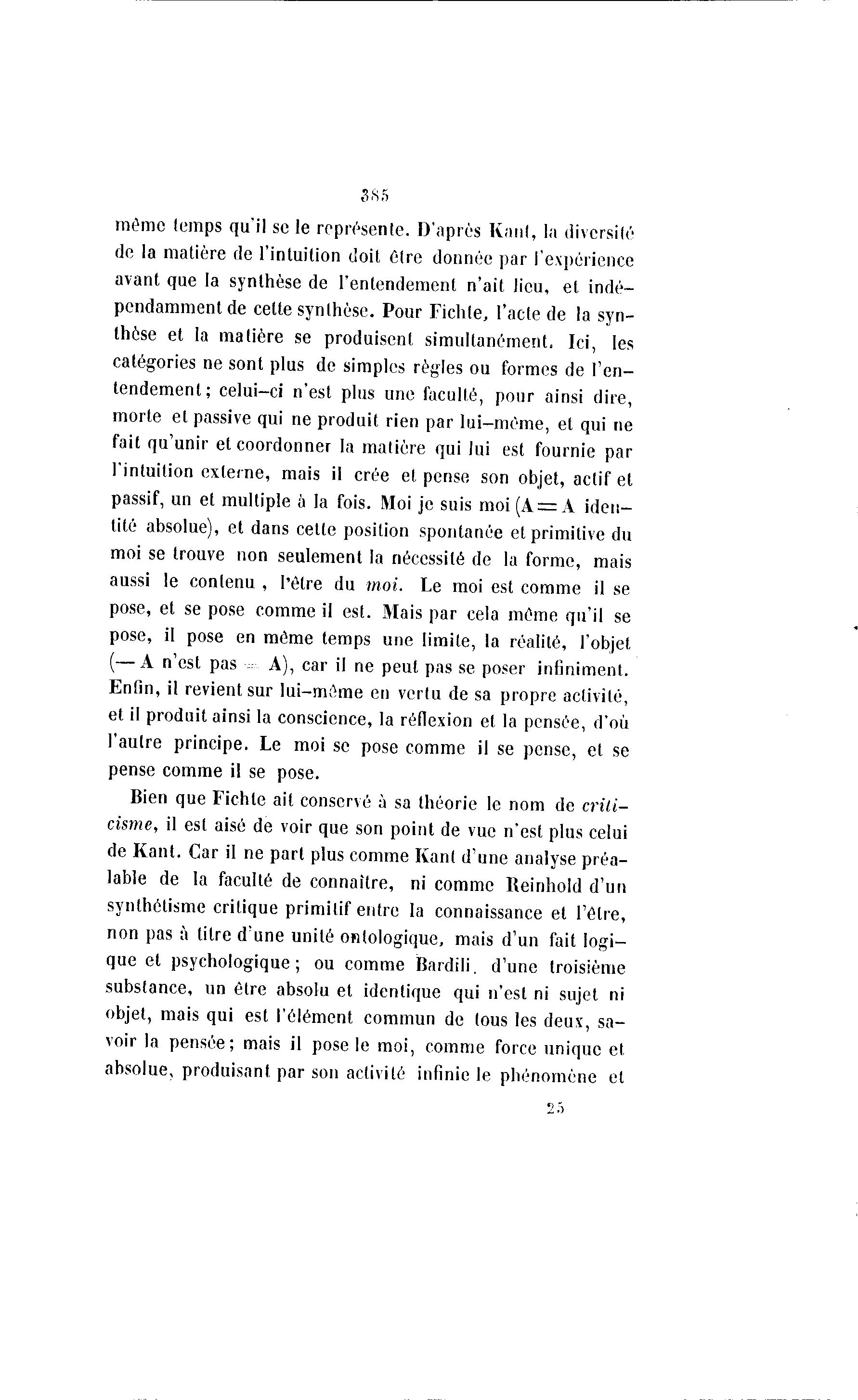S8S même temps qu'il se le représente. D'après Ivanl, la diversité de la matière de l'intuition doit être donnée par l'expérience avant que la synthèse de l'entendement n'ait lieu, et indé- pendamment de cette synthèse. Pour Fichle, l'acte de la syn- thèse et la matière se produisent simultanément. Ici, les catégories ne sont plus de simples règles ou formes de l'en- tendement; celui-ci n'est plus une faculté, pour ainsi dire, morte et passive qui ne produit rien par lui-même, et qui ne fait qu'unir et coordonner la matière qui lui est fournie par l'intuition externe, mais il crée et pense son objet, actif et passif, un et multiple à la fois. Moi je suis moi (A = A iden- tité absolue), et dans cette position spontanée et primitive du moi se trouve non seulement la nécessité de la forme, mais aussi le contenu , l'être du moi. Le moi est comme il se pose, et se pose comme il est. Mais par cela même qu'il se pose, il pose en même temps une limite, la réalité, l'objet (—A n'est pas ^ A), car il ne peut pas se poser infiniment. Enfin, il revient sur lui-même en vertu de sa propre activité, et il produit ainsi la conscience, la réflexion et la pensée, d'où l'autre principe. Le moi se pose comme il se pense, et se pense comme il se pose. Bien que Fichte ait conservé à sa théorie le nom de crili- cisme, il est aisé de voir que son point de vue n'est plus celui de Kant. Car il ne part plus comme Kant d'une analyse préa- lable de la faculté de connaître, ni comme Reinhold d'un synthétisme critique primitif entre la connaissance et l'être, non pas à titre d'une unité ontologique, mais d'un fait logi- que et psychologique; ou comme Bardili. d'une troisième substance, un être absolu et identique qui n'est ni sujet ni objet, mais qui est l'élément commun de tous les deux, sa- voir la pensée; mais il pose le moi, comme force unique et absolue, produisant par son activité infinie le phénomène et