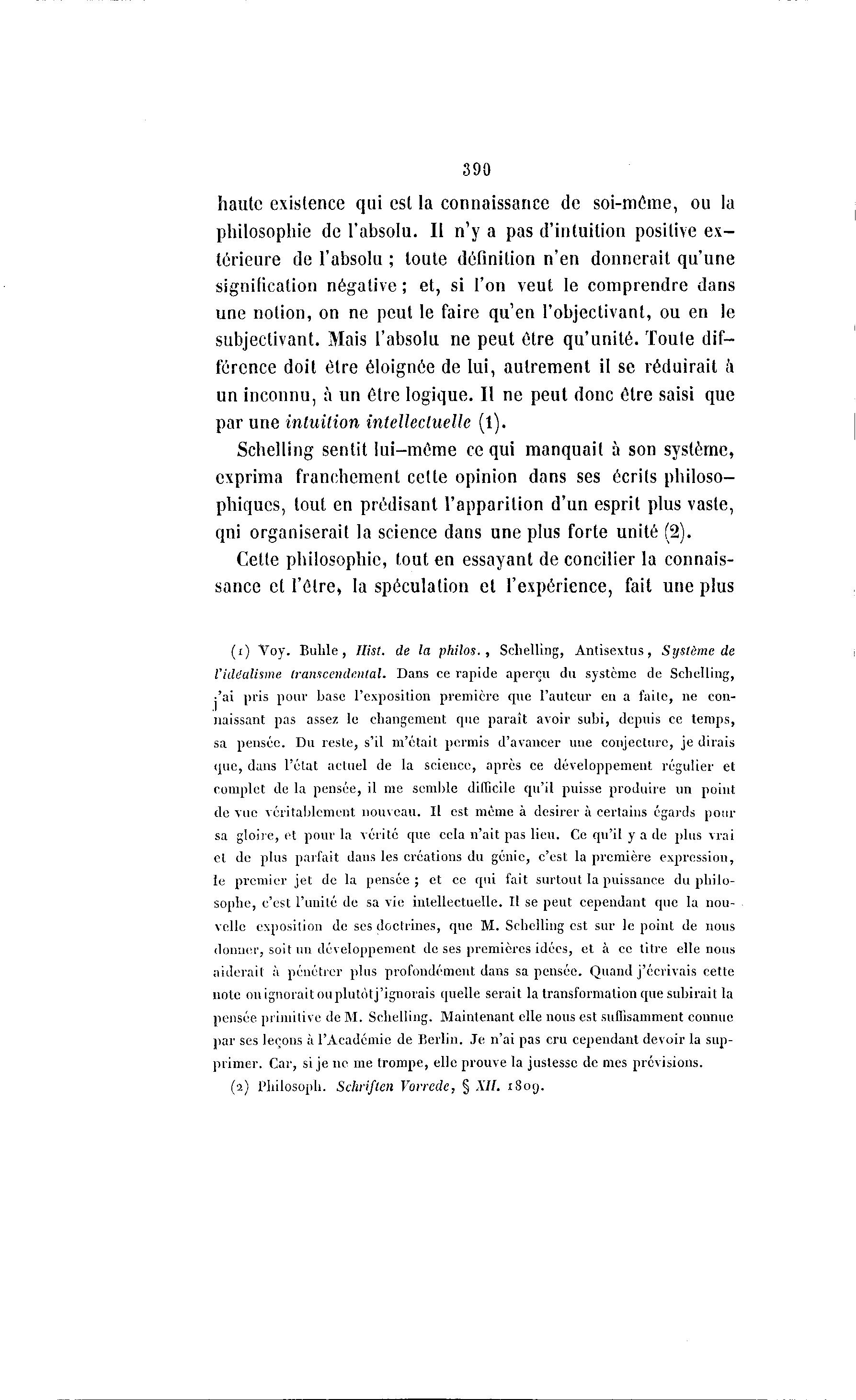 390 haute existence qui esl la connaissance de soi-même, ou la philosophie de l'absolu. Il n'y a pas d'intuition positive ex- térieure de l'absolu ; toute définition n'en donnerait qu'une signification négative ; et, si l'on veut le comprendre dans une notion, on ne peut le faire qu'en l'objectivant, ou en le subjectivant. Mais l'absolu ne peut être qu'unité. Toute dif- férence doit être éloignée de lui, autrement il se réduirait à un inconnu, à un être logique. Il ne peut donc être saisi que par une intuition intellectuelle (1). Schelling sentit lui-même ce qui manquait à son système, exprima franchement celle opinion dans ses écrits philoso- phiques, tout en prédisant l'apparition d'un esprit plus vaste, qni organiserait la science dans une plus forte unité (2). Cette philosophie, tout en essayant de concilier la connais- sance et l'être, la spéculation et l'expérience, fait une plus ( i ) Voy. Bulile, Itist. de la philos., Schelling, Antisextus, Système de l'idéalisme Iranscendental. Dans ce rapide aperçu du système de Schelling, :'ai pris pour base l'exposition première que l'auteur en a faite, ne con- naissant pas assez le changement que paraît avoir subi, depuis ce temps, sa pensée. Du reste, s'il m'était permis d'avancer nue conjecture, je dirais que, dans l'état actuel de la science, après ce développement régulier et complet de la pensée, il me semble difficile qu'il puisse produire un point de vue véritablement nouveau. Il est même à désirer à certains égards pour sa gloire, et pour la vérité que cela n'ait pas lieu. Ce qu'il y a de plus vrai et de plus parfait dans les créations du génie, c'est la première expression, le premier jet de la pensée ; et ce qui fait surtout la puissance du philo- sophe, c'est l'unité de sa vie intellectuelle. Il se peut cependant que la nou- velle exposition de ses doctrines, que M . Schelling est sur le point de nous donner, soit un développement de ses premières idées, et à ce titre elle nous aiderait à pénétrer plus profondément dans sa pensée. Quand j'écrivais cette note on ignorait ouplutôtj'ignorais quelle serait la transformation que subirait la pensée primitive de M. Schelling. Maintenant elle nous est suffisamment connue par ses leçons à l'Académie de Berlin. Je n'ai pas cru cependant devoir la sup- primer. Car, si je ne nie trompe, elle prouve la justesse de mes prévisions. (a) Philosoph. Schriflen Vorredc, § XII. iSoo..