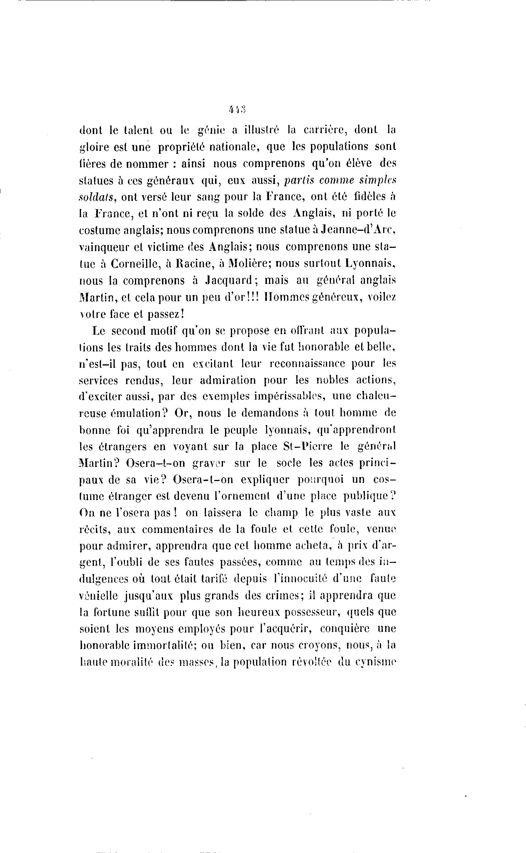 4*i 3 dont le talent ou le génie a illustré la carrière, dont la gloire est une propriété nationale, que les populations sont (ières de nommer : ainsi nous comprenons qu'on élève des statues à ces généraux qui, eux aussi, partis comme simples soldais, ont versé leur sang pour la France, ont été fidèles a la France, et n'ont ni reçu la solde des Anglais, ni porté le costume anglais; nous comprenons une statue à Jeanne-d'Arc, vainqueur et victime des Anglais; nous comprenons une sta- tue à Corneille, à Racine, à Molière; nous surtout Lyonnais, nous la comprenons à Jacquard; mais au général anglais Martin, et cela pour un peu d'or!!! Hommes généreux, voilez votre face et passez! Le second motif qu'on se propose en offrant aux popula- tions les traits des hommes dont la vie fut honorable et belle, n'est—il pas, tout en excitant leur reconnaissance pour les services rendus, leur admiration pour les nobles actions, d'exciter aussi, par des exemples impérissables, une chaleu- reuse émulation? Or, nous le demandons à tout homme de bonne foi qu'apprendra le peuple lyonnais, qu'apprendront les étrangers en voyant sur la place Sl-l'ierre le général Martin? Osera-t-on graver sur le socle les actes princi- paux de sa vie? Osera-t-on expliquer pourquoi un cos- tume étranger est devenu l'ornement d'une place publique? On ne l'osera pas ! on laissera le champ le plus vaste aux récits, aux commentaires de la foule et cette foule, venue pour admirer, apprendra que cet homme acheta, à prix d'ar- gent, l'oubli de ses fautes passées, comme au temps des in- dulgences où tout était tarifé depuis l'innocuité d'une faute vénielle jusqu'aux plus grands des crimes; i! apprendra que la fortune suffit pour que son heureux possesseur, quels que soient les moyens employés pour l'acquérir, conquière une honorable immortalité; ou bien, car nous croyons, nous, à la haute moralité des masses, la population révoltée du cynisme
