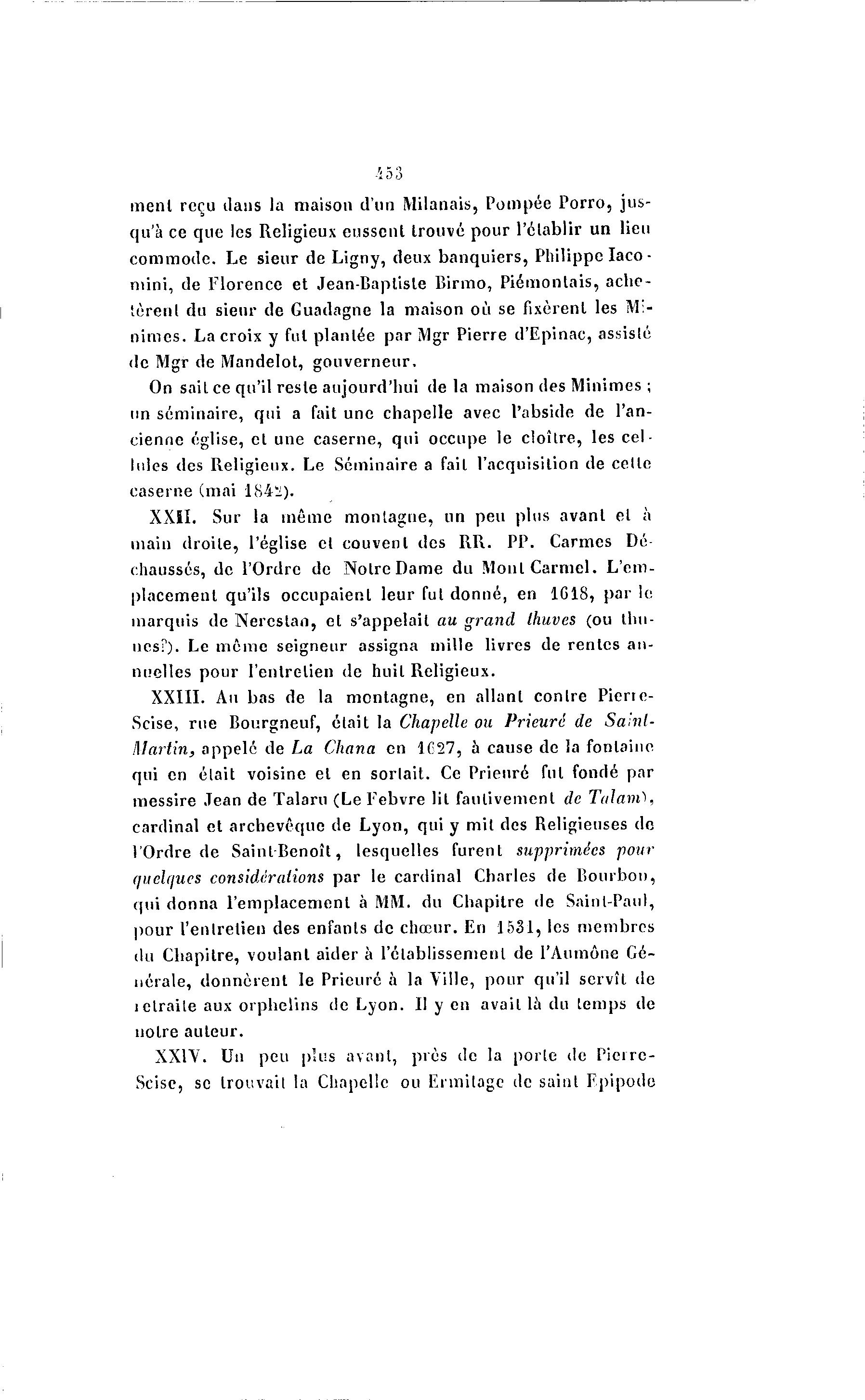 i53 ment reçu dans la maison d'un Milanais, Pompée Porro, jus- qu'à ce que les Religieux eussent trouvé pour l'établir un lieu commode. Le sieur de Ligny, deux banquiers, Philippe Iaco- mini, de Florence et Jean-P>aptisle Birmo, Piémontais, ache- tèrent du sieur de Guadagne la maison où se fixèrent les Mi- nimes. La croix y fui plantée par Mgr Pierre d'Epinac, assisté de Mgr de Mandelot, gouverneur. On sailce qu'il reste aujourd'hui de la maison des Minimes ; un séminaire, qui a fait une chapelle avec l'abside de l'an- cienne église, et une caserne, qui occupe le cloître, les cel- lules des Religieux. Le Séminaire a fait l'acquisition de celte caserne (mai 184'i). XXII. Sur la même montagne, un peu plus avant el à main droite, l'église el couvent des RR. PP. Carmes Dé- chaussés, de l'Ordre de Notre Dame du Monl Carmcl. L'em- placement qu'ils occupaient leur fut donné, en 1G18, par le marquis de Nercslan, et s'appelait au grand Ihuves (ou thu- nes?). Le même seigneur assigna mille livres de rentes an- nuelles pour l'entretien de huit Religieux. XXIII. Au bas de la montagne, en allant conlre Pierrc- Scise, rue Bourgneuf, élait la Chapelle ou Prieuré de Saint- Martin, appelé de La Ghana en 1C27, à cause de la fontaine qui en élait voisine el en sorlait. Ce Prieuré fut fondé par messire Jean de Talaru (Le Febvre lit fautivement de Talamî, cardinal et archevêque de Lyon, qui y mil des Religieuses de l'Ordre de Saint-Benoît, lesquelles furent supprimées pour quelques considérations par le cardinal Charles de Bourbon, qui donna l'emplacement à MM. du Chapitre de Saint-Paul, pour l'entretien des enfants de chœur. En 1531, les membres du Chapitre, voulant aider à l'établissement de l'Aumône Gé- nérale, donnèrent le Prieuré à la Ville, pour qu'il servît de îetraile aux orphelins de Lyon. Il y en avait la du temps de notre auteur. XXIV. Un peu plus avant, près de la porle de Pieire- Scise, se trouvait la Chapelle ou Ermitage de saint Fpipode
