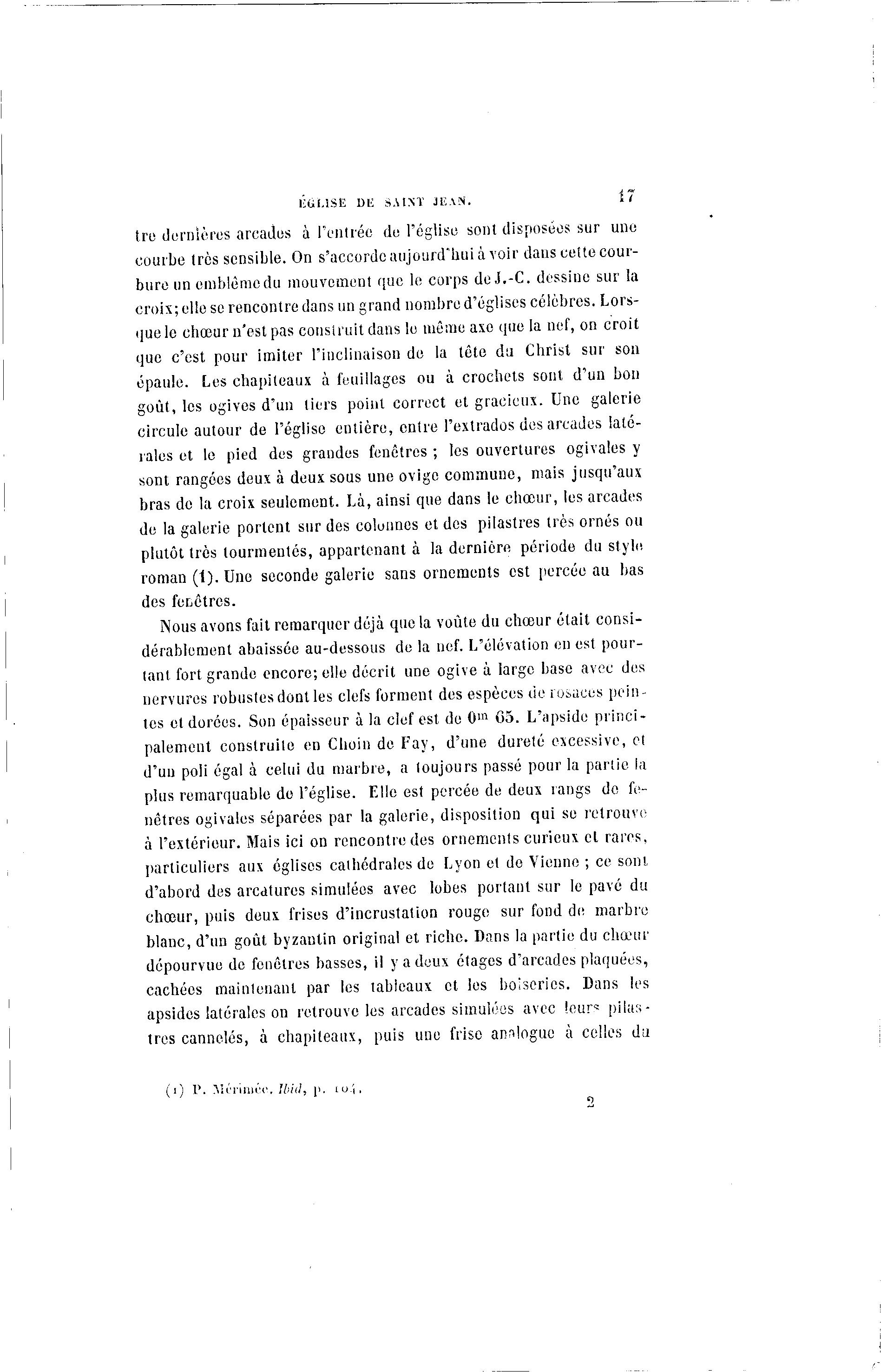 ÛGI.1SE DlC SAINT Jli.vN. 17 tre dernières arcades à l'entrée de l'église sont disposées sur une courbe très sensible. On s'accorde aujourd'hui à voir dans cette cour- bure un emblème du mouvement que le corps de J.-C. dessine sur la croix; elle se rencontre dans un grand nombre d'églises célèbres. Lors- que le chœur n'est pas construit dans le même axe que la nef, on croit que c'est pour imiter l'inclinaison de la tête du Christ sur son épaule. Les chapiteaux à feuillages ou à crochets sont d'un bon goût, les ogives d'un tiers point correct et gracieux. Une galerie circule autour de l'église entière, entre l'extrados des arcades laté- rales et le pied des grandes fenêtres ; les ouvertures ogivales y sont rangées deux à deux sous une ovige commune, mais jusqu'aux bras do la croix seulement. Là , ainsi que dans le chœur, les arcades de la galerie portent sur des colonnes et des pilastres très ornés ou plutôt très tourmentés, appartenant à la dernière période du style roman (1). Une seconde galerie sans ornements est percée au bas des fenêtres. Nous avons fait remarquer déjà que la voûte du chœur était consi- dérablement abaissée au-dessous de la nef. L'élévation en est pour- tant fort grande encore; elle décrit une ogive à largo base avec des nervures robustes dont les clefs forment des espèces de rosaces pein- tes et dorées. Son épaisseur à la clef est de 0 m G5. L'apside princi- palement construite en Choin de Fay, d'une dureté excessive, et d'un poli égal à celui du marbre, a loujours passé pour la partie la plus remarquable de l'église. Elle est percée de deux rangs de fe- nêtres ogivales séparées par la galerie, disposition qui se retrouve à l'extérieur. Mais ici on rencontre des ornements curieux cl rares, particuliers aux églises cathédrales de Lyon et de Vienne ; ce sont, d'abord des arcatures simulées avec lobes portant sur le pavé du chœur, puis deux frises d'incrustation rouge sur fond de marbre blanc, d'un goût byzantin original et riche. Dans la partie du chœur dépourvue de fenêtres basses, il y a deux étages d'arcades plaquées, cachées maintenant par les tableaux et les boiseries. Dans les apsides latérales on retrouve les arcades simulées avec leur5 pilas- tres cannelés, à chapiteaux, puis une frise analogue à celles du ( i ) P . MiTiimV. Ibul, p. lu.',,