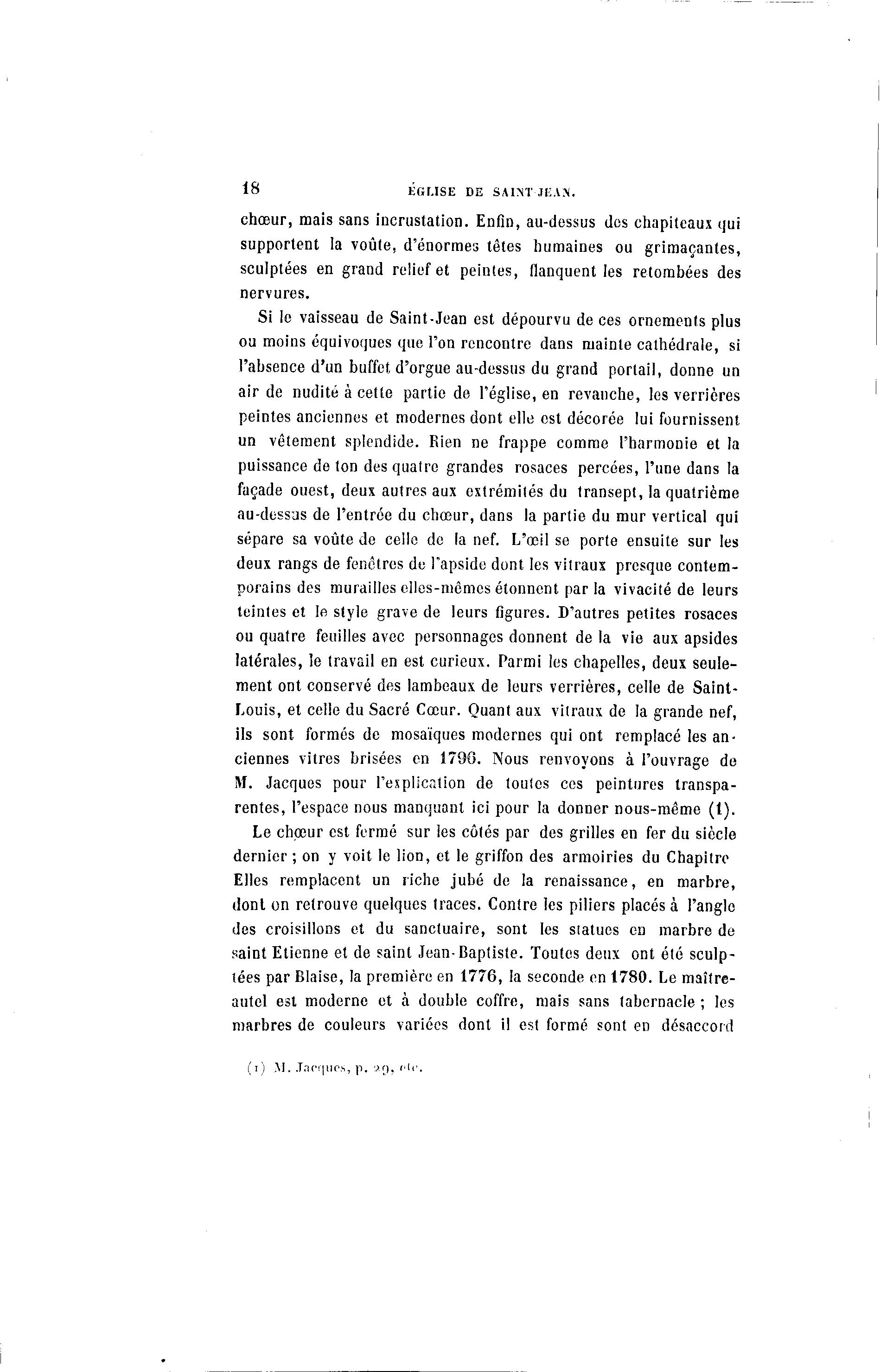 18 ÉGLISE DE SAINT-JEAN. chœur, mais sans incrustation. Enfin, au-dessus des chapiteaux qui supportent la voûte, d'énormes têtes humaines ou grimaçantes, sculptées en grand relief et peintes, flanquent les retombées des nervures. Si le vaisseau de Saint-Jean est dépourvu de ces ornements plus ou moins équivoques que l'on rencontre dans mainte cathédrale, si l'absence d'un buffet d'orgue au-dessus du grand portail, donne un air de nudité à cette partie de l'église, en revanche, les verrières peintes anciennes et modernes dont elle est décorée lui fournissent un vêtement splendide. Rien ne frappe comme l'harmonie et la puissance de ton des quatre grandes rosaces percées, l'une dans la façade ouest, deux autres aux extrémités du transept, la quatrième au-dessus de l'entrée du chœur, dans la partie du mur vertical qui sépare sa voûte de celle do la nef. L'œil se porte ensuite sur les deux rangs de fenêtres de l'apside dont les vitraux presque contem- porains des murailles elles-mêmes étonnent par la vivacité de leurs teintes et le style grave de leurs figures. D'autres petites rosaces ou quatre feuilles avec personnages donnent de la vie aux apsides latérales, le travail en est curieux. Parmi les chapelles, deux seule- ment ont conservé des lambeaux de leurs verrières, celle de Saint- Louis, et celle du Sacré Cœur. Quant aux vitraux de la grande nef, ils sont formés de mosaïques modernes qui ont remplacé les an- ciennes vitres brisées en 1796. Nous renvoyons à l'ouvrage de M. Jacques pour l'explication de toutes ces peintures transpa- rentes, l'espace nous manquant ici pour la donner nous-même (1). Le chœur est fermé sur les côtés par des grilles en fer du siècle dernier; on y voit le lion, et le griffon des armoiries du Chapitre Elles remplacent un riche jubé de la renaissance, en marbre, dont on retrouve quelques traces. Contre les piliers placés à l'angle des croisillons et du sanctuaire, sont les siatues en marbre de saint Etienne et de saint Jean-Baptiste. Toutes deux ont été sculp- tées par Biaise, la première en 1776, la seconde en 1780. Le maître- autel est moderne et à double coffre, mais sans tabernacle ; les marbres de couleurs variées dont il est formé sont en désaccord (i) M . . T a f f | i i r . s , p . •>',). ' ' ! < ' .