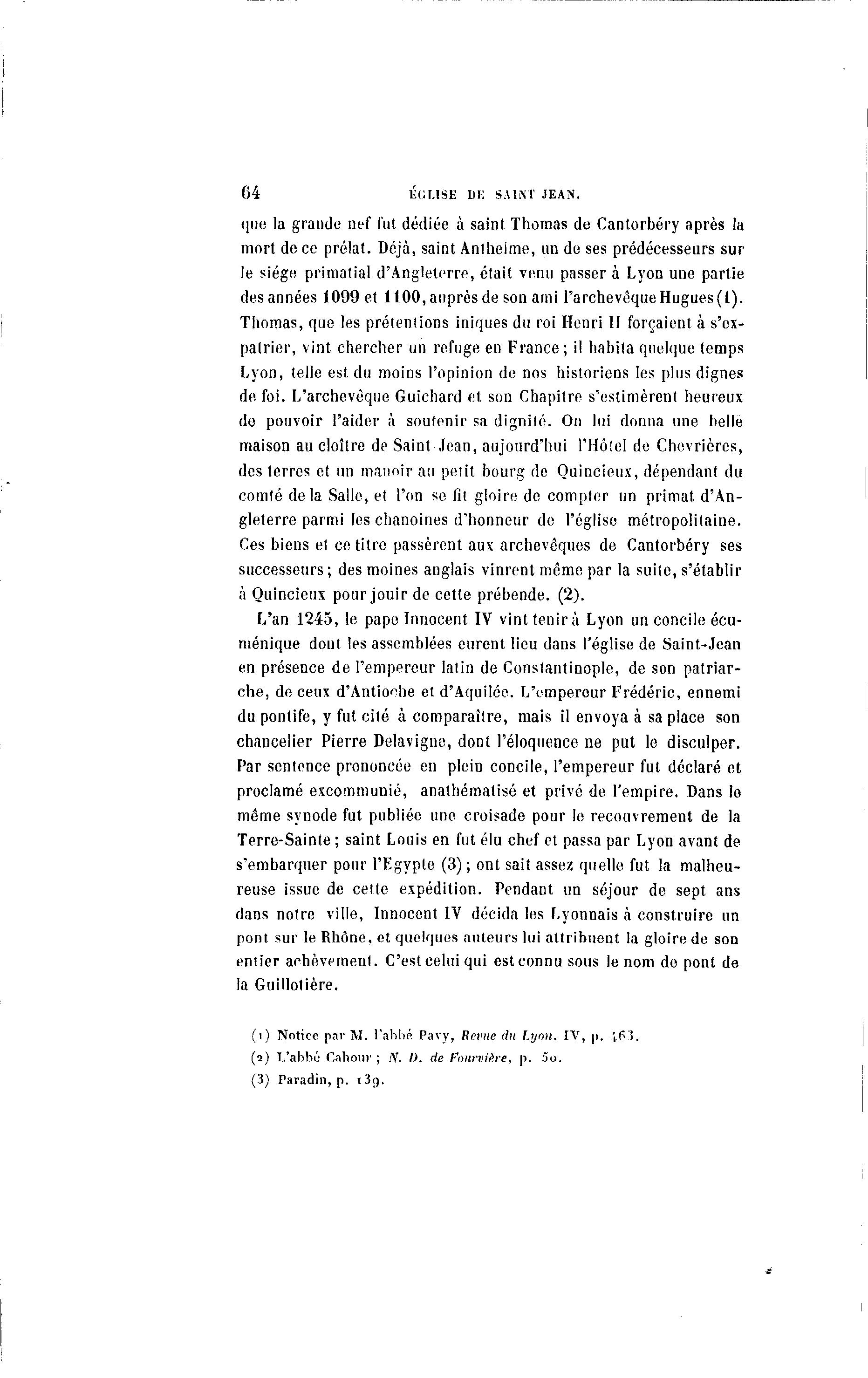 64 ÉCLISE DK SAINT JEAN. «jiie la grande nef fut dédiée à saint Thomas de Cantorbéry après la mort de ce prélat. Déjà , saint Antheime, un de ses prédécesseurs sur le siège primatial d'Angleterre, était venu passer à Lyon une partie des années 1099 et 1100, auprès de son ami l'archevêque Hugues (l). Thomas, que les prétentions iniques du roi Henri II forçaient à s'ex- patrier, vint chercher un refuge en France; il habita quelque temps Lyon, telle est du moins l'opinion de nos historiens les plus dignes de. foi. L'archevêque Guichard et, son Chapitre s'estimèrent heureux de pouvoir l'aider à soutenir sa dignité. On lui donna une belle maison au cloître de Saint Jean, aujourd'hui l'Hôtel de Chevrières, des terres et un manoir au petit bourg de Ouincieux, dépendant du comté delà Salle, et l'on se fit gloire de compter un primat d'An- gleterre parmi les chanoines d'honneur de l'église métropolitaine. Ces biens et ce titre passèrent aux archevêques de Cantorbéry ses successeurs ; des moines anglais vinrent même par la suite, s'établir à Ouincieux pour jouir de cette prébende. (2). L'an 1245, le pape Innocent IV vint tenir à Lyon un concile écu- ménique dont les assemblées eurent lieu dans l'église de Saint-Jean en présence de l'empereur latin de Constantinople, de son patriar- che, de ceux d'Antiodie et d'Aquilée. L'empereur Frédéric, ennemi du pontife, y fut cité à comparaître, mais il envoya à sa place son chancelier Pierre Delavigne, dont l'éloquence ne put le disculper. Par sentence prononcée en plein concile, l'empereur fut déclaré et proclamé excommunié, anathématisé et privé de l'empire. Dans le même synode fut publiée une croisade pour le recouvrement de la Terre-Sainte ; saint Louis en fut élu chef et passa par Lyon avant de s'embarquer pour l'Egypte (3) ; ont sait assez quelle fut la malheu- reuse issue de cette expédition. Pendant un séjour de sept ans dans notre ville, Innocent IV décida les Lyonnais à construire un pont sur le Rhône, et quelques auteurs lui attribuent la gloire de son entier achèvement. C'est celui qui est connu sous le nom de pont de la Guillotière. ( i ) Notice par M. l'abbé Pavy, Revue du Lyon. I V , |i. i C i . (2) L'abbû Cahoui' ; iV. I). de Fourvière, p. 5o. (3) Paradin, p . 139.