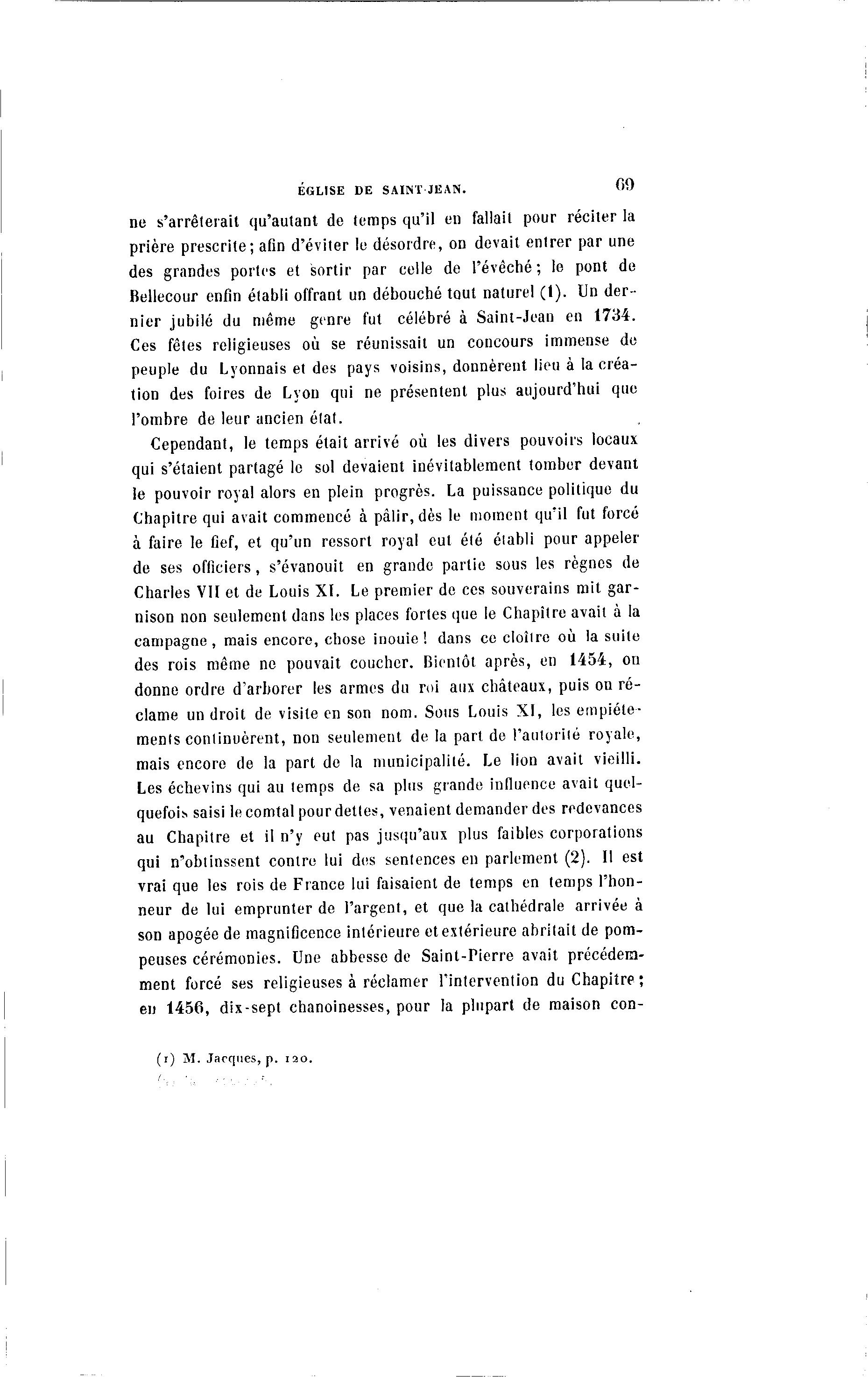 ÉGLISE DE SAINT JEAN. (59 ne s'arrêterait qu'autant de temps qu'il en fallait pour réciter la prière prescrite; afin d'éviter le désordre, on devait entrer par une des grandes portes et sortir par eelle de l'évêché ; le pont de Bellecour enfin établi offrant un débouché tout naturel (1). Un der- nier jubilé du même genre fut célébré à Saint-Jean en 1734. Ces fêtes religieuses où se réunissait un concours immense de peuple du Lyonnais et des pays voisins, donnèrent lieu à la créa- tion des foires de Lyon qui ne présentent plus aujourd'hui que l'ombre de leur ancien état. Cependant, le temps était arrivé où les divers pouvoirs locaux qui s'étaient partagé le sol devaient inévitablement tomber devant le pouvoir royal alors en plein progrès. La puissance politique du Chapitre qui avait commencé à pâlir, dès le moment qu'il fut forcé à faire le fief, et qu'un ressort royal eut été établi pour appeler de ses officiers, s'évanouit en grande partie sous les règnes de Charles VII et de Louis XI. Le premier de ces souverains mit gar- nison non seulement dans les places fortes que le Chapitre avait à la campagne , mais encore, chose inouie ! dans ce cloîlre où la suite des rois même ne pouvait coucher. Bientôt après, en 1454, on donne ordre d'arborer les armes du roi aux châteaux, puis on ré- clame un droit de visite en son nom. Sous Louis XI, les empiéte- ments continuèrent, non seulement de la part de l'autorilé royale, mais encore de la part de la municipalité. Le lion avait vieilli. Les échevins qui au temps de sa plus grande influence avait quel- quefois saisi lecomtal pour dettes, venaient demander des redevances au Chapitre et il n'y eut pas jusqu'aux plus faibles corporations qui n'obtinssent contre lui dus sentences en parlement (2). Il est vrai que les rois de France lui faisaient de temps en temps l'hon- neur de lui emprunter de l'argent, et que la cathédrale arrivée à son apogée de magnificence intérieure et extérieure abritait de pom- peuses cérémonies. Une abbesso de Saint-Pierre avait précédem- ment forcé ses religieuses à réclamer l'intervention du Chapitre; en 1456, dix-sept chanoinesses, pour la plupart de maison con- (r) M. Jacques, p . 120.