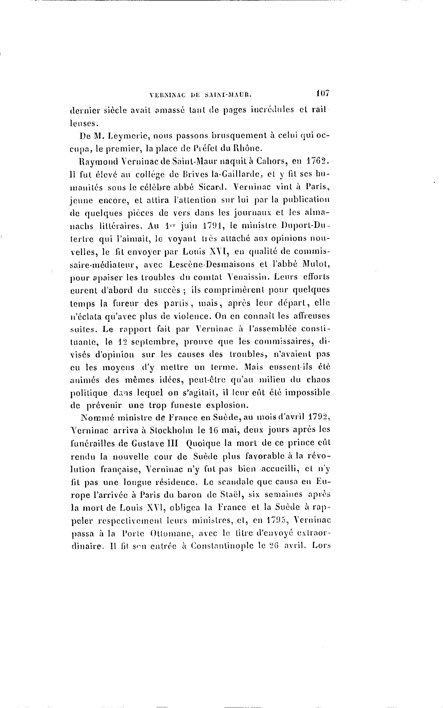 VlilSMNAC DE SAl.M'-MAUR. 107 dernier siècle avait amassé tant de pages incrédules eL rail letises. De M. Leymerie, nous passons brusquement à celui qui oc- cupa, le premier, la place de Préfet du Rhône. Raymond Verninacde Sainl-Maur naquit à Caliors, en 1762. 11 fut élevé au collège de Brivcs la-Gaillarde, et y fil ses hu- manités sous le célèbre abbé Sicard. Veruinac vint à Paris, jeune encore, et attira l'attention sur lui par la publication de quelques pièces de vers dans les journaux et les alina- nachs littéraires. Au 1" juin 1791, le ministre Duporl-Dii- terlre qui l'aimait, le voyant très attaché aux opinions nou- velles, le fit envoyer par Louis XYI, en qualité de commis- saire-médiateur, avec Lescène-Desmaisons et l'abbé Mulot, pour apaiser les troubles du comtat Yenaissin. Leurs efforts eurent d'abord du succès ; ils comprimèrent pour quelques temps la fureur des p a r t i s , mais, après leur d é p a r t , elle n'éclata qu'avec plus de violence. On en connaît les affreuses suites. Le rapport fait par Verninac à l'assemblée consti- tuante, le 12 septembre, prouve que les commissaires, di- visés d'opinion sur les causes des troubles, n'avaient pas eu les moyens d'y mettre un terme. Mais eussent ils été. animés des mêmes idées, peut-être qu'au milieu du chaos politique da?is lequel on s'agitait, il leur eût été impossible de prévenir une trop funeste explosion. Nommé ministre de France en Suède, au mois d'avril 1792, Verninac arriva à Stockholm le 16 mai, deux jours après les funérailles de Gustave III Quoique la morl de ce prince eût rendu la nouvelle cour de Suède plus favorable à la révo- lution française, Verninac n'y fut pas bien accueilli, cl n'y fil pas une longue résidence. Le scandale que causa en Eu- rope l'arrivée à Paris du baron de Staël, six semaines après la mort de Louis XY1, obligea la France el la Suède à rap- peler respectivement leurs ministres, et, en 1795, Verninac passa à la Porte Ottomane, avec le titre d'envoyé extraor- dinaire. Il fil SfMi entrée à Constanlinople le 26 avril. Lors