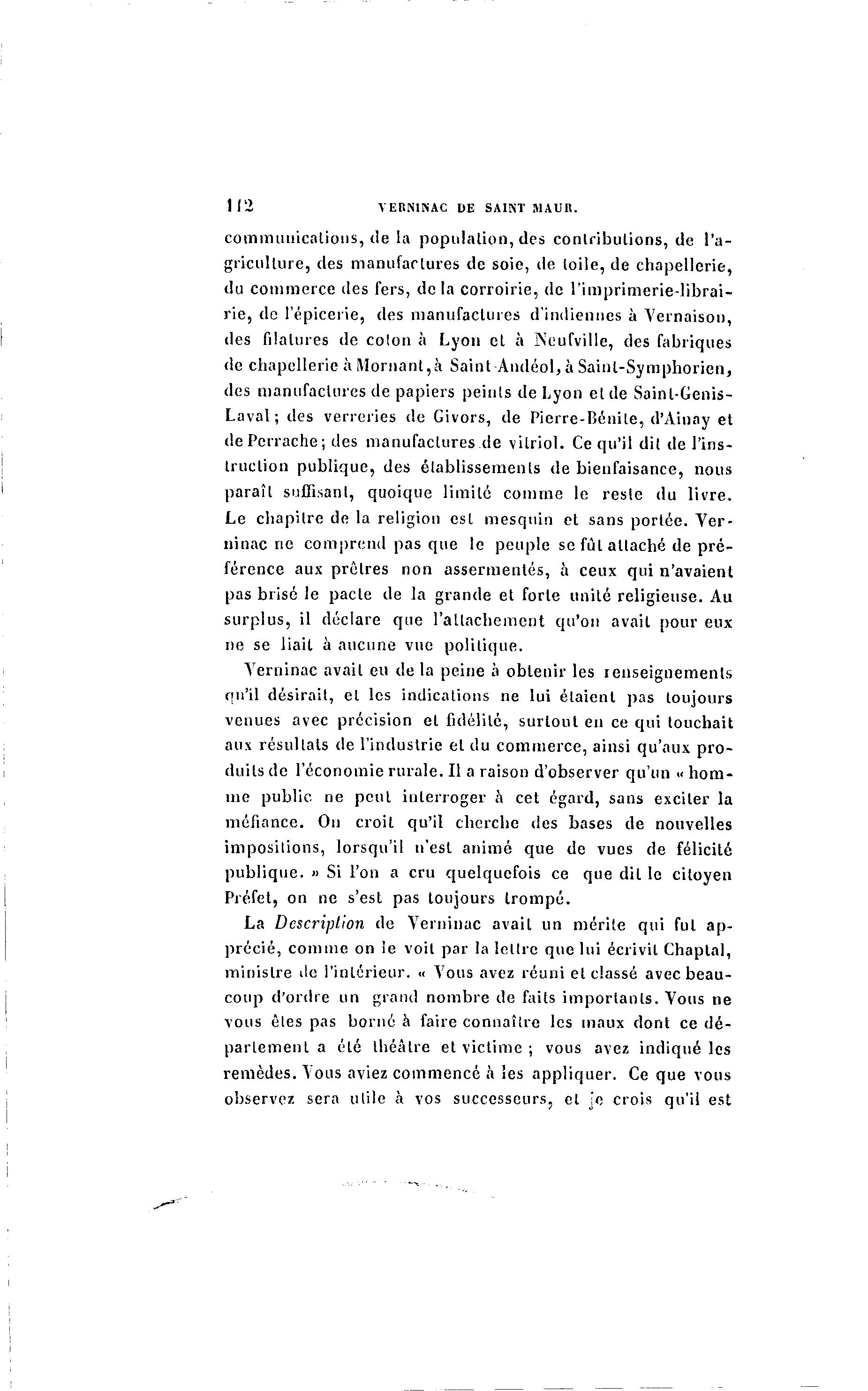 112 YERNINAC DE SAINT MAUR. communications, de la population, des contributions, de l'a- griculture, des manufactures de soie, île toile, de chapellerie, du commerce des fers, de la corroirie, de l'imprimerie-librai- rie, de l'épicerie, des manufactures d'indiennes à Yernaison, des filatures de colon à Lyon el à Ncufville, des fabriques de chapellerie à Montant,à Saint Andéol, à Sainl-Symphorien, des manufactures de papiers peints de Lyon el de Sainl-Genis- Laval; des verreries de Givors, de Pierre-Bénile, d'Ainay et dePerrache; des manufaclures.de vitriol. Ce qu'il dit de l'ins- truction publique, des établissements de bienfaisance, nous paraît suffisant, quoique limité comme le reste du livre. Le chapitre de la religion est mesquin et sans portée. Ver- ninac ne comprend pas que le peuple se fût attaché de p r é - férence aux prêtres non assermentés, à ceux qui n'avaient pas brisé le pacte de la grande et forte unité religieuse. Au surplus, il déclare que l'attachement qu'on avait pour eux ne se liait à aucune vue politique. Yerninac avait eu de la peine à obtenir les renseignements qu'il désirait, et les indications ne lui étaient pas toujours venues avec précision et fidélité, surtout en ce qui touchait aux résultats de l'industrie el du commerce, ainsi qu'aux p r o - duits de l'économie rurale. Il a raison d'observer qu'un « h o m - me public ne peut interroger à cet égard, sans exciter la méfiance. On croit qu'il cherche des bases de nouvelles impositions, lorsqu'il n'est animé que de vues de félicité publique. » Si l'on a cru quelquefois ce que dit le citoyen Préfet, on ne s'est pas toujours trompé. La Description de Yerninac avait un mérite qui fut ap- précié, comme on le voit par la lettre que lui écrivit Chaplal, ministre de l'intérieur. « Vous avez réuni el classé avec beau- coup d'ordre un grand nombre de faits importants. Vous ne vous êtes pas borné à faire connaître les maux dont ce dé- parlement a élé théâtre et victime ; vous avez indiqué les remèdes. Vous aviez commencé a les appliquer. Ce que vous observez sera utile à vos successeurs, el je crois qu'il est