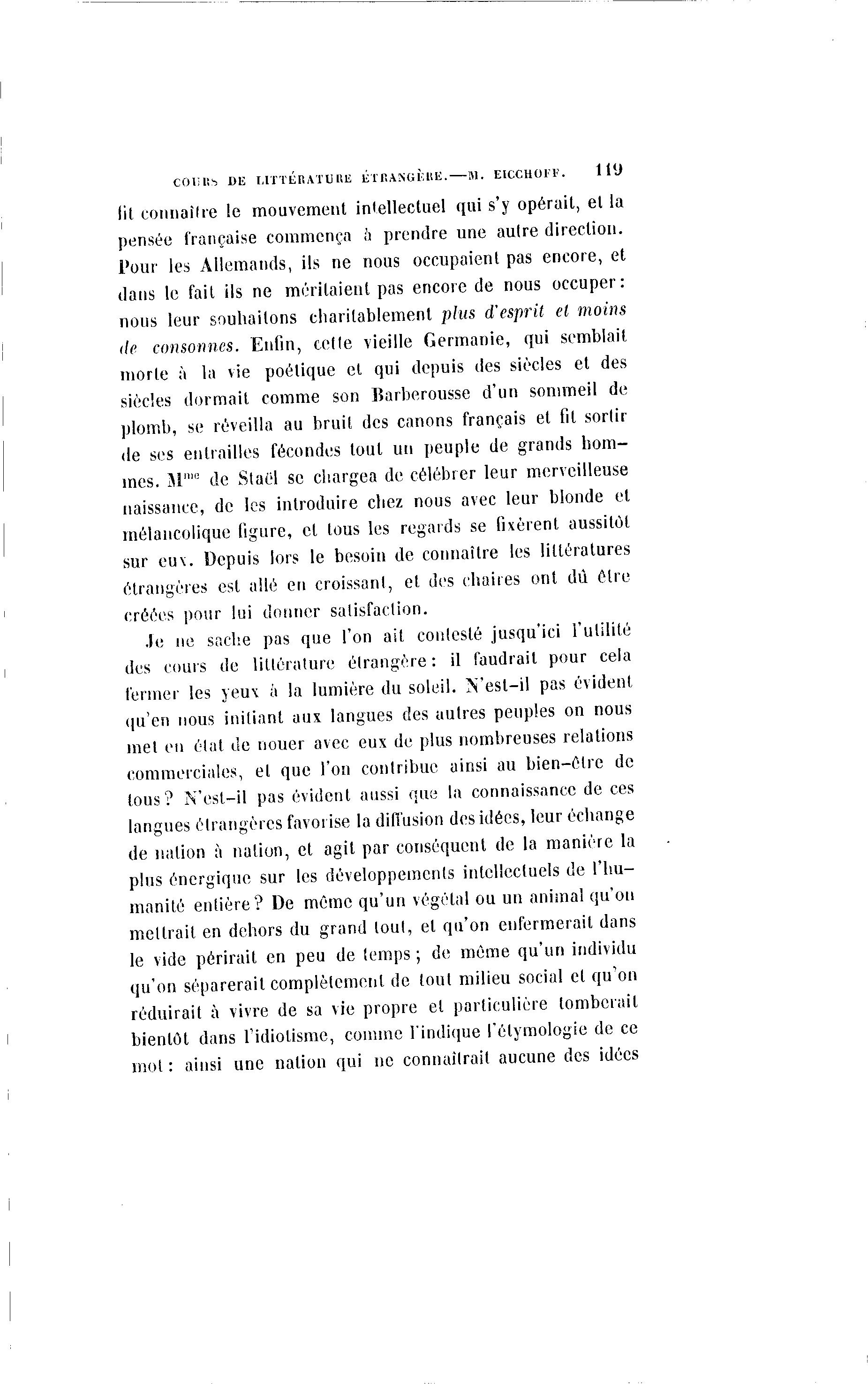 COLRb DE LITTÉRATURE ÉTRANGÈRE. M. EICCHOl'F. 1 1*J lit connaître le mouvement intellectuel qui s'y opérait, el la pensée française commença h prendre une autre direction. Pour les Allemands, ils ne nous occupaient pas encore, et dans le fait ils ne méritaient pas encore de nous occuper: nous leur souhaitons charitablement plus d'esprit el moins de consonnes. Enfin, cette vieille Germanie, qui semblait morte à la vie poétique el qui depuis des siècles et des siècles dormait comme son Barberousse d'un sommeil de plomb, se réveilla au bruit des canons français et fil sortir de ses entrailles fécondes tout un peuple de grands hom- mes. M""! de Staél se chargea de célébrer leur merveilleuse naissance, de les introduire chez nous avec leur blonde et mélancolique figure, et tous les regards se fixèrent aussitôt sur eux. Depuis lors le besoin de connaître les littératures étrangères est allé en croissant, et des chaires ont dû être créées pour lui donner satisfaction. Je ne sache pas que l'on ait contesté jusqu'ici l'utilité des cours de littérature étrangère : il faudrait pour cela fermer les yeu\ à la lumière du soleil. jVest-il pas évident qu'en nous initiant aux langues des autres peuples on nous met en état de nouer avec eux de plus nombreuses relations commerciales, el que l'on contribue ainsi au bien-élrc de tous? N'est-il pas évident aussi que la connaissance de ces langues étrangères favorise la diffusion des idées, leur échange de nation à nulion, et agit par conséquent de la manière la plus énergique sur les développements intellectuels de l'hu- manité entière? De même qu'un végétal ou un animal qu'on mettrait en dehors du grand tout, el qu'on enfermerait dans le vide périrait en peu de temps ; de même qu'un individu qu'on séparerait complètement de tout milieu social cl qu'on réduirait à vivre de sa vie propre el particulière tomberait bientôt dans l'idiotisme, comme l'indique félymologie de ce mot : ainsi une nation qui ne connaîtrait aucune des idées